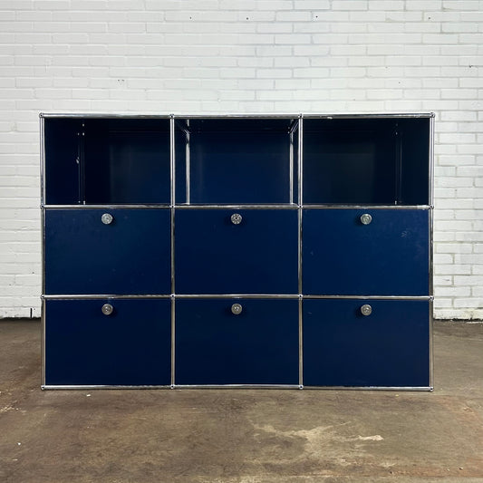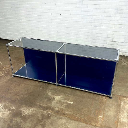 USM Haller lowboard / dressoir donkerblauw open met glazen blad
