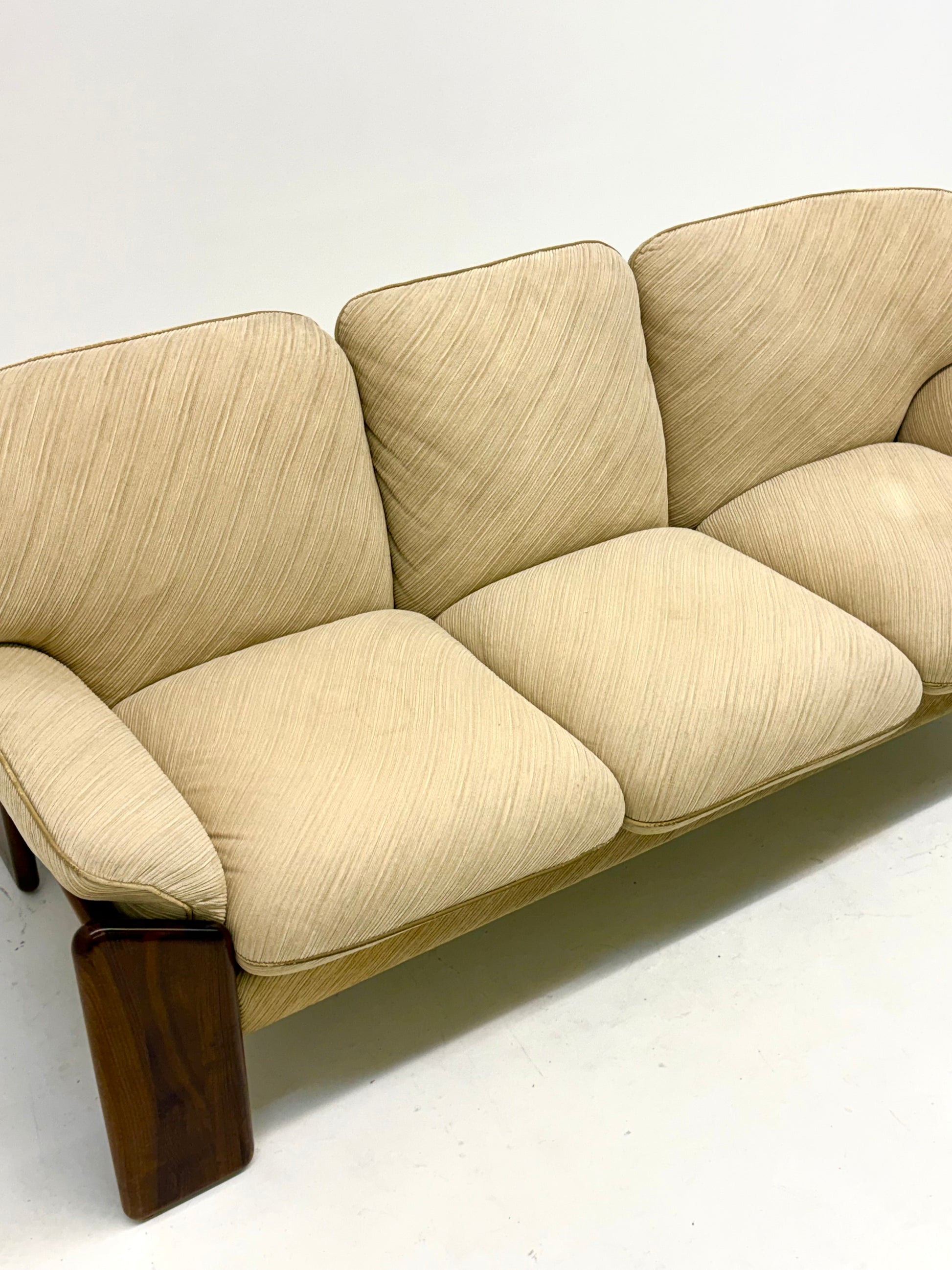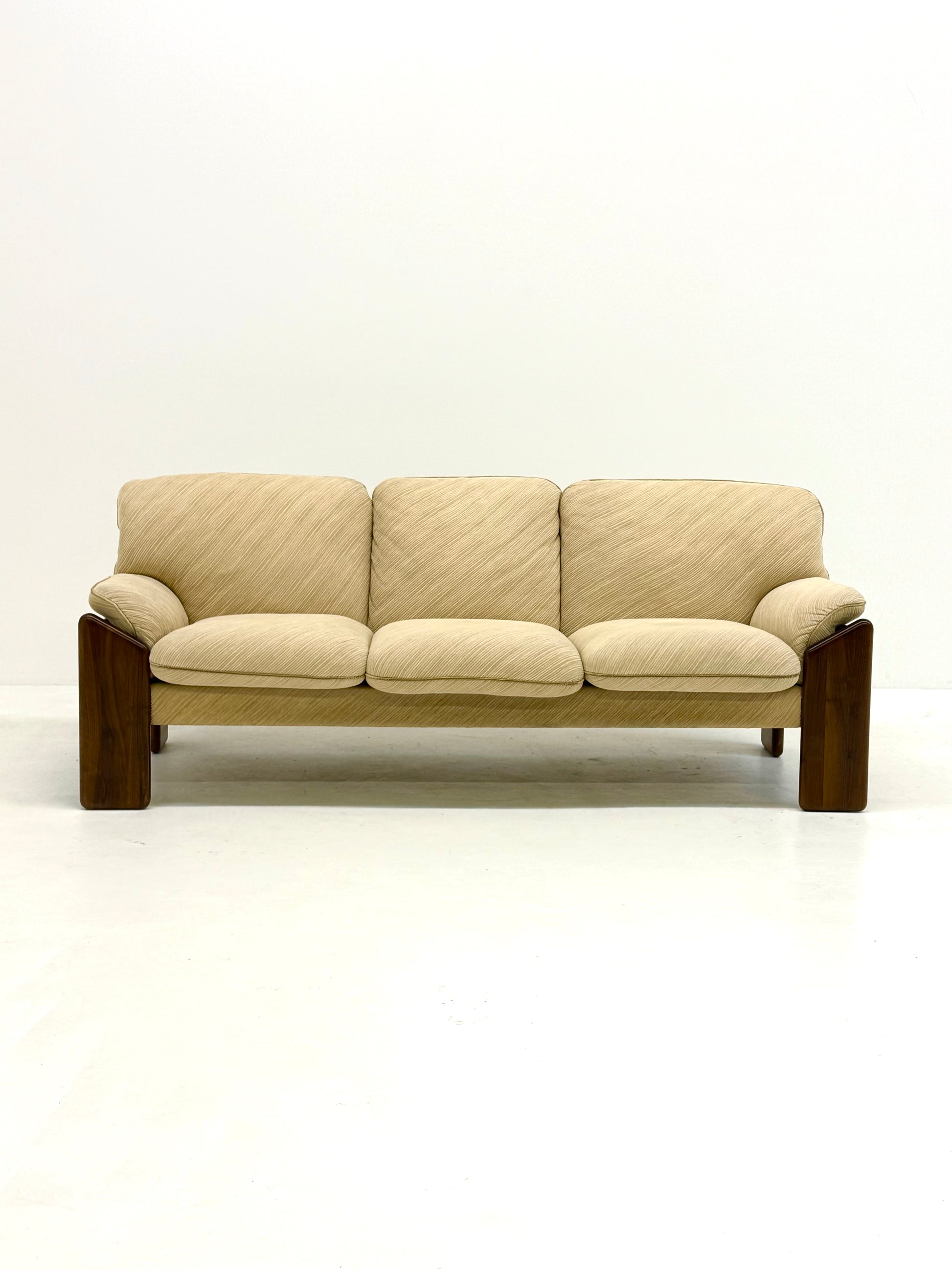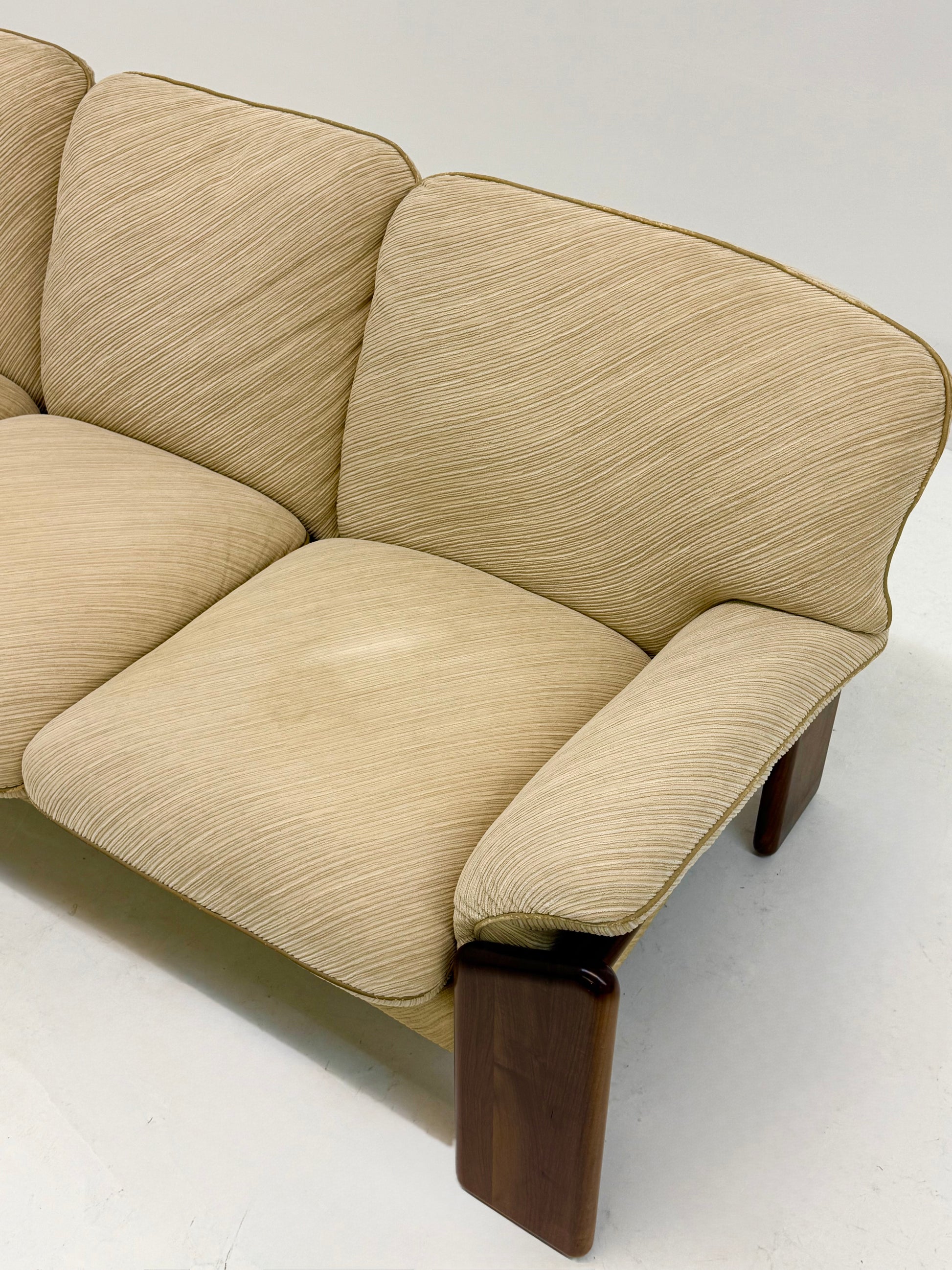 Deze uitvoering is voorzien van de originele lichte, zachte stof met een subtiele schuine ribstructuur, die de bank een verfijnde en tijdloze uitstraling geeft. Het walnotenhouten frame blijft zichtbaar aan de zijkanten en onder de zittingen, waar de bank ook gemerkt is, en benadrukt het vakmanschap van het ontwerp. Het hout vertoont enkele gebruikssporen en krasjes.