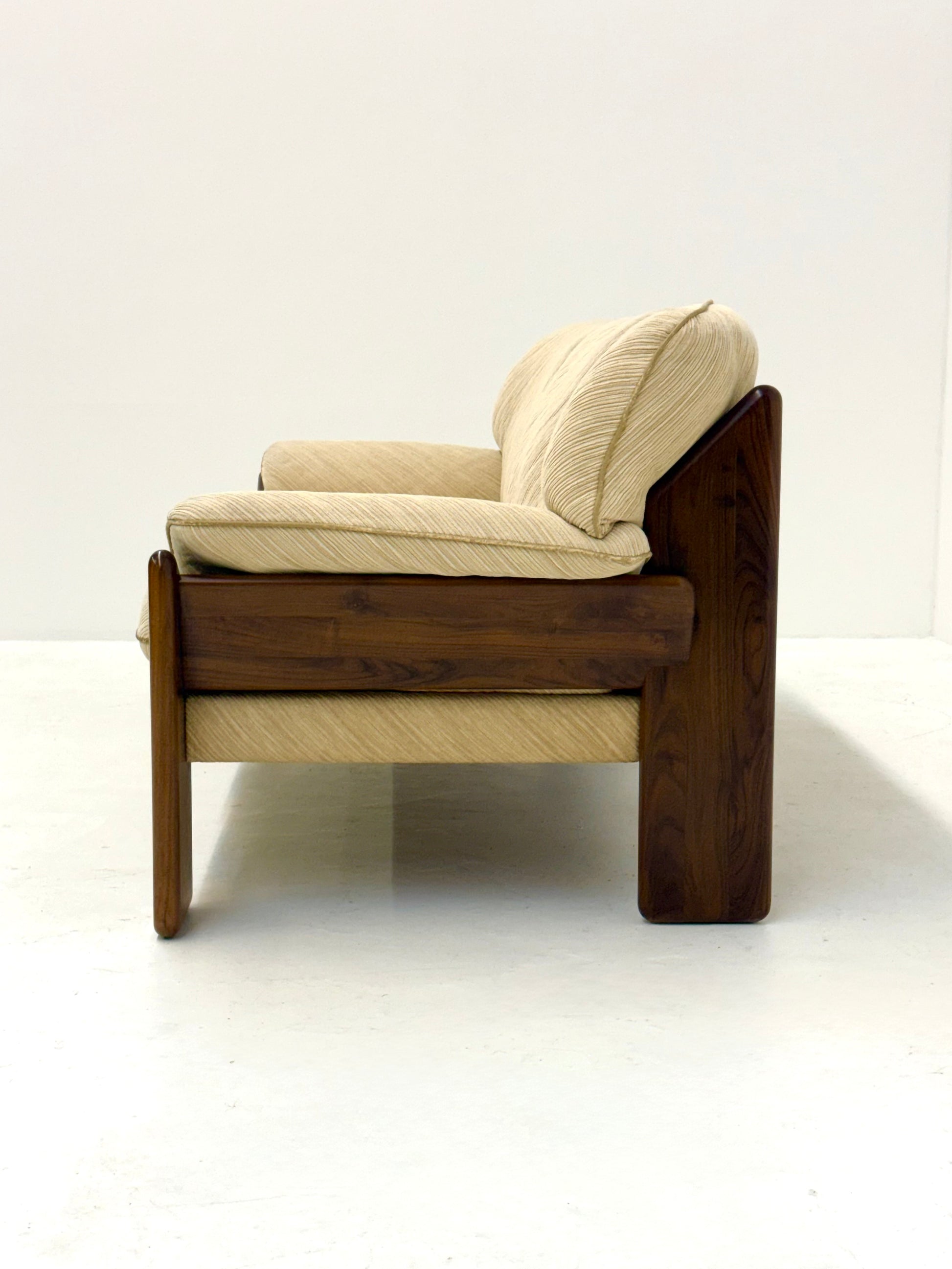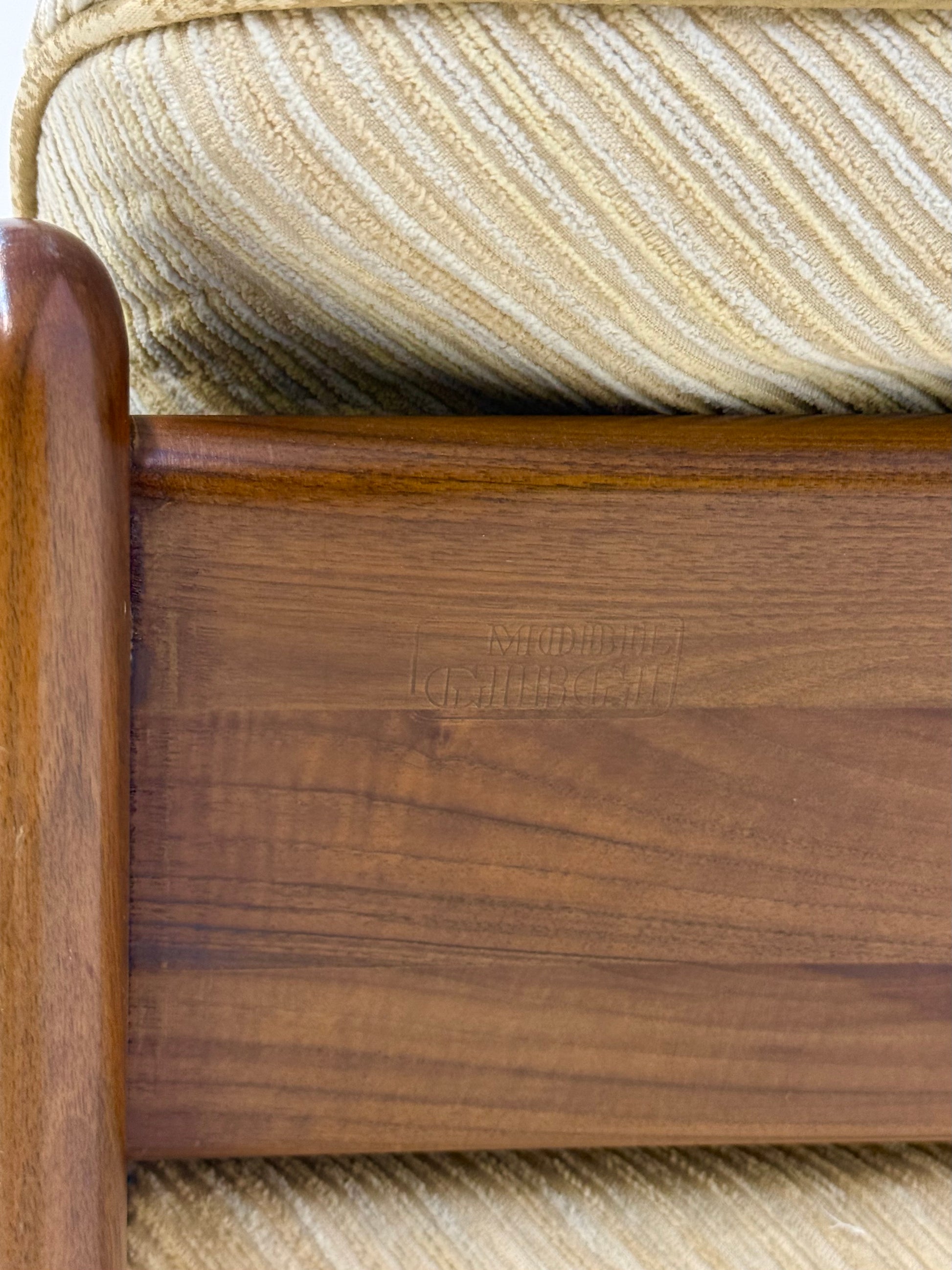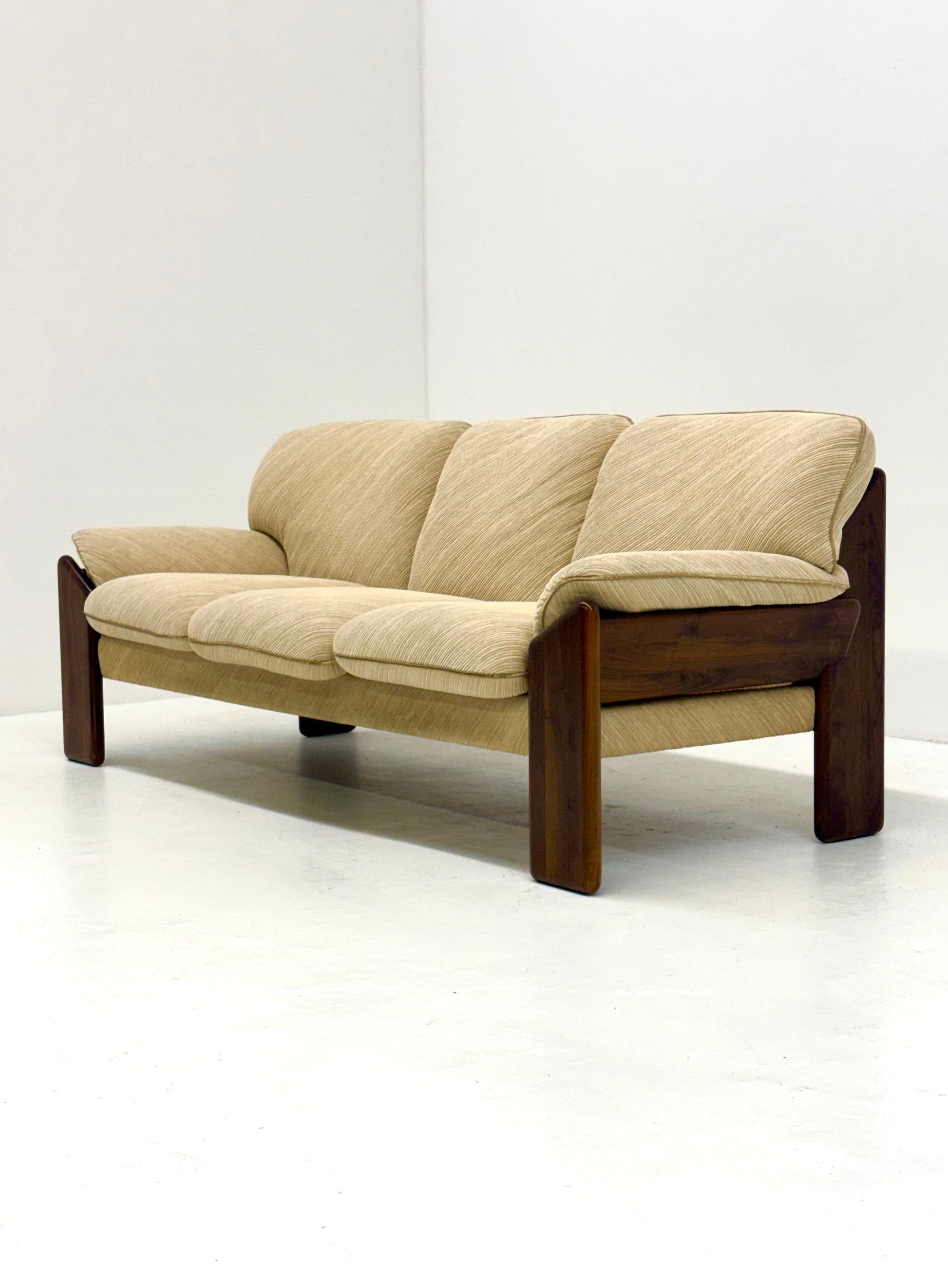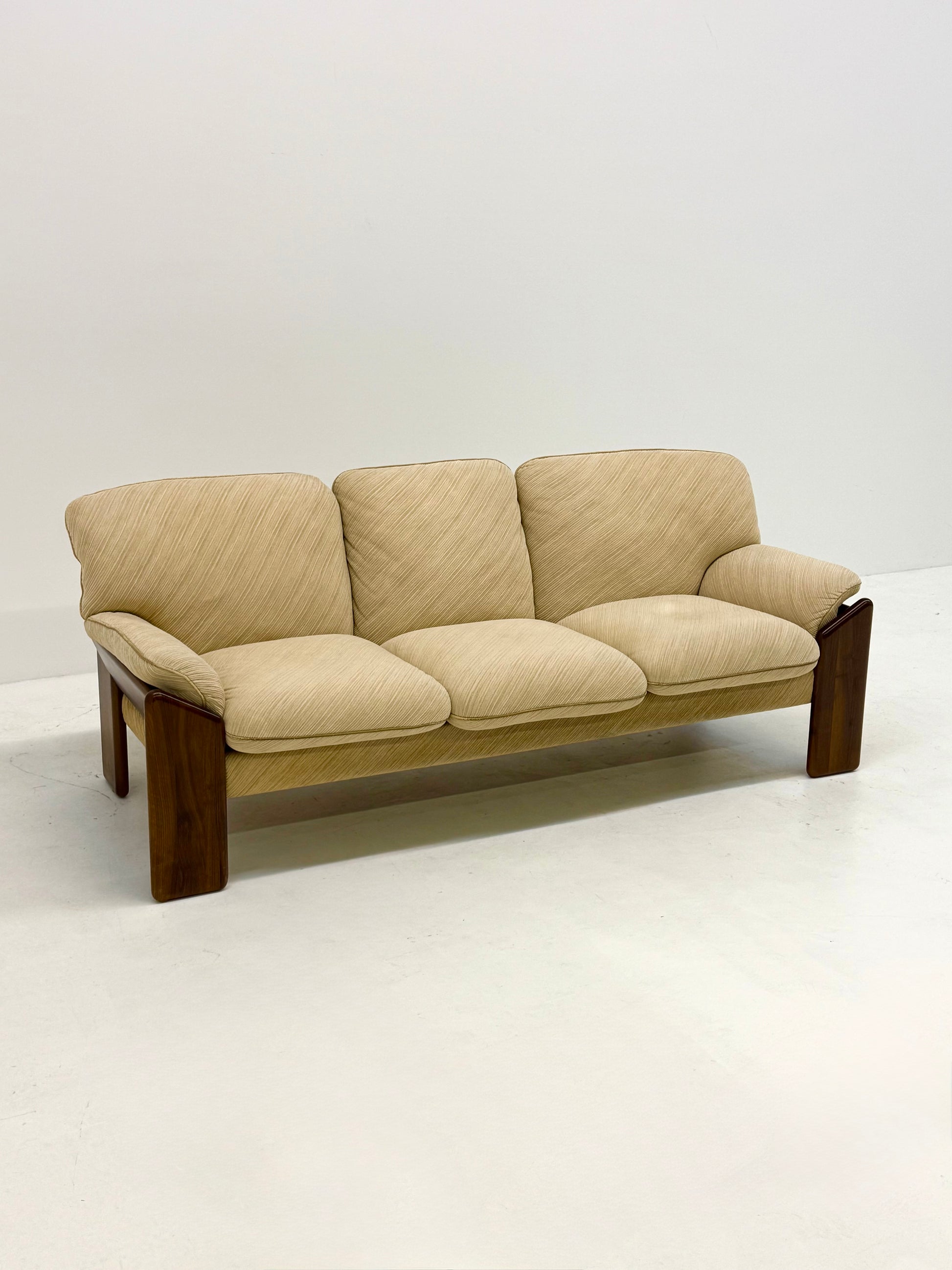 Deze uitvoering is voorzien van de originele lichte, zachte stof met een subtiele schuine ribstructuur, die de bank een verfijnde en tijdloze uitstraling geeft. Het walnotenhouten frame blijft zichtbaar aan de zijkanten en onder de zittingen, waar de bank ook gemerkt is, en benadrukt het vakmanschap van het ontwerp. Het hout vertoont enkele gebruikssporen en krasjes.