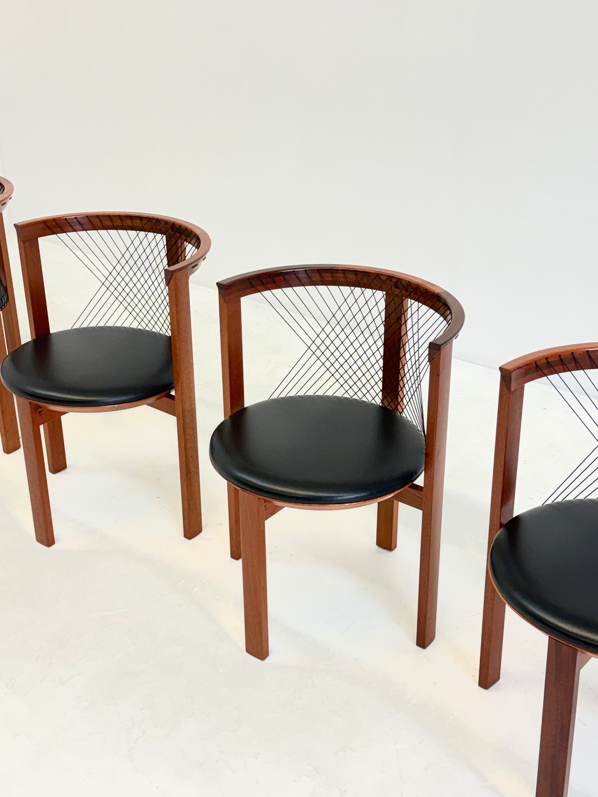 De stoelen hebben een houten frame met het karakteristieke rugleuningontwerp van strak gespannen touw, wat zorgt voor een luchtige, grafische uitstraling. De zittingen zijn bekleed met zwart leer.