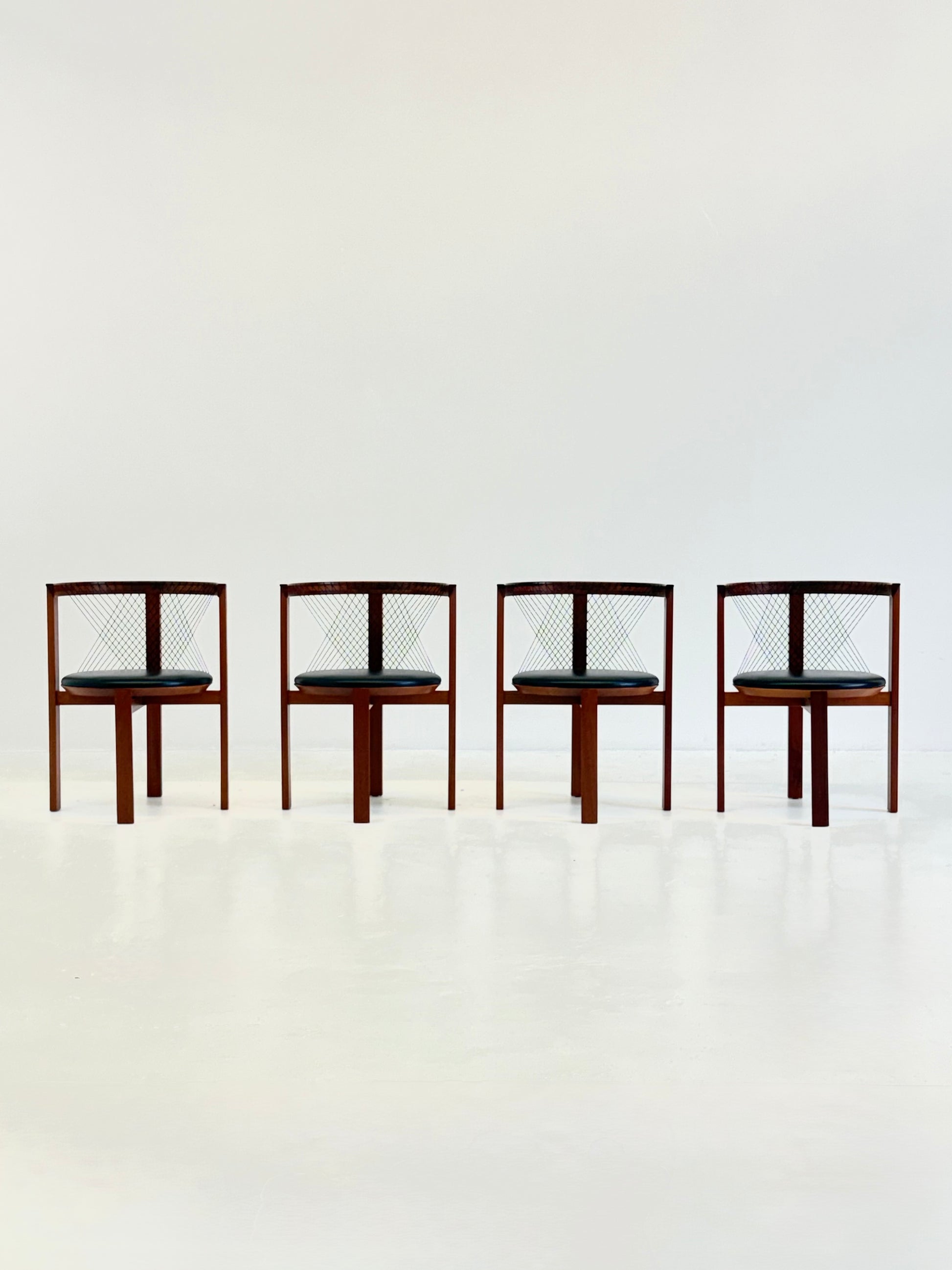 Prachtige set van 4 originele “String” eetkamerstoelen, ontworpen door Niels Jørgen Haugesen voor Tranekær Furniture (Denemarken). Dit iconische model uit de late jaren ’70 staat bekend om zijn minimalistische vormgeving en innovatieve materiaalgebruik.