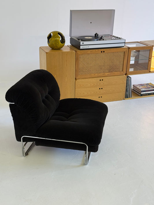 Italiaanse lounge fauteuils met zwarte ribstof en buisframe onderstel