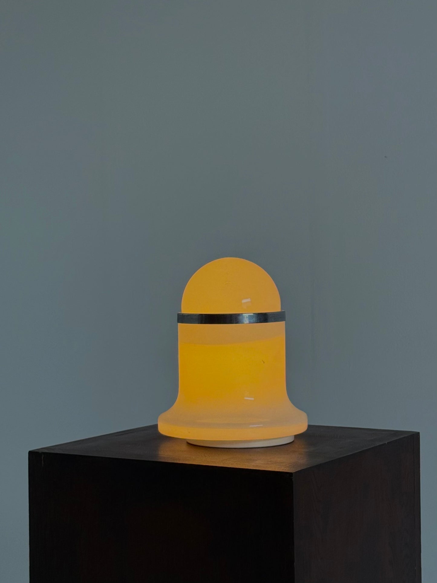 Het mondgeblazen glas straalt zacht, diffuus licht uit en zorgt voor een warme sfeer in elke ruimte. Een subtiele, maar elegante blikvanger — ideaal voor een dressoir, nachtkastje of als accentlamp in een designinterieur.