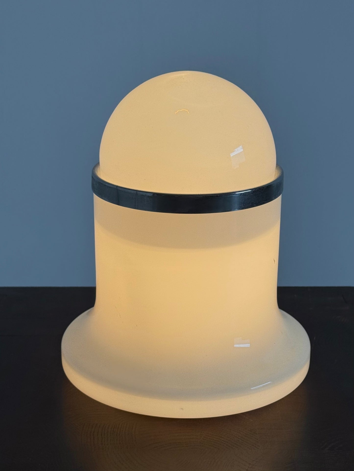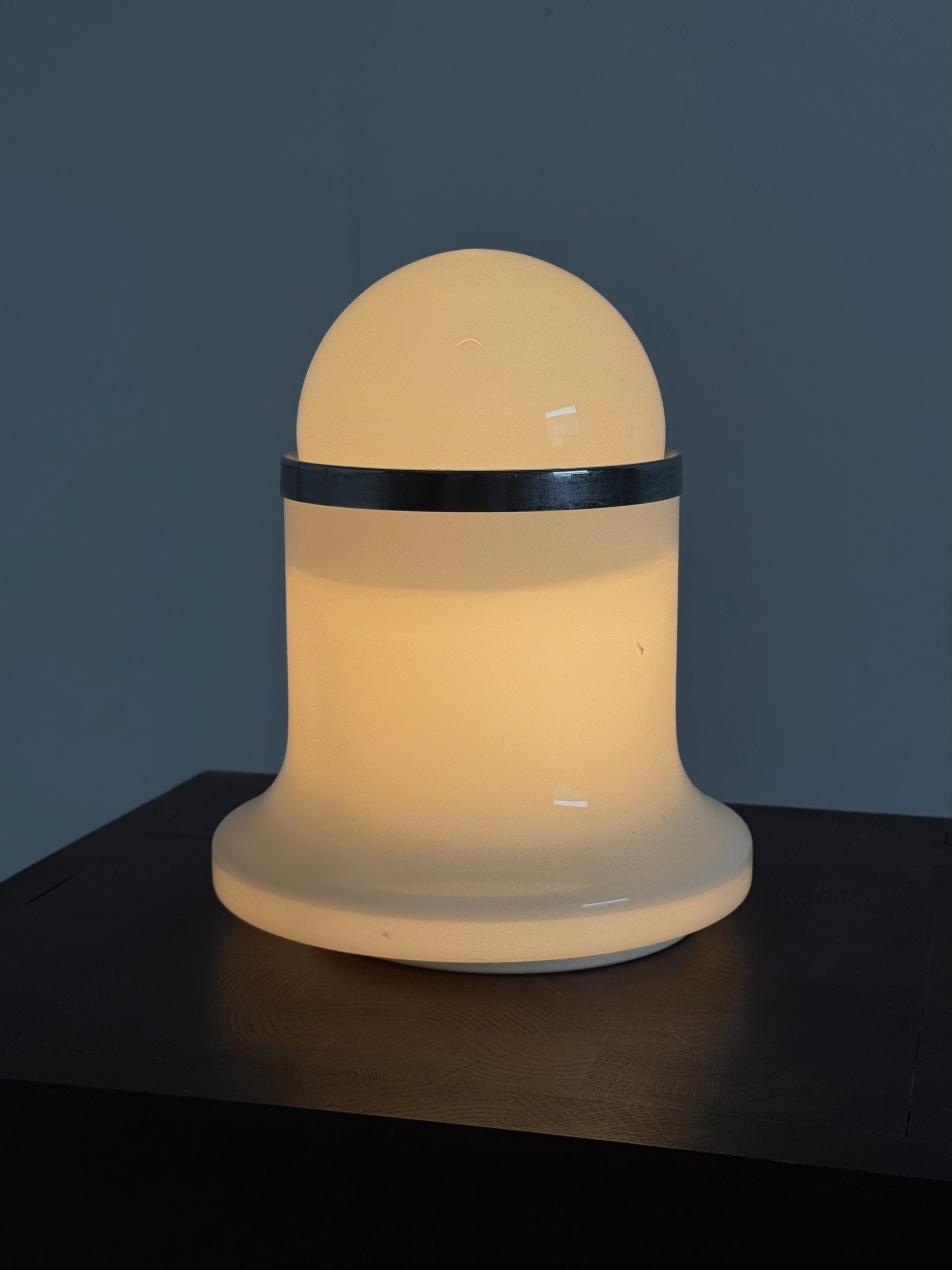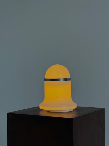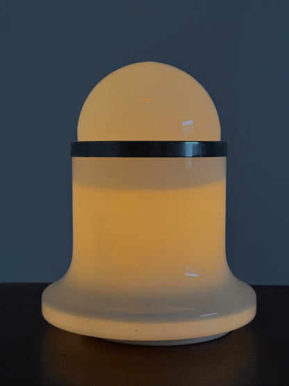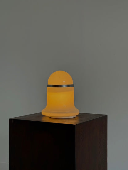 Murano tafellamp uit de jaren 70, ontworpen door het Italiaanse ontwerperscollectief De Martini, Falconi & Fois voor Architetti. De lamp is uitgevoerd in wit Murano glas en heeft een karakteristieke vorm die perfect past binnen de Space Age esthetiek van die tijd.