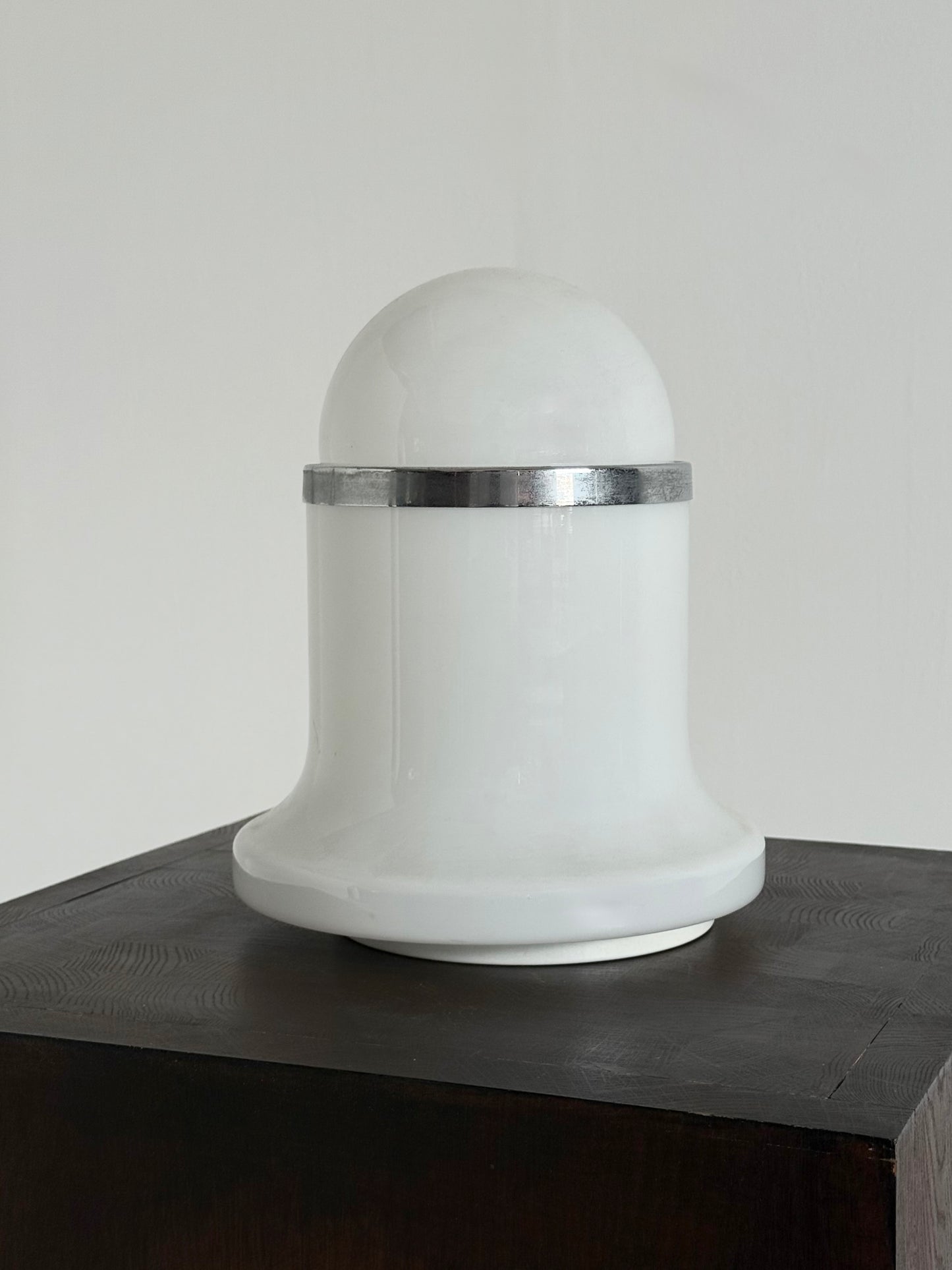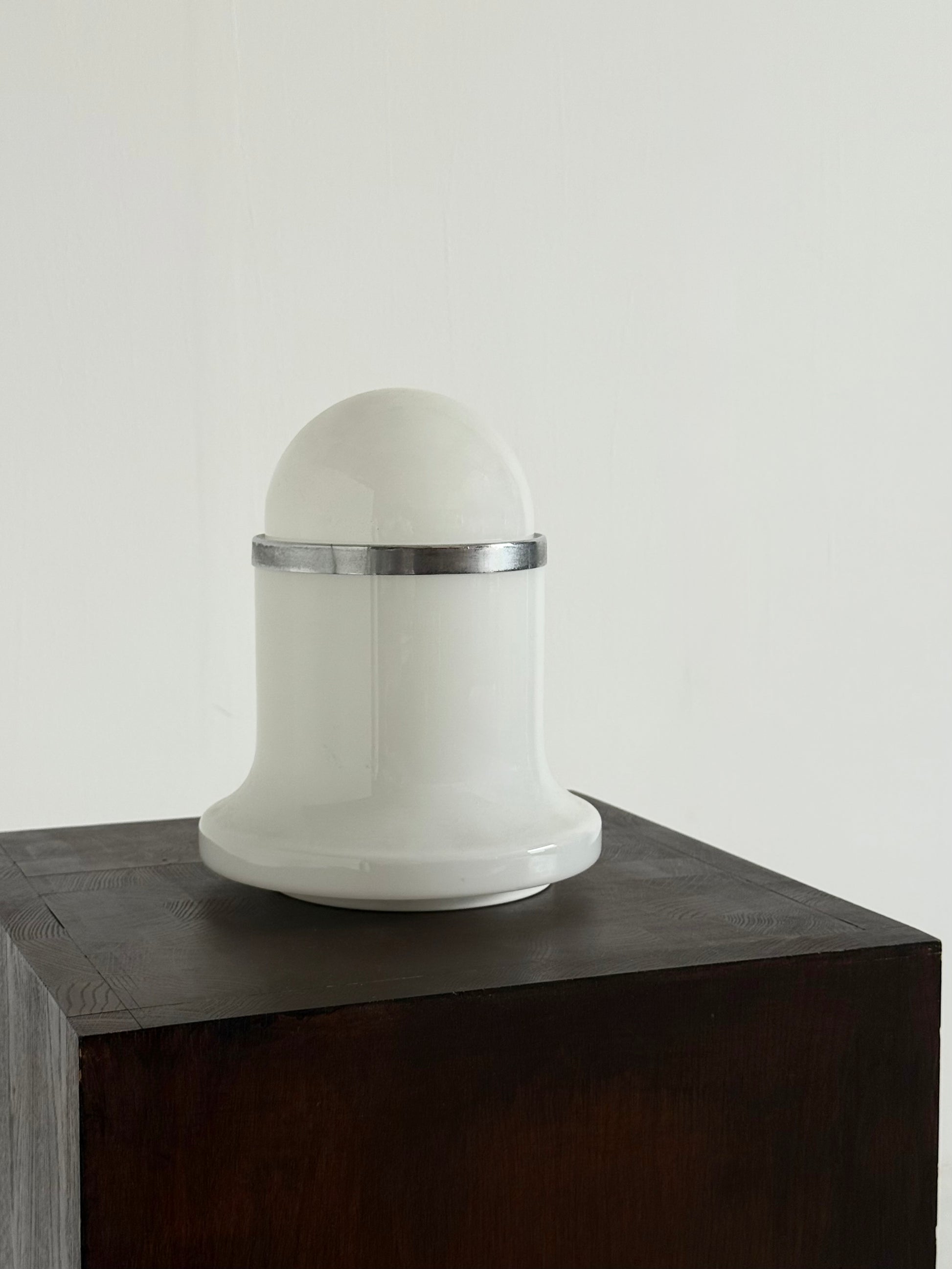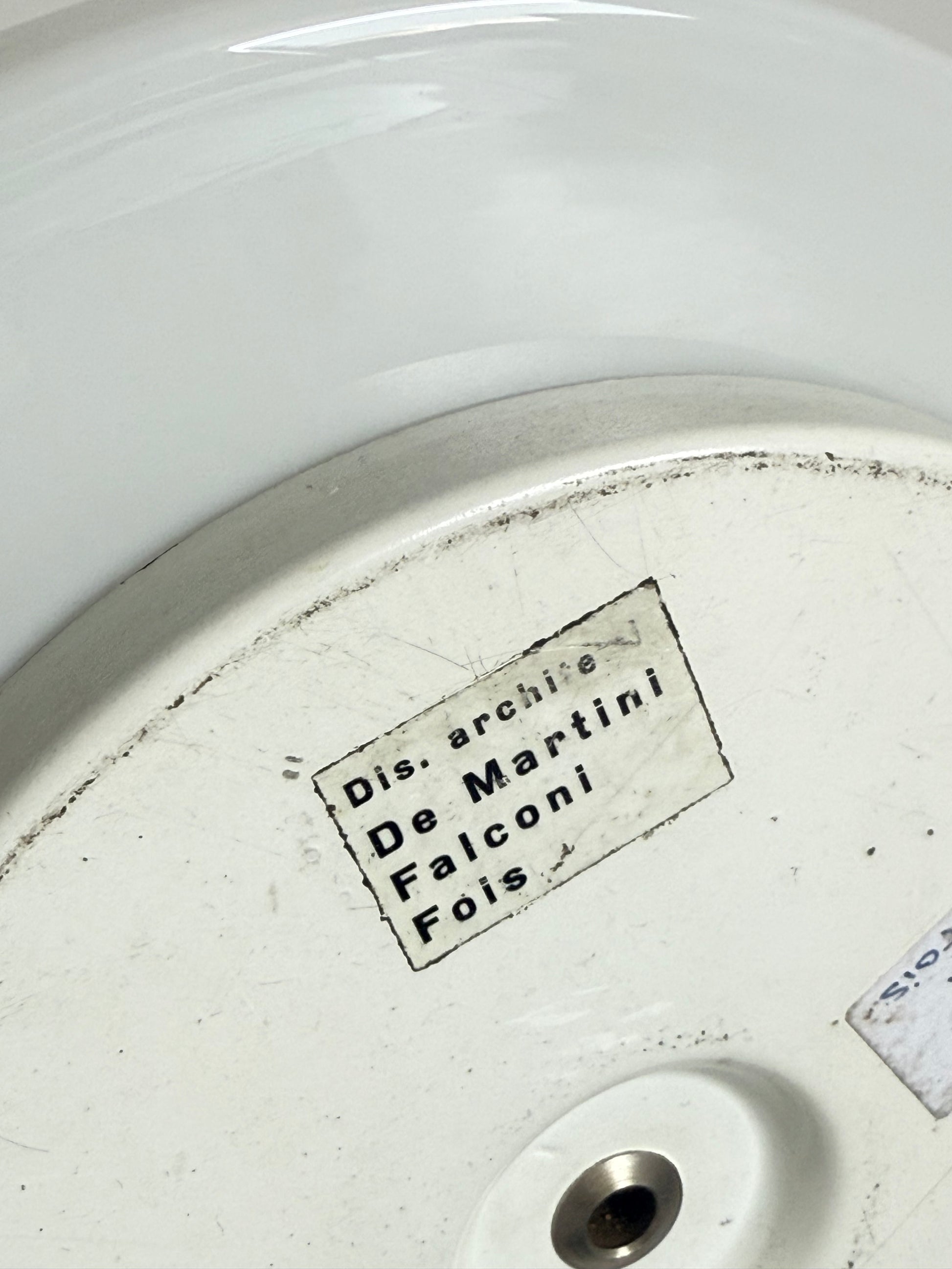 Murano tafellamp uit de jaren 70, ontworpen door het Italiaanse ontwerperscollectief De Martini, Falconi & Fois voor Architetti. De lamp is uitgevoerd in wit Murano glas en heeft een karakteristieke vorm die perfect past binnen de Space Age esthetiek van die tijd.