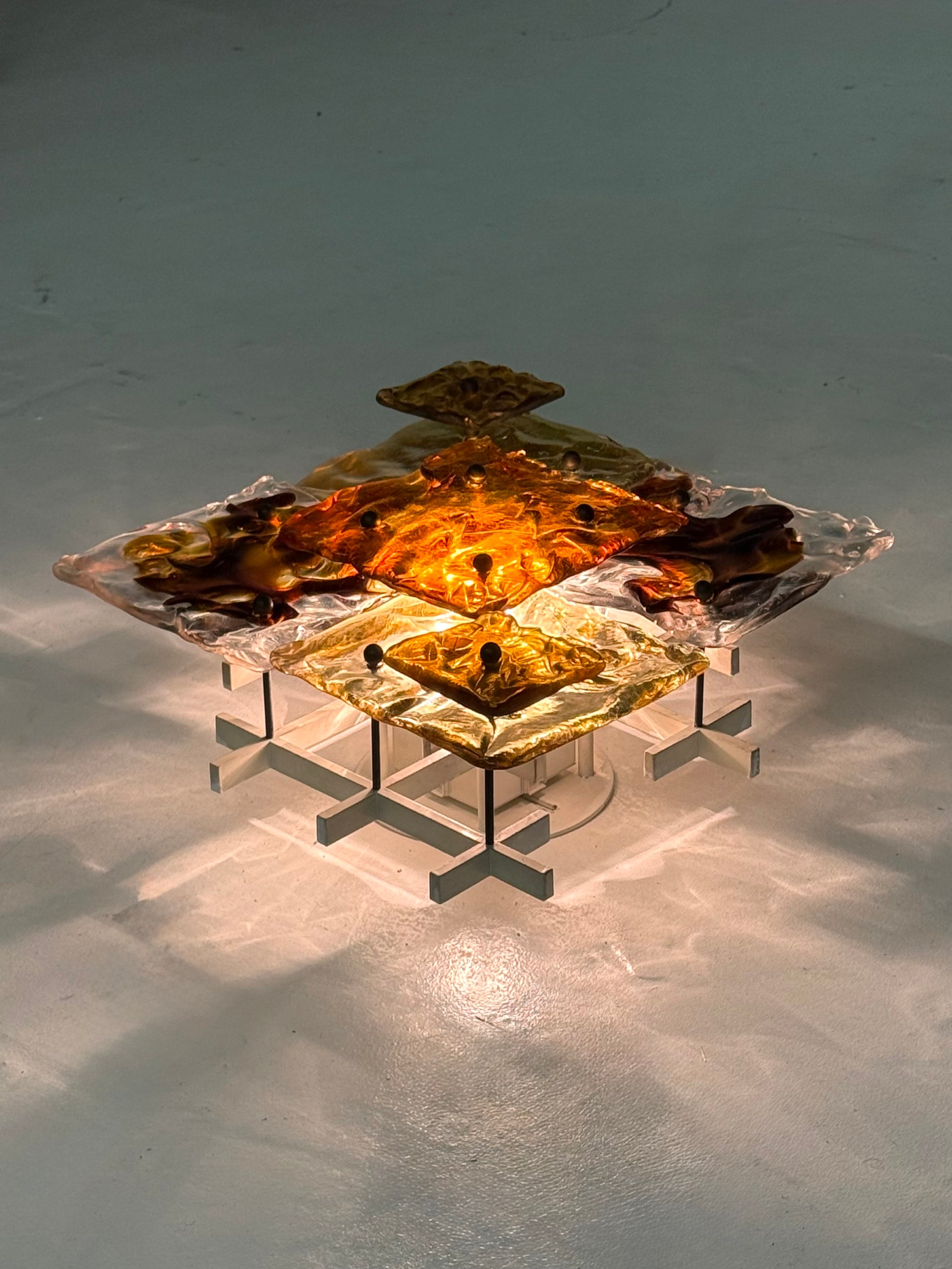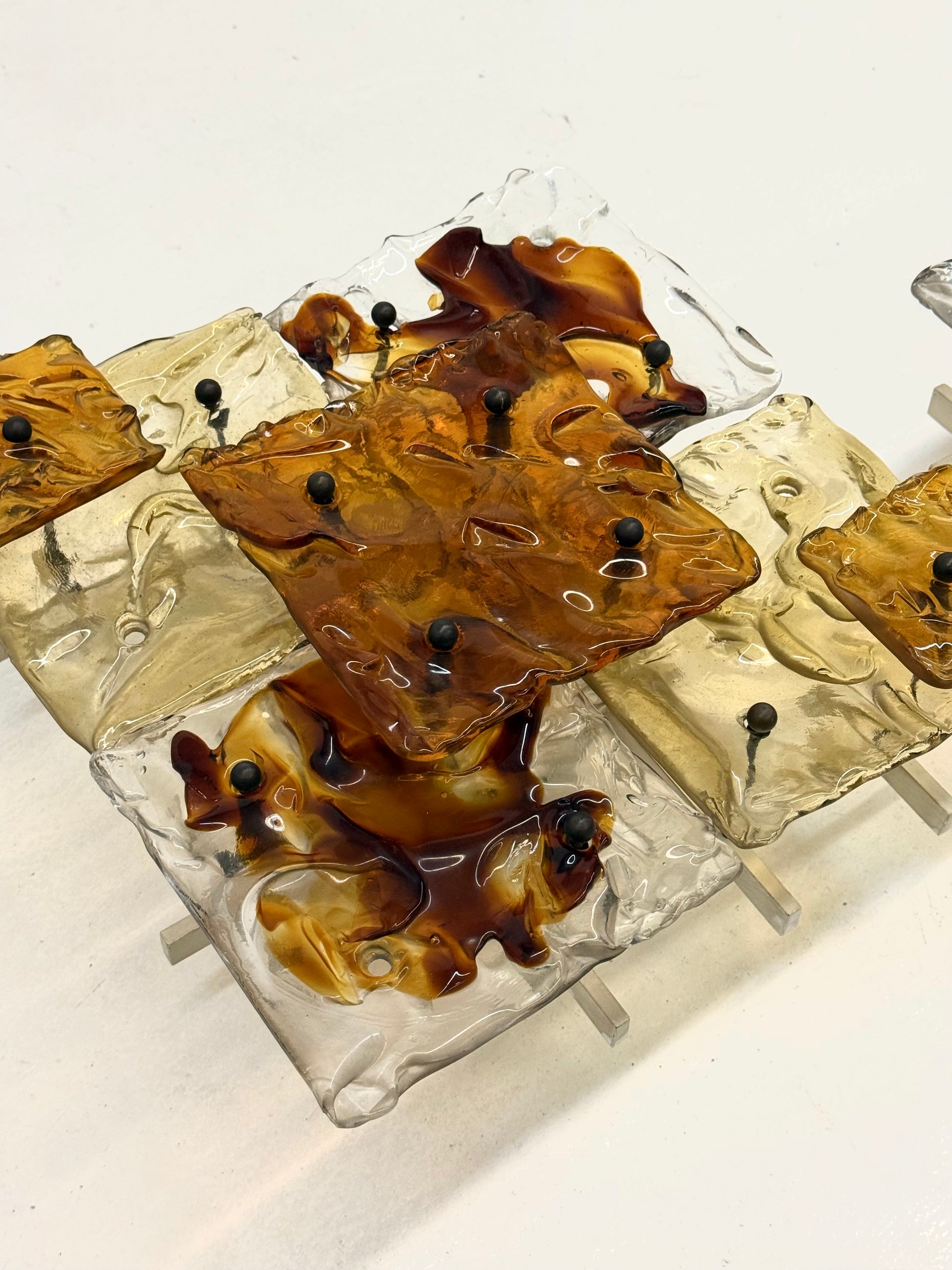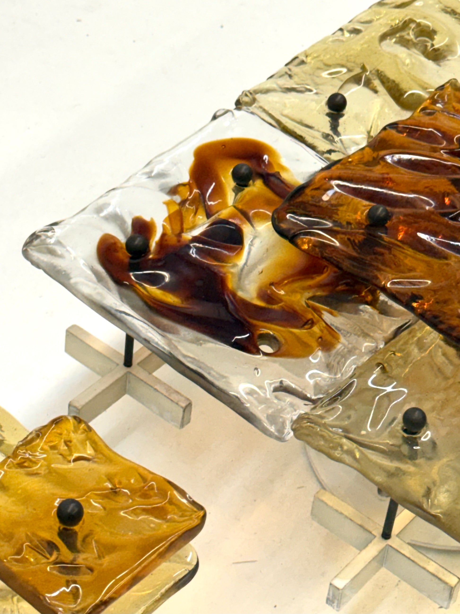 Het glas heeft een sculpturale, bijna organische uitstraling en vangt het licht op een unieke manier, waardoor de lamp niet alleen functioneel is maar ook als kunstobject aan de wand fungeert. Zuccheri’s ontwerp weerspiegelt zijn experimentele benadering van vorm en materiaal, waarbij ambacht en artistieke expressie samenkomen.