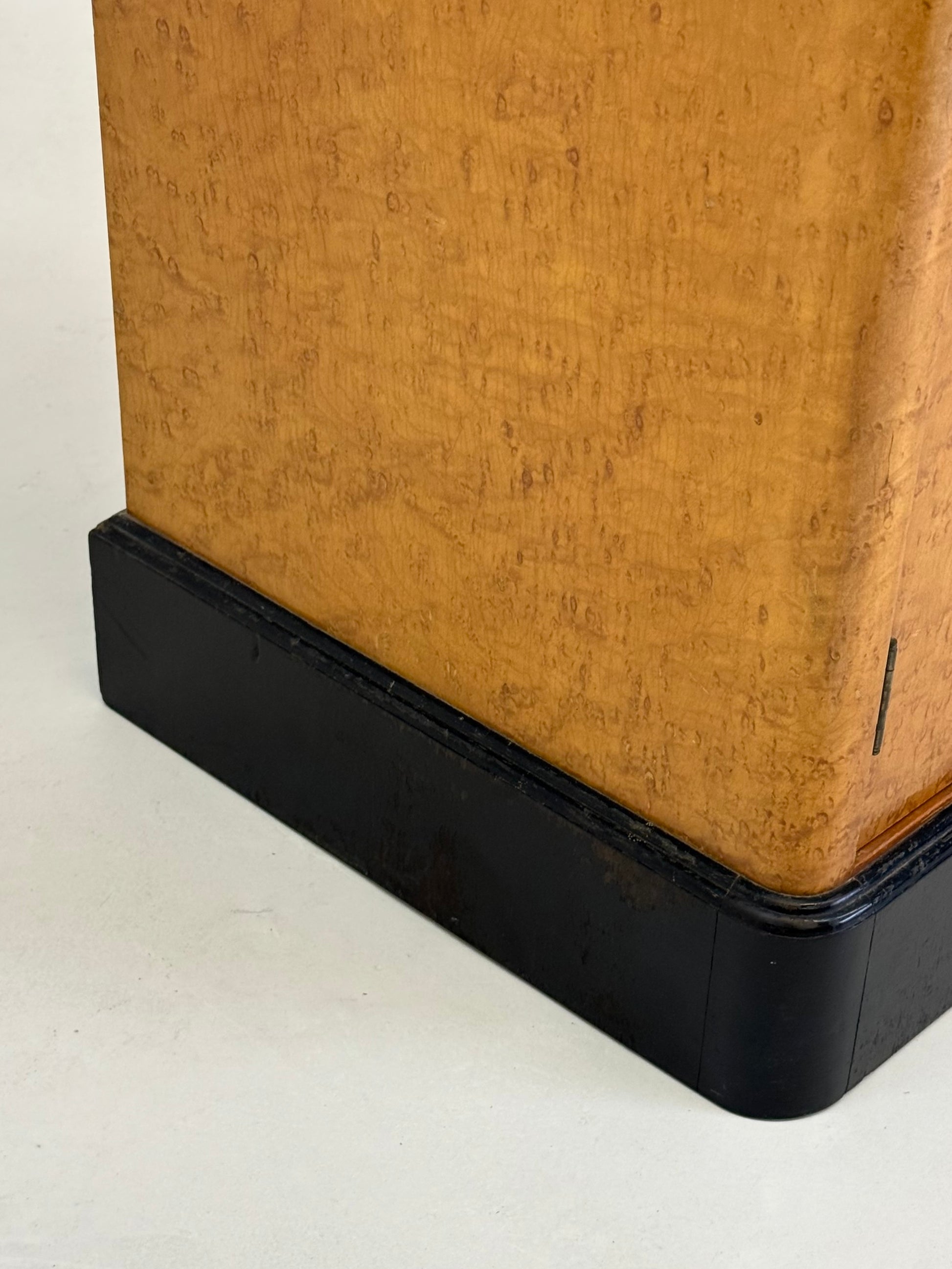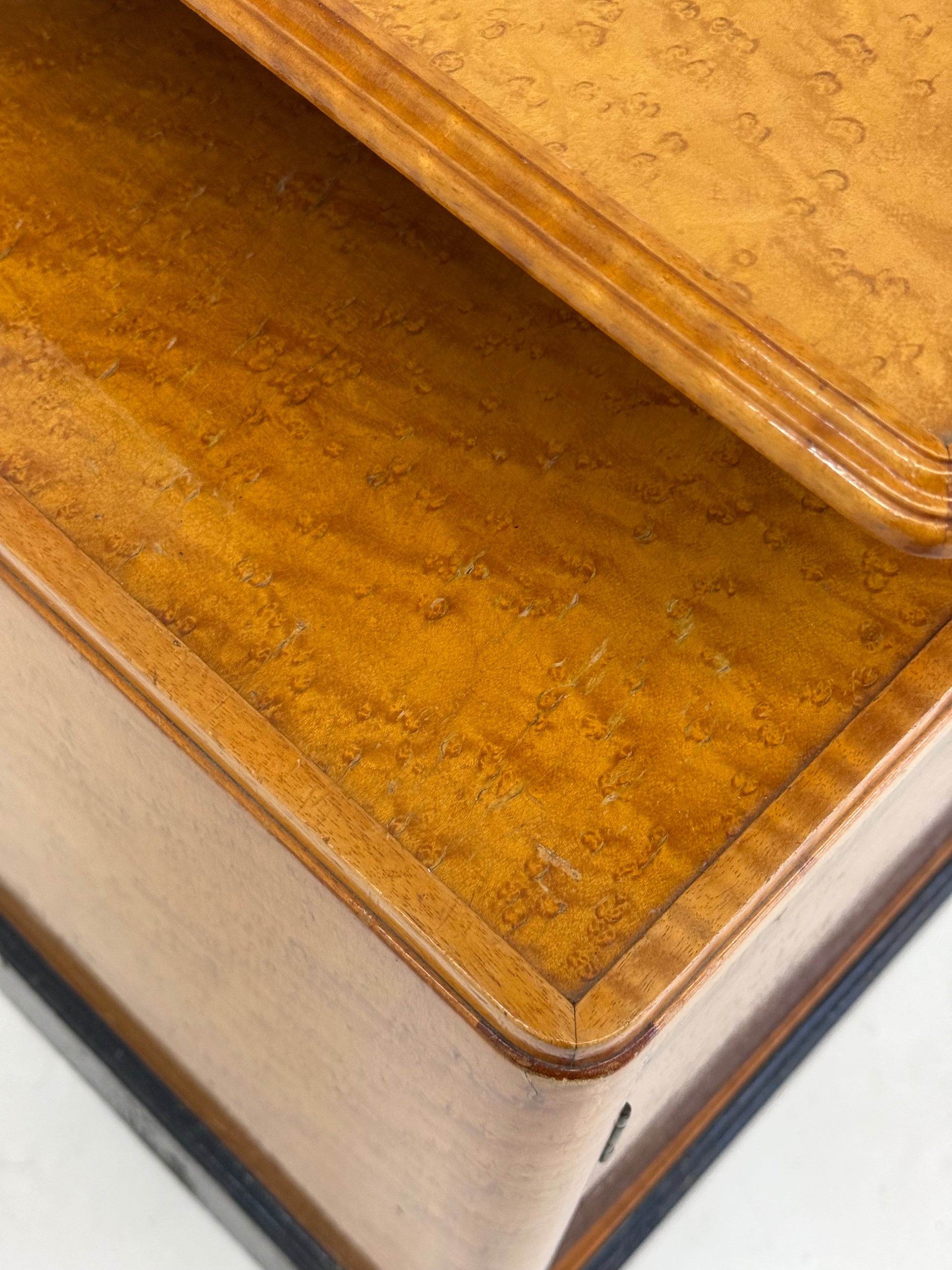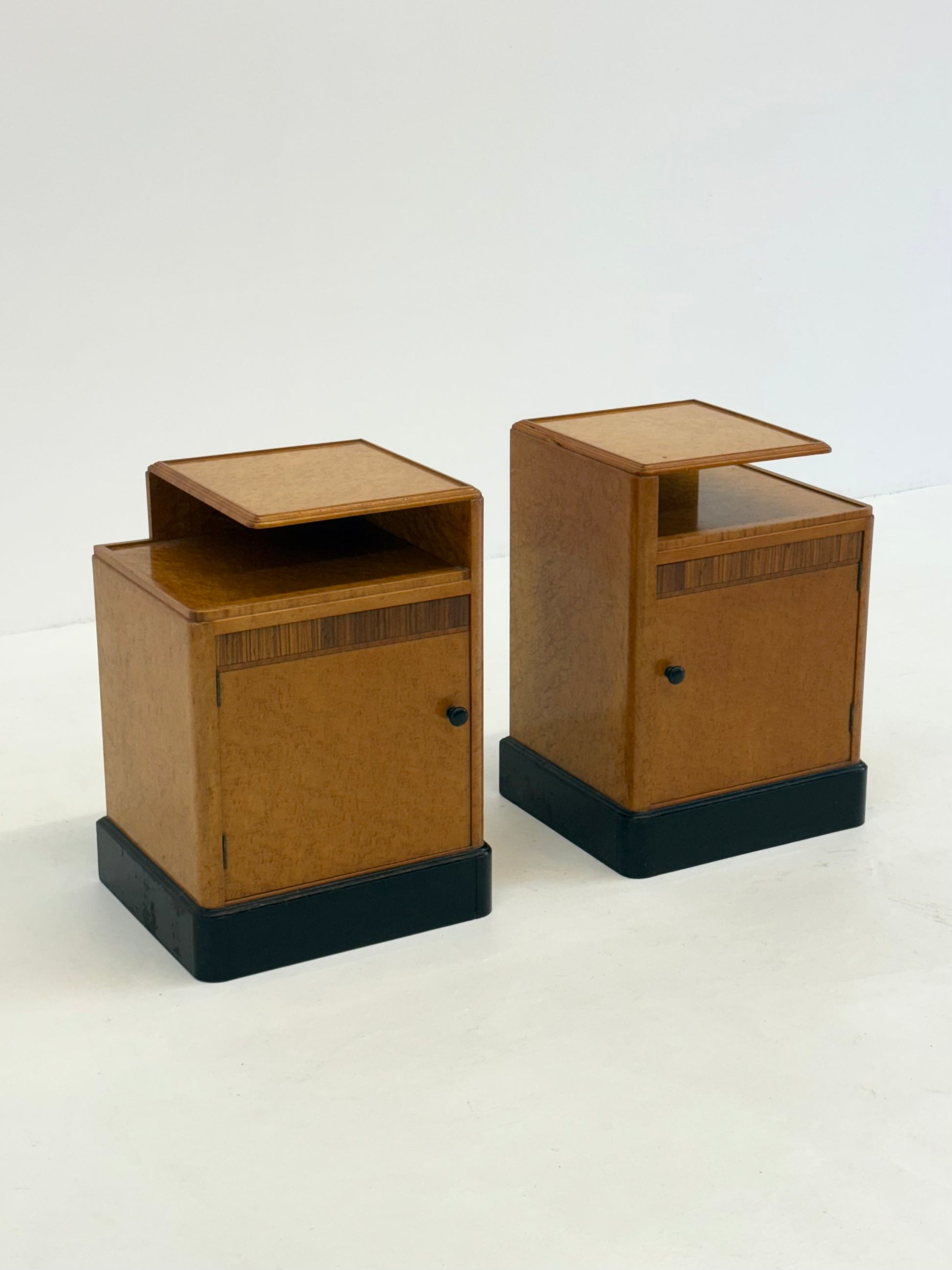 Prachtige originele Art Deco nachtkastjes uit de jaren 30, uitgevoerd in wortel-esdoornfineer met een diepe glans en warme tekening. De kastjes hebben een zwart gelakte voet en een karakteristiek opstaand bovenblad — een elegant detail dat kenmerkend is voor de Art Deco-stijl.
