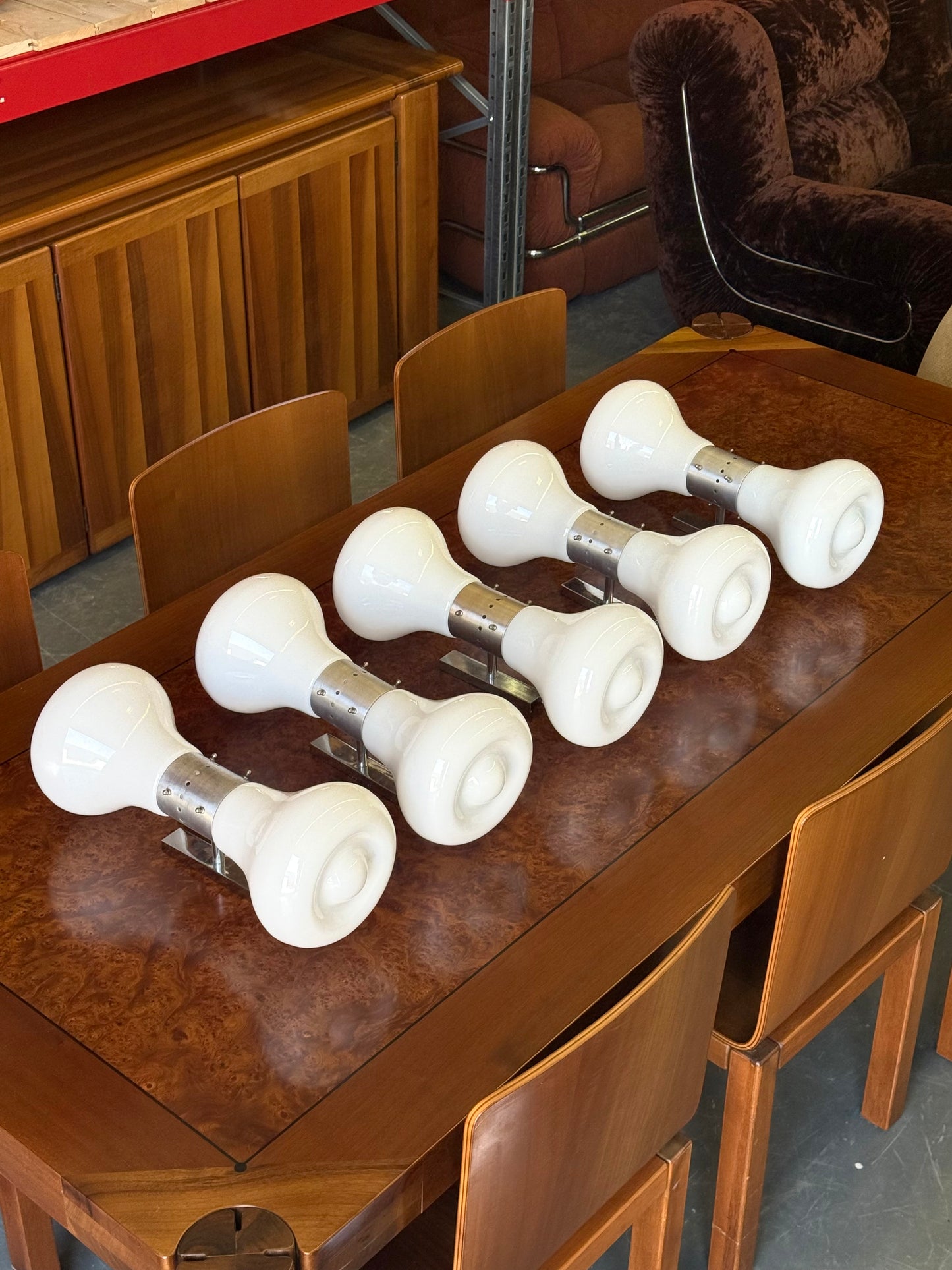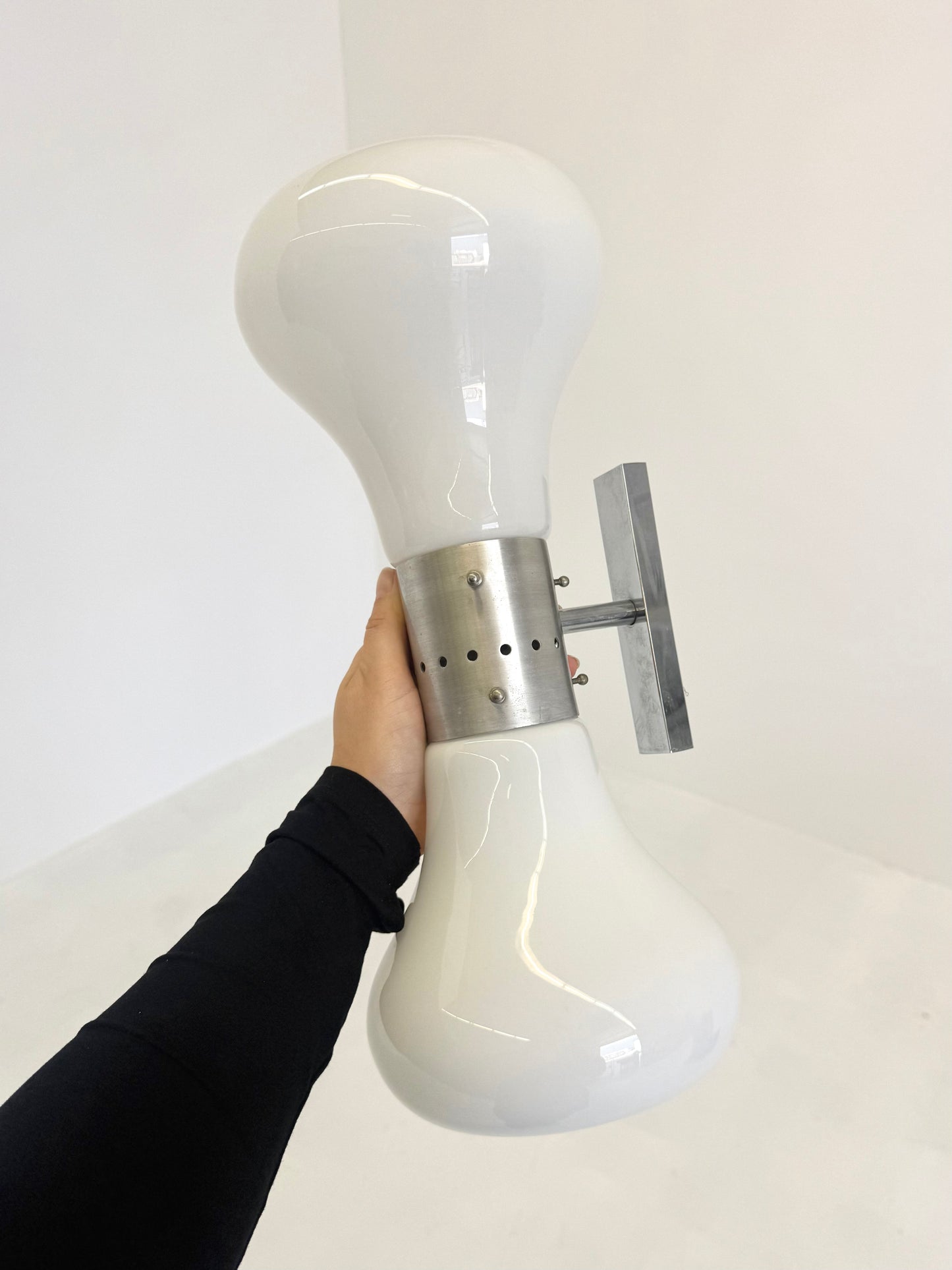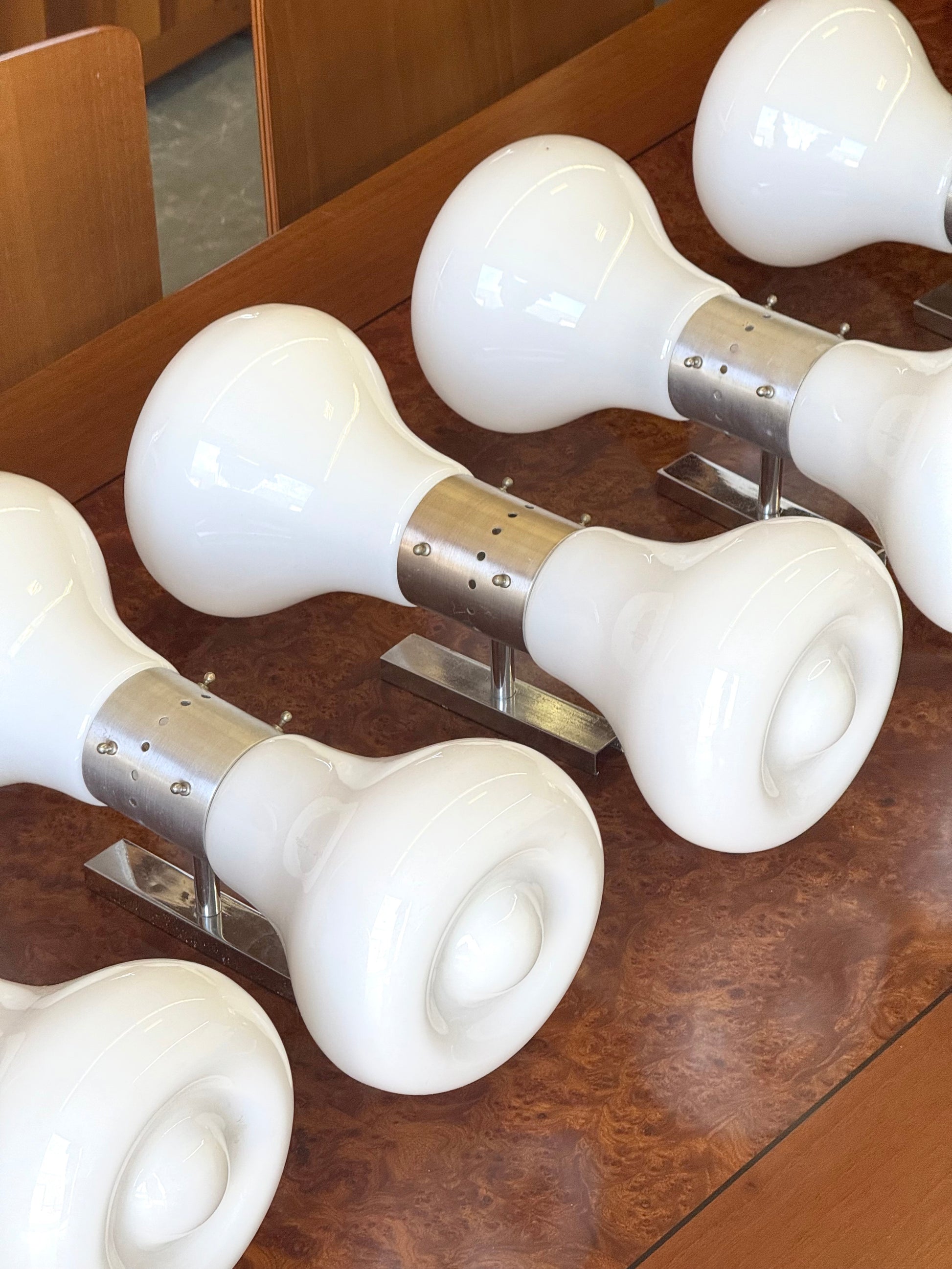 De lampen hebben een sculpturale witte Murano glazen kappen met zachte, organische vormen, gecombineerd met metalen tussenstukken. Het handgeblazen glas verspreidt een warme, diffuse gloed en vangt de futuristische Space Age uitstraling van de jaren ’70 perfect.