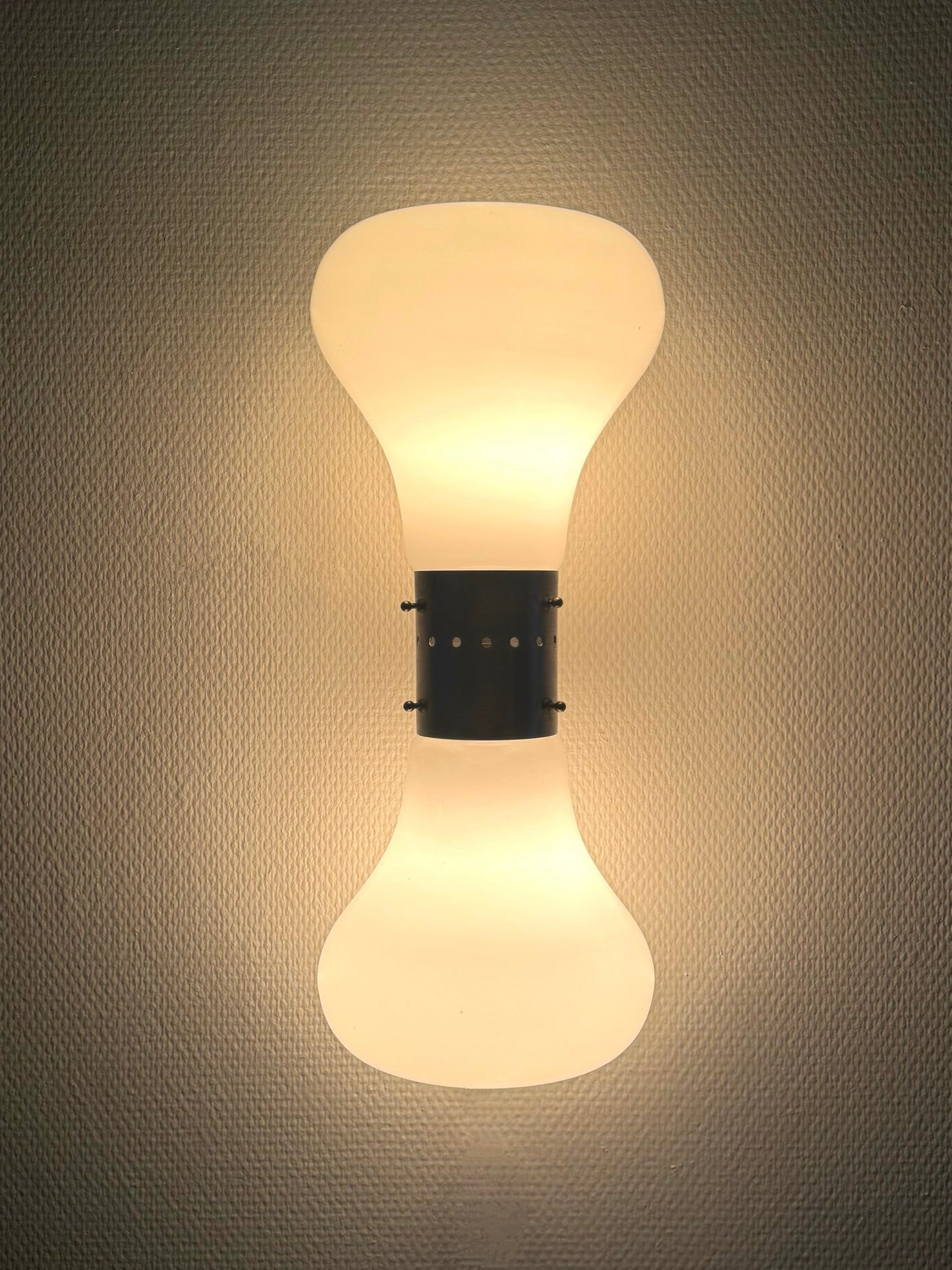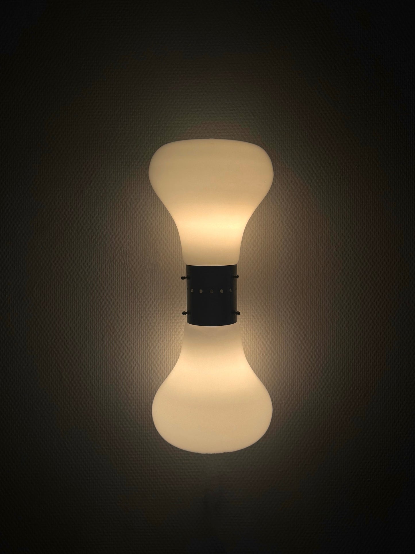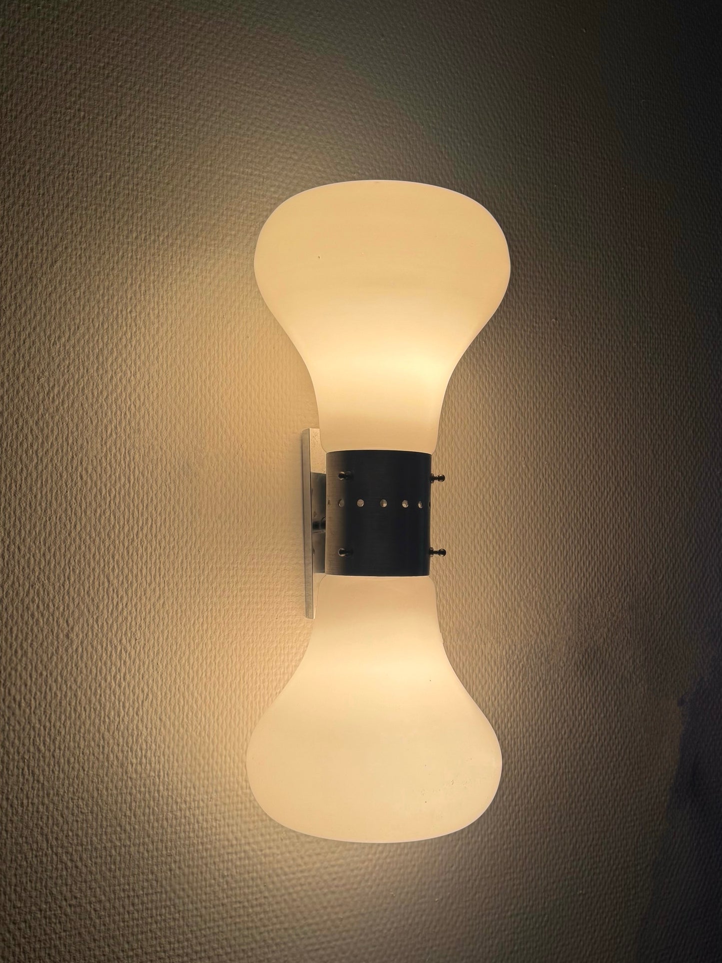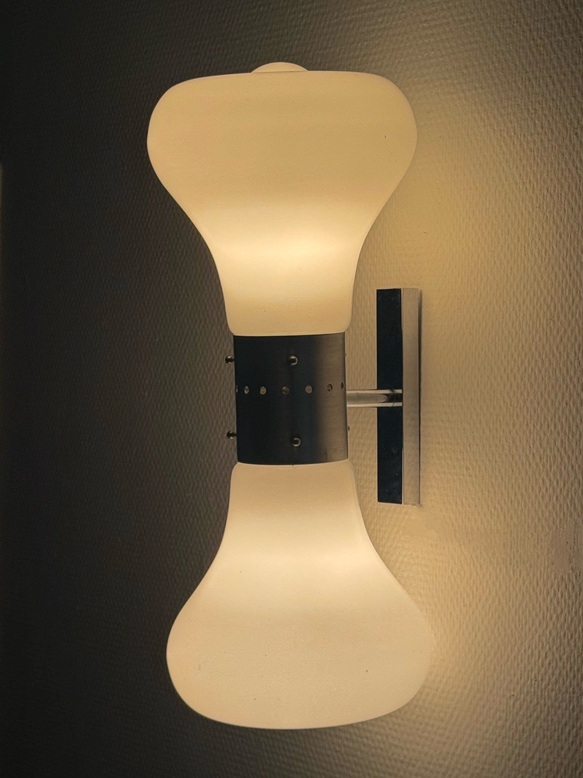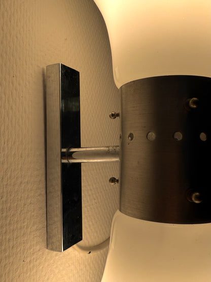 Bijzondere space age Birillo wandlampen, ontworpen door Carlo Nason voor Mazzega in de jaren '70. Dit iconische model komt vaker voor als vloerlamp of soms tafellamp, maar de wandversie is uiterst zeldzaam en geliefd onder verzamelaars.
