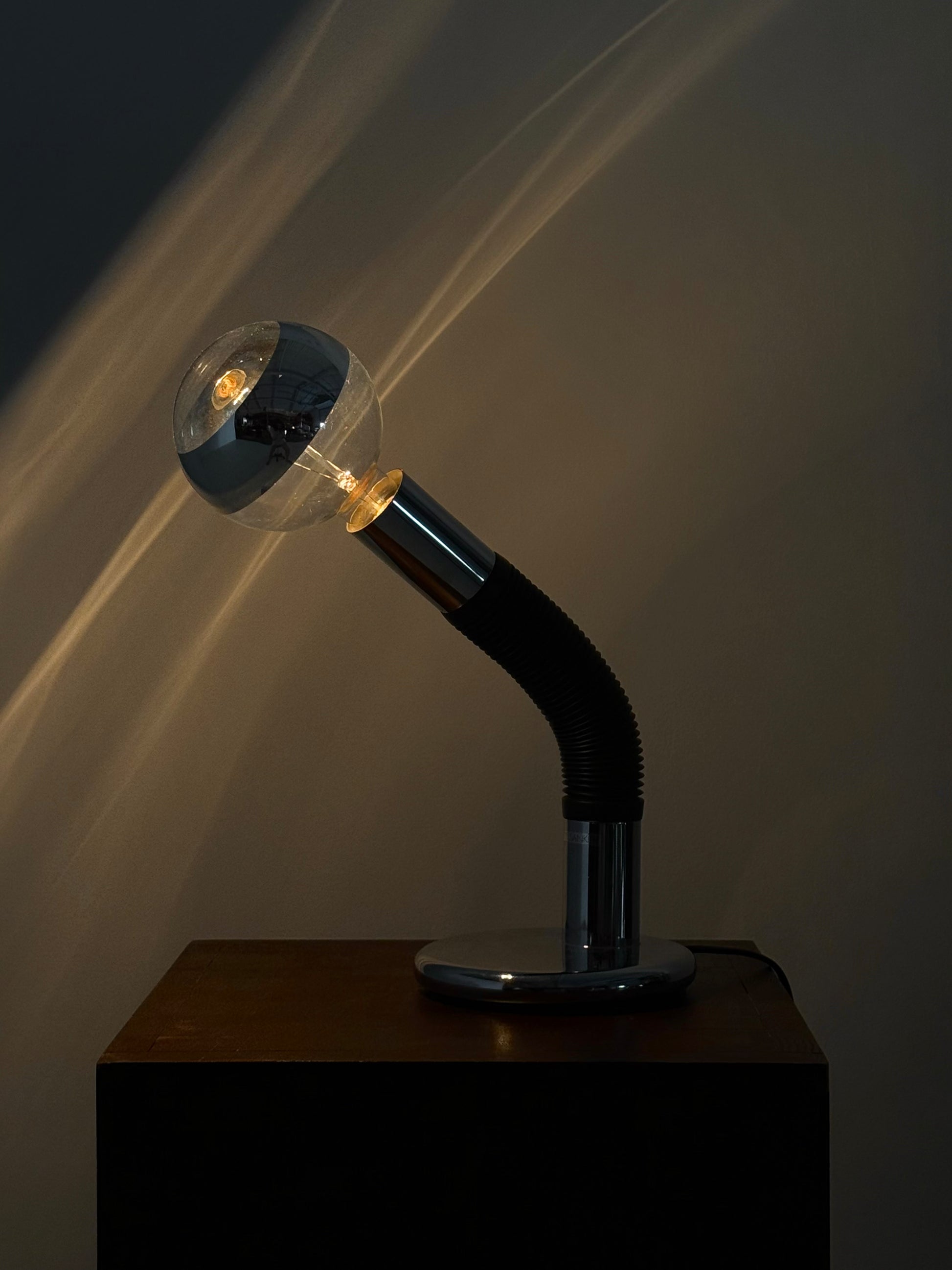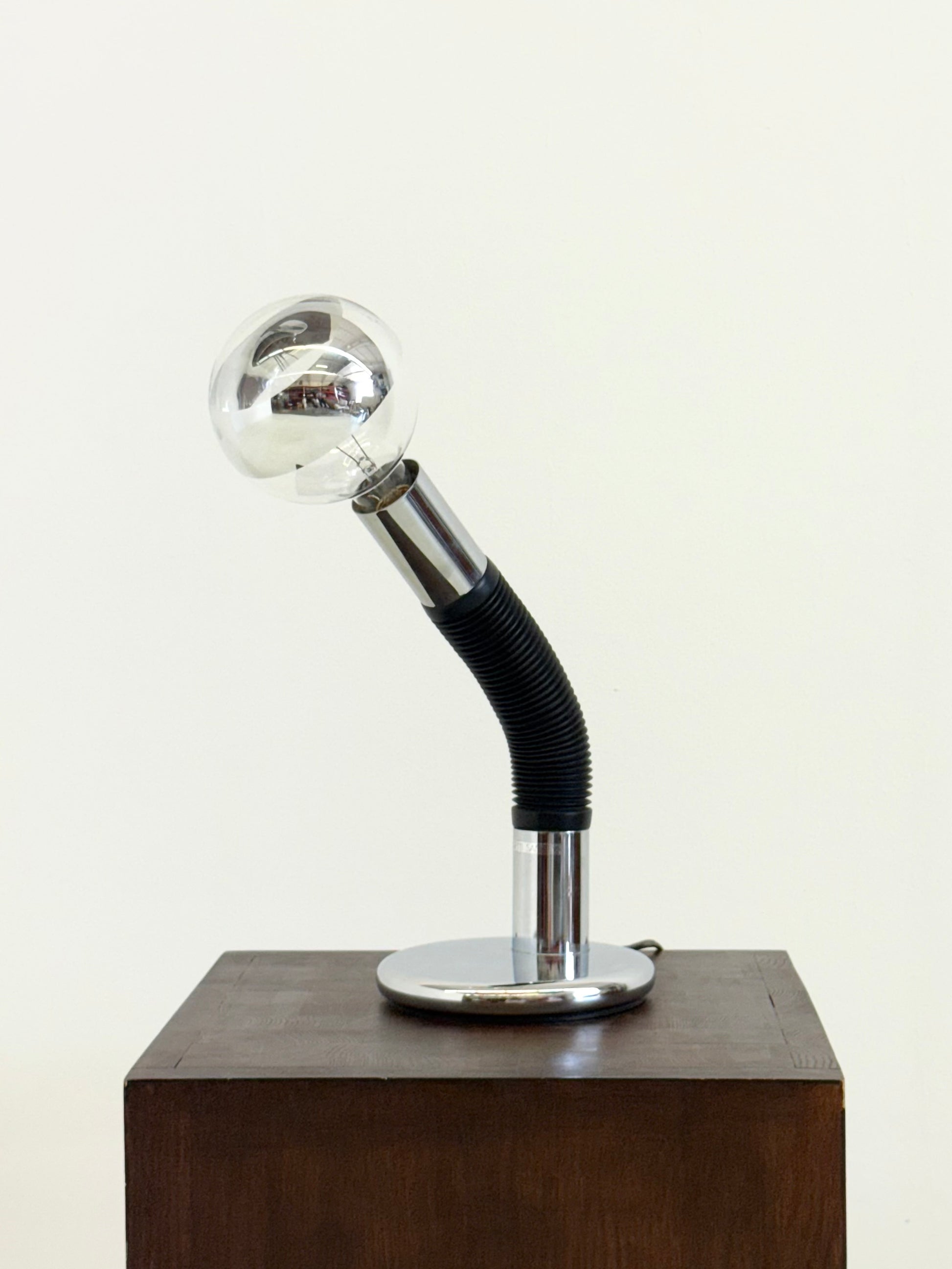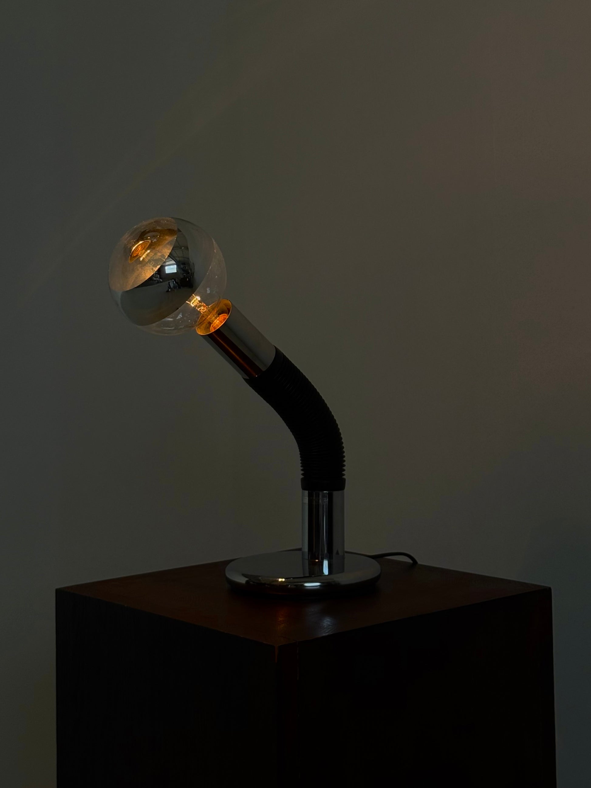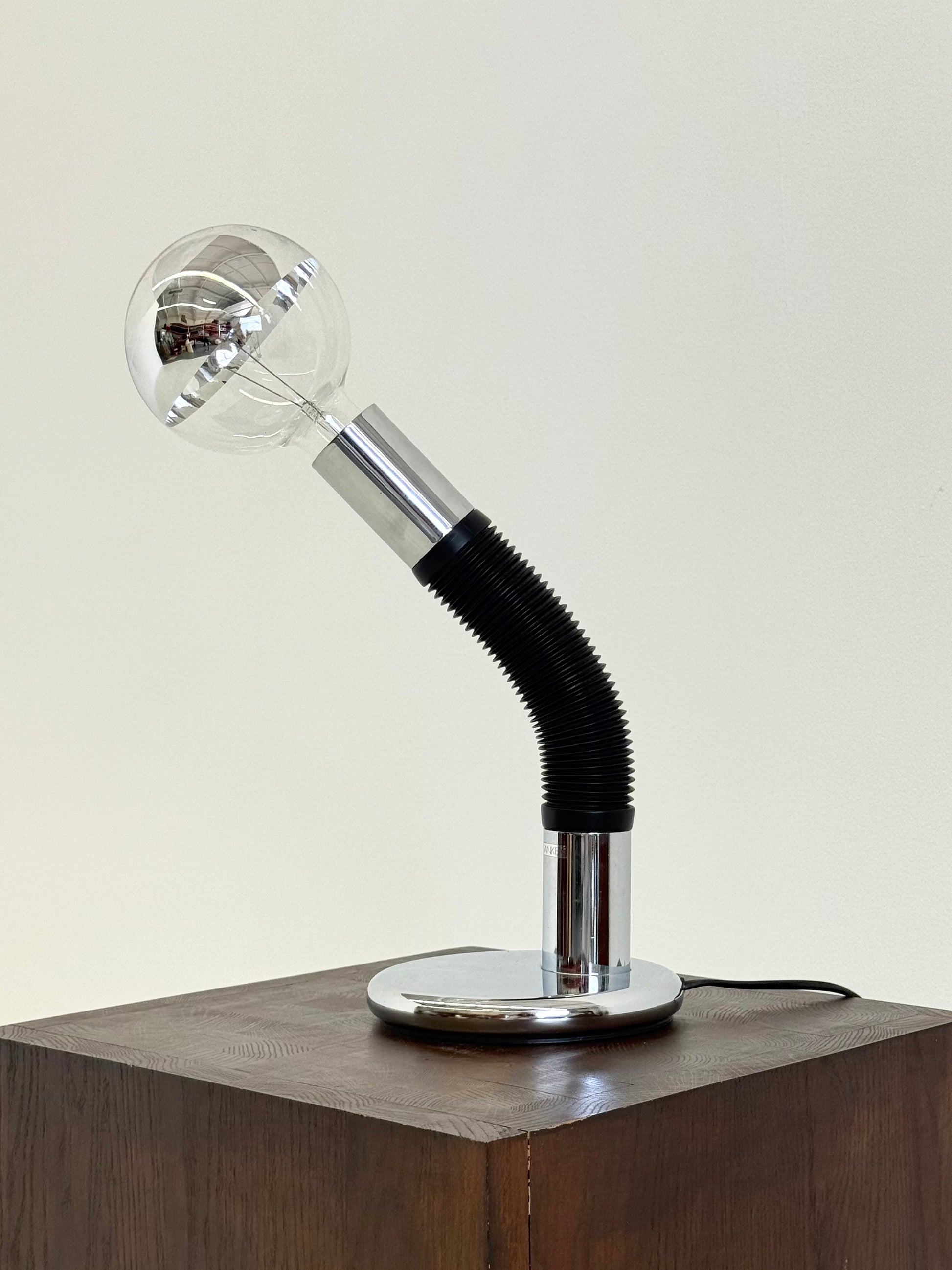 Targetti Sankey tafellamp “Elbow” model 3068/11, ontworpen door E. Bellini rond 1970. Deze verstelbare lamp heeft een flexibele arm en een chromen buis die omhoog en omlaag kan worden versteld. De lamp verkeert in zeer goede originele staat. Materiaal: verchroomd metaal en plastic.