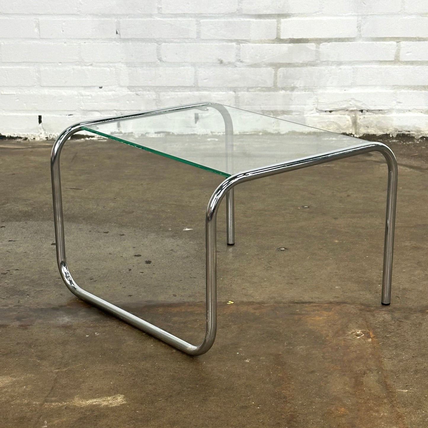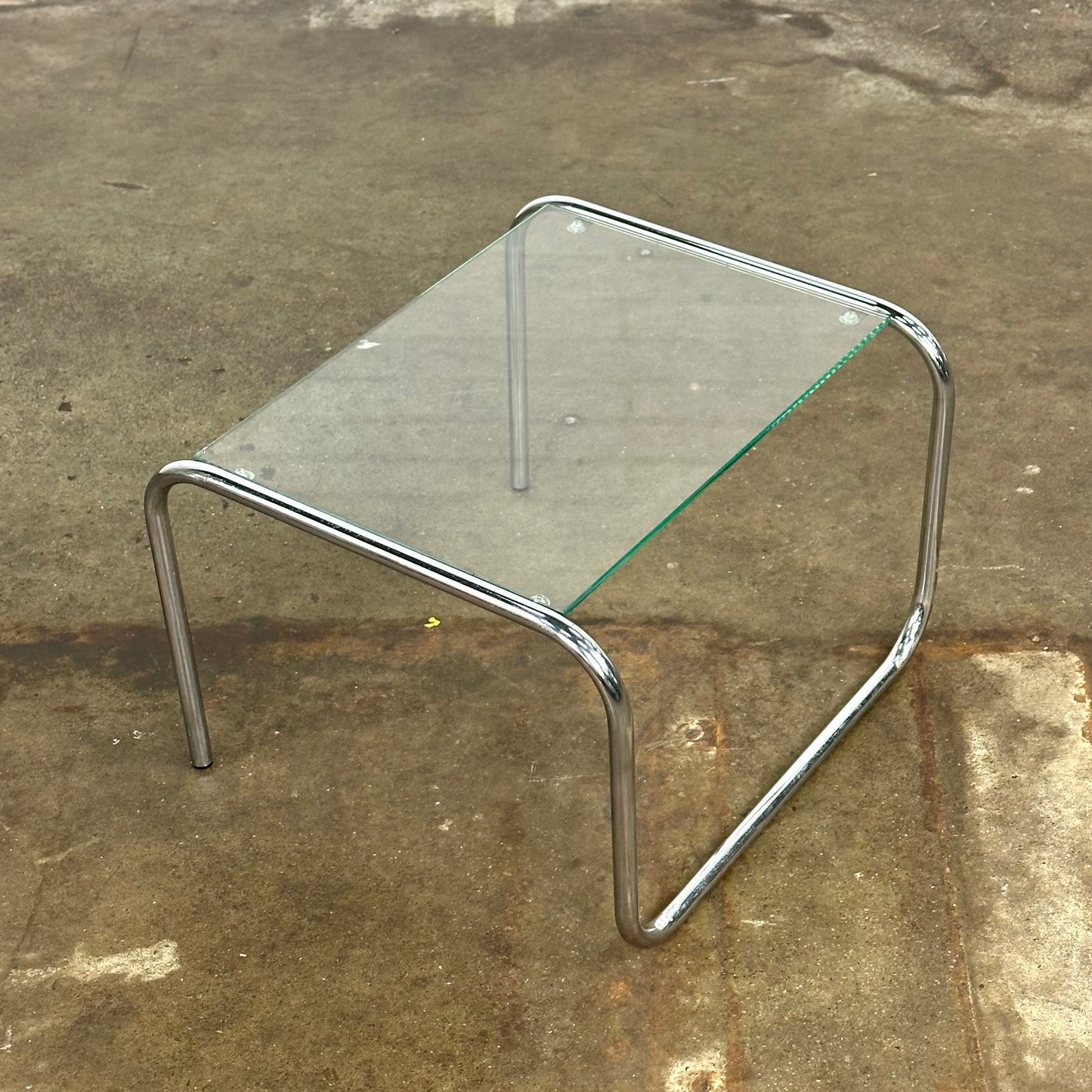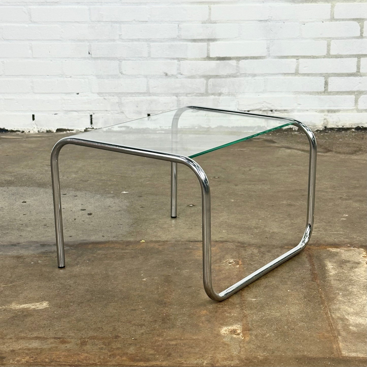 Omschrijving: Vintage bijzettafel met glazen blad en buisframe onderstel