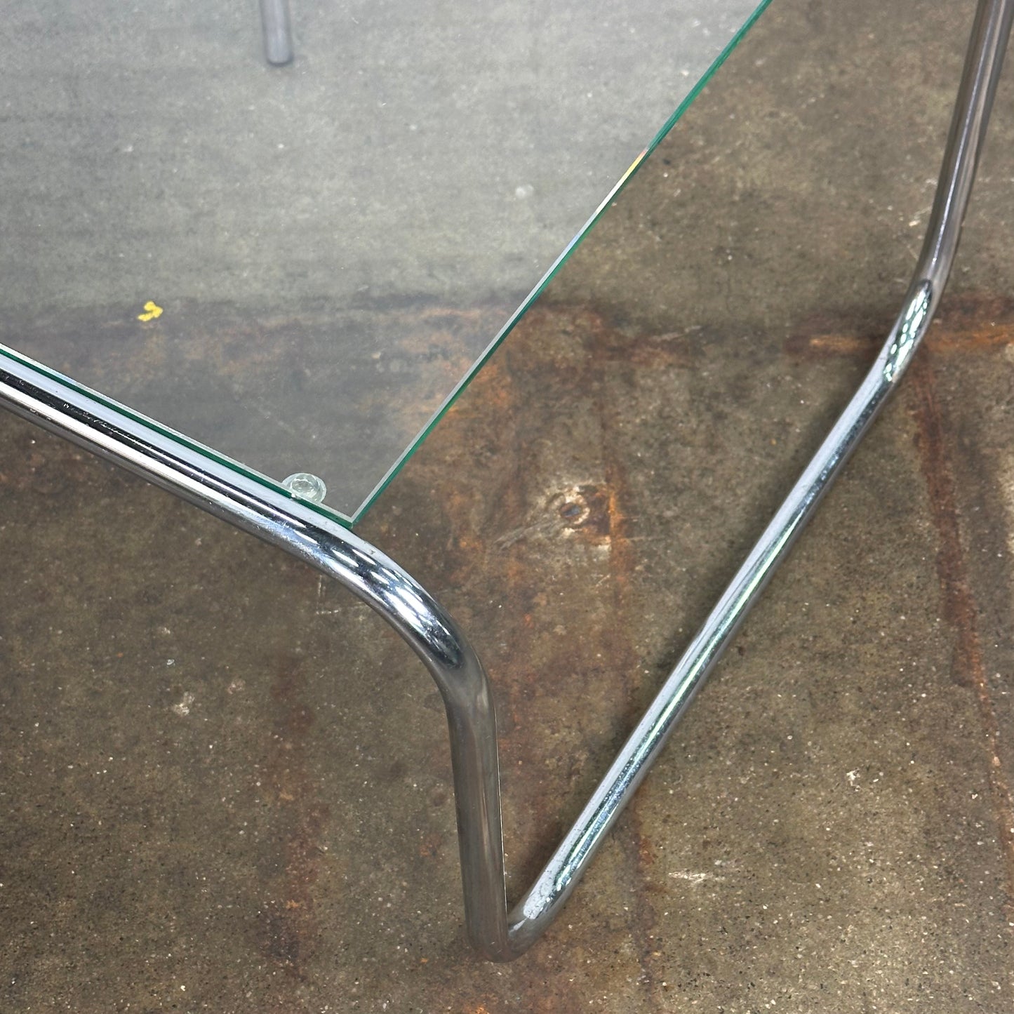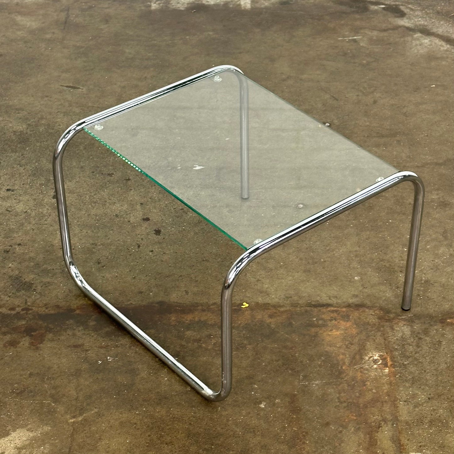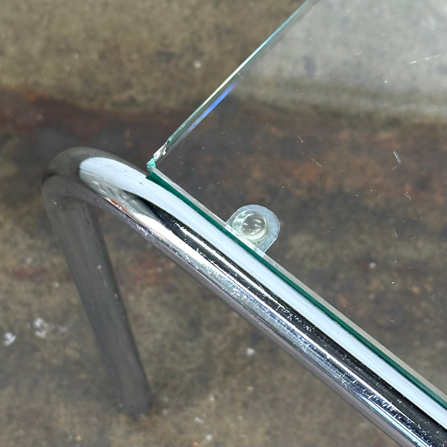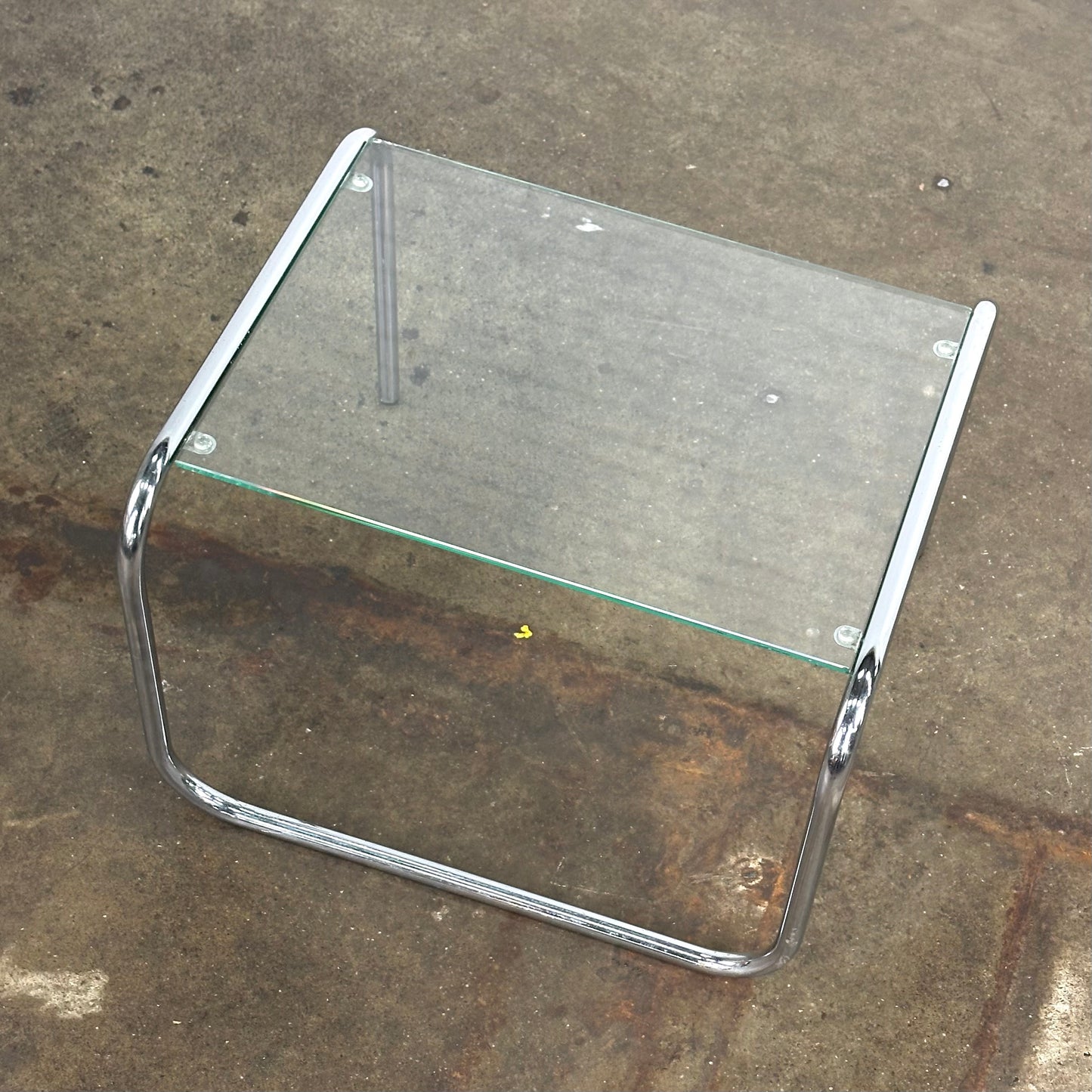 Omschrijving: Vintage bijzettafel met glazen blad en buisframe onderstel