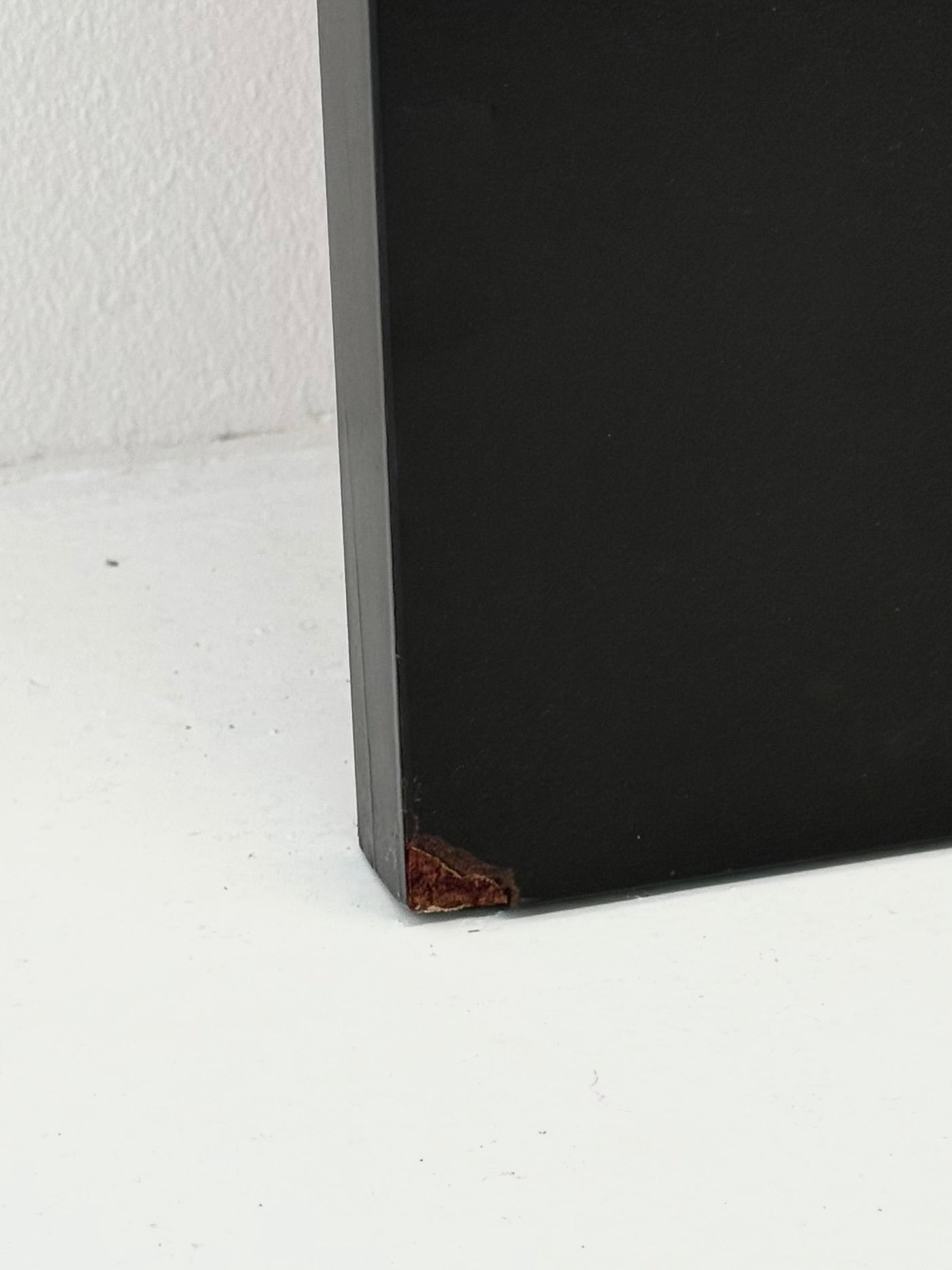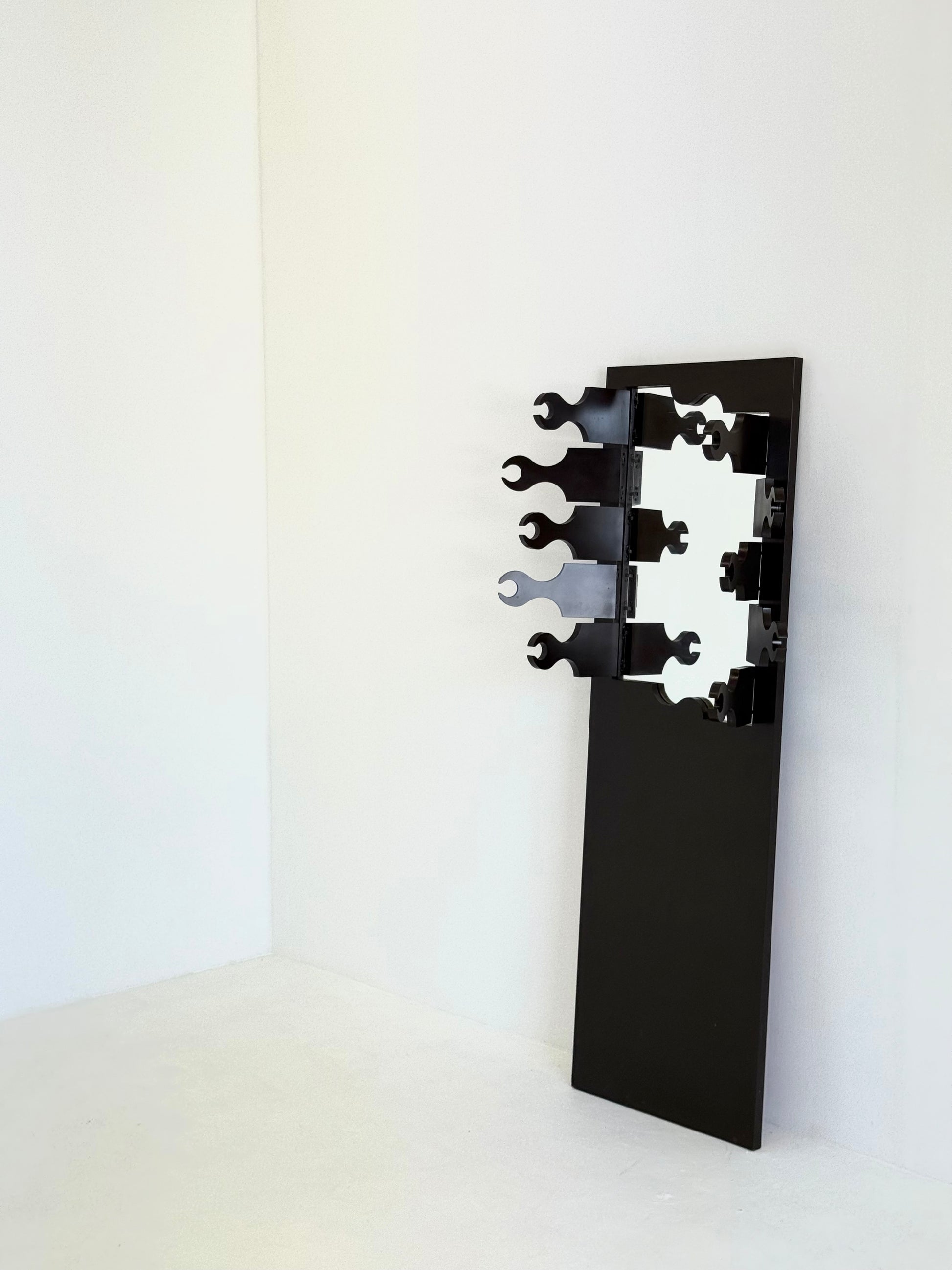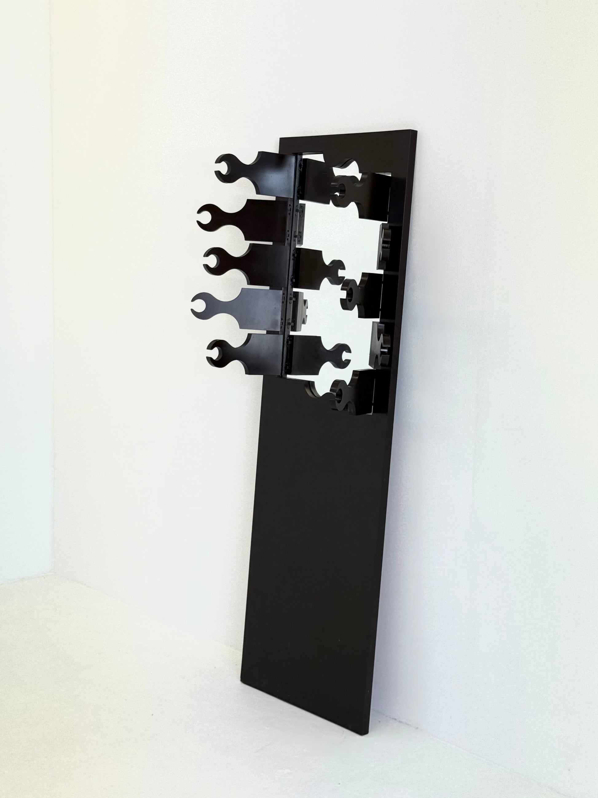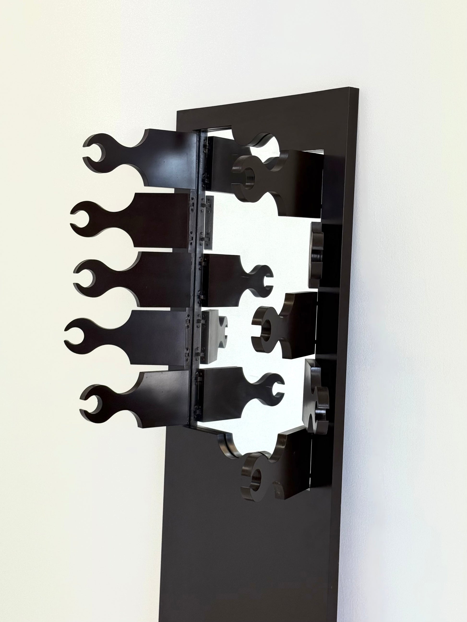 De kapstok bestaat uit hoge verticale panelen, uitgevoerd in een warme roodbruine lak die diepte en elegantie toevoegt aan de strakke geometrie. Achter de scharnierende houten elementen schuilt een spiegelend paneel, dat tevoorschijn komt zodra de deuren geopend worden en de verborgen kapstokken onthult. Dit maakt de kapstok niet alleen een functioneel meubelstuk, maar ook een verrassend designobject.