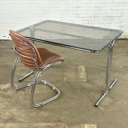 Vintage rechthoekige eettafel met rookglas en buisframe onderstel