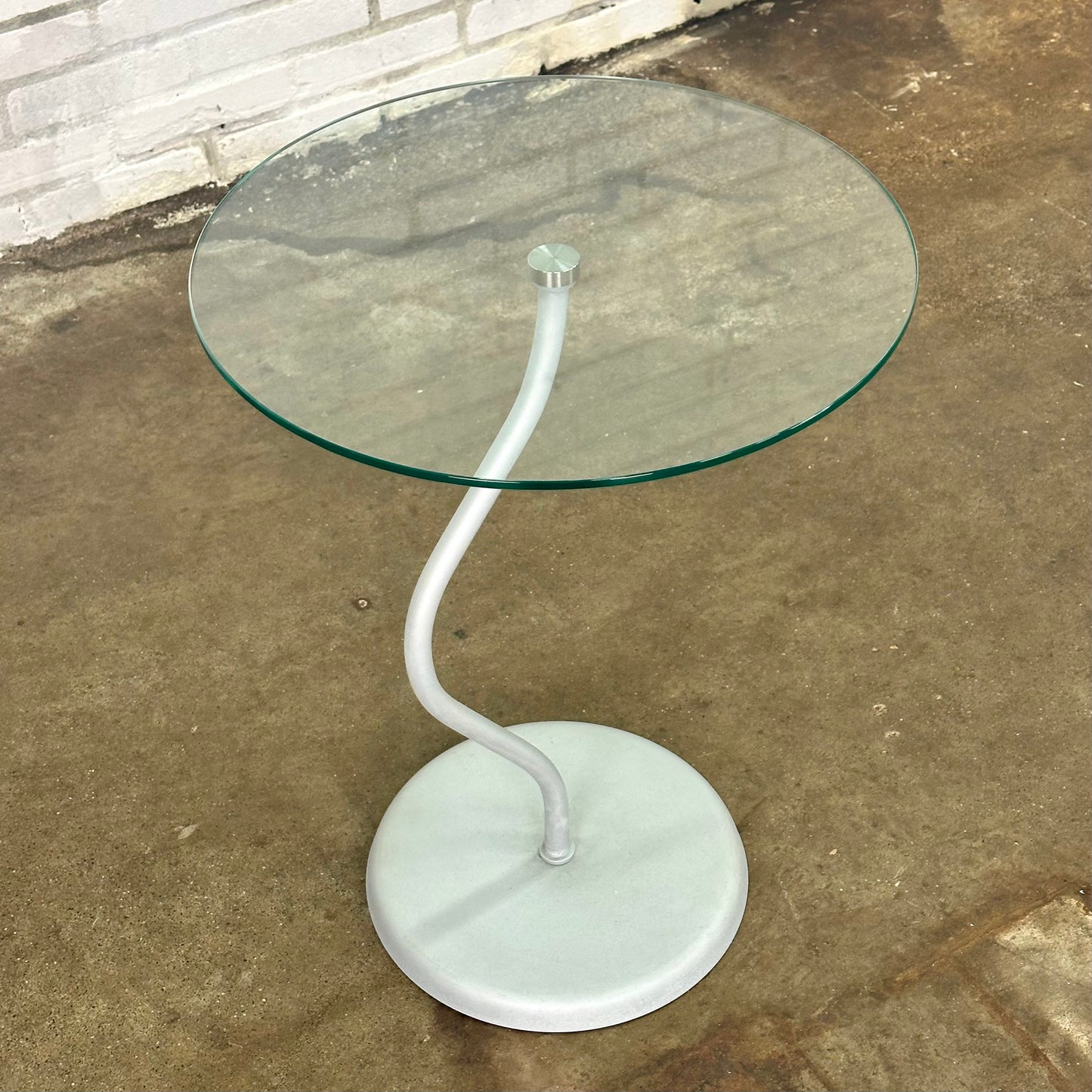 De stalen poot is uitgevoerd met een sierlijke krul, boog / gebogen vorm, wat een vleugje speelsheid toevoegt aan het minimalistische ontwerp. De combinatie van glas en staal maakt dit tafeltje een veelzijdig meubelstuk dat in verschillende interieurstijlen past, van modern tot klassiek.