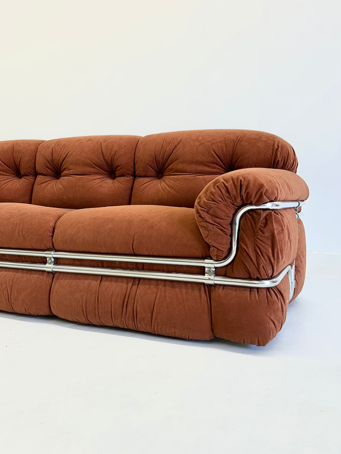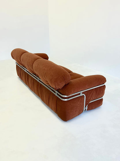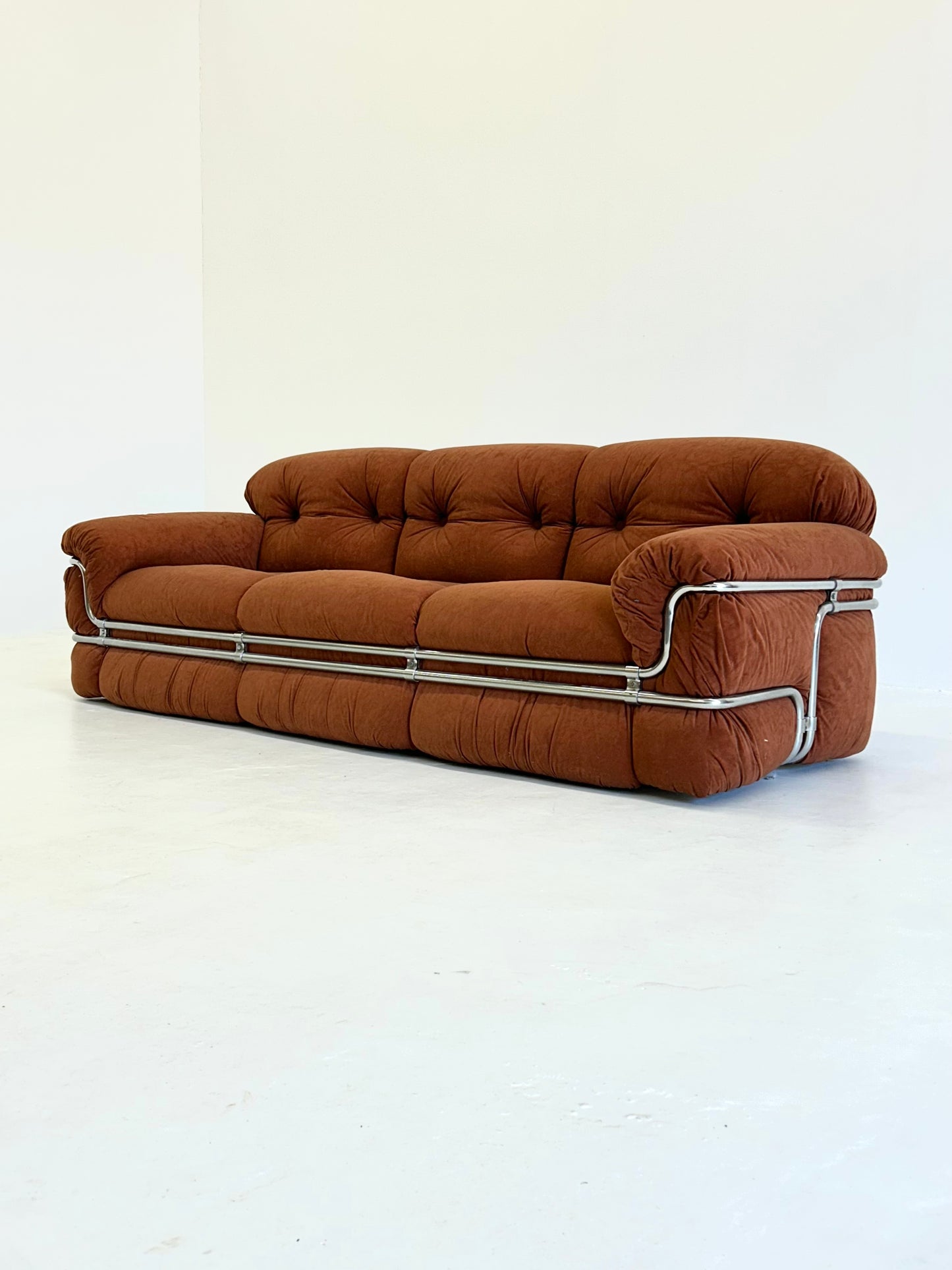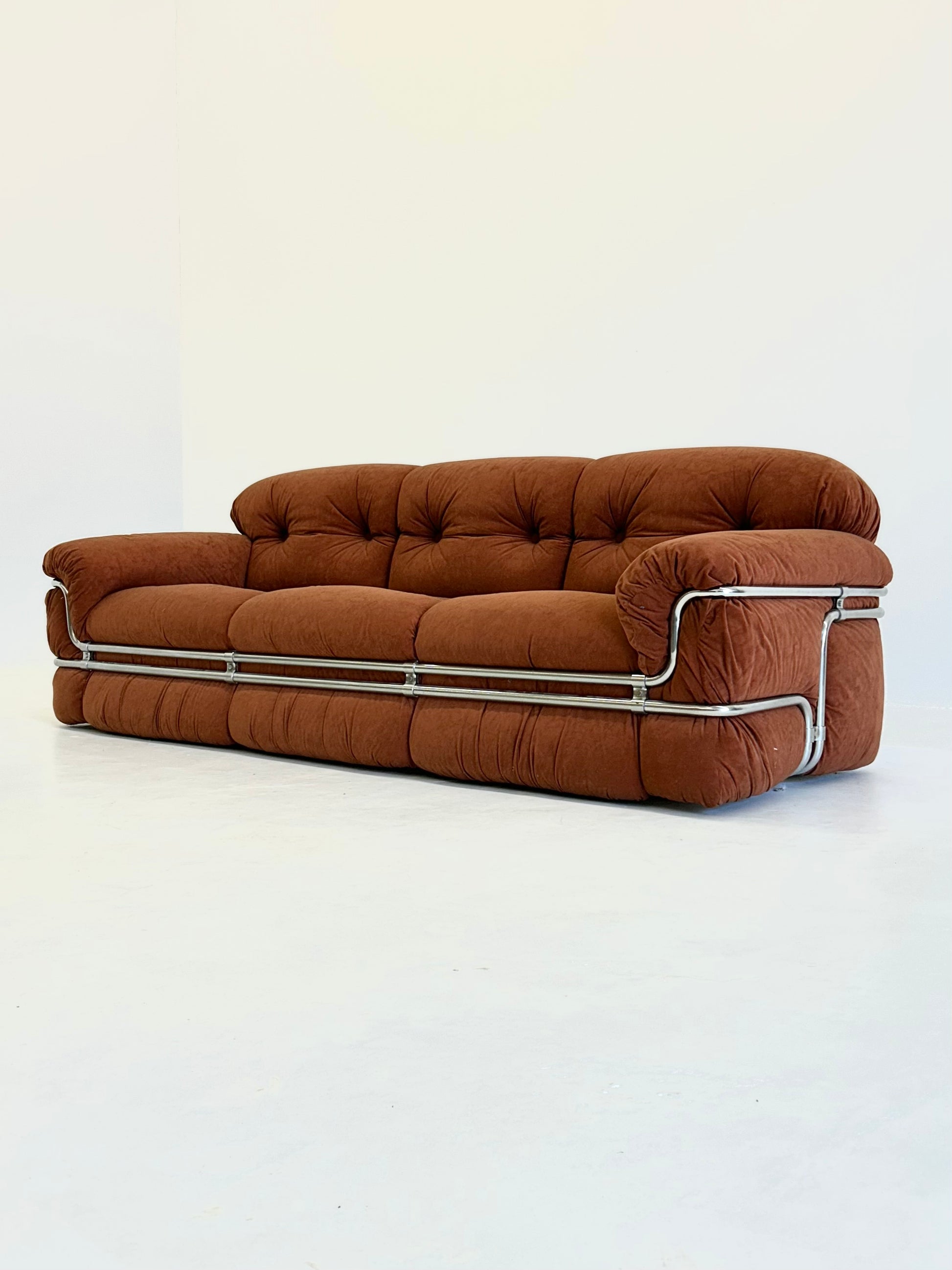 Deze 3-zit bank, ontworpen door Adriano Piazzesi in de jaren '70, is een prachtig voorbeeld van zijn vooruitstrevende benadering van meubeldesign. Piazzesi combineerde zijn architectonische achtergrond met zijn passie voor het creëren van meubels die zowel functioneel als esthetisch aantrekkelijk zijn. Het resultaat is een bank met zachte, ronde vormen en een chrome frame, dat zowel speels als elegant oogt.