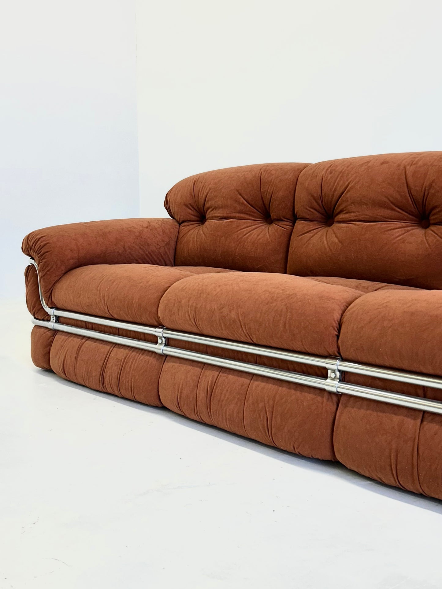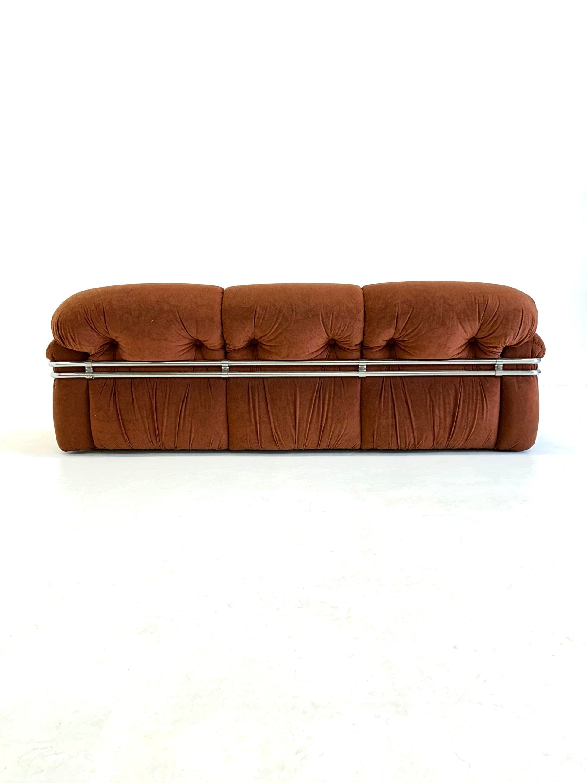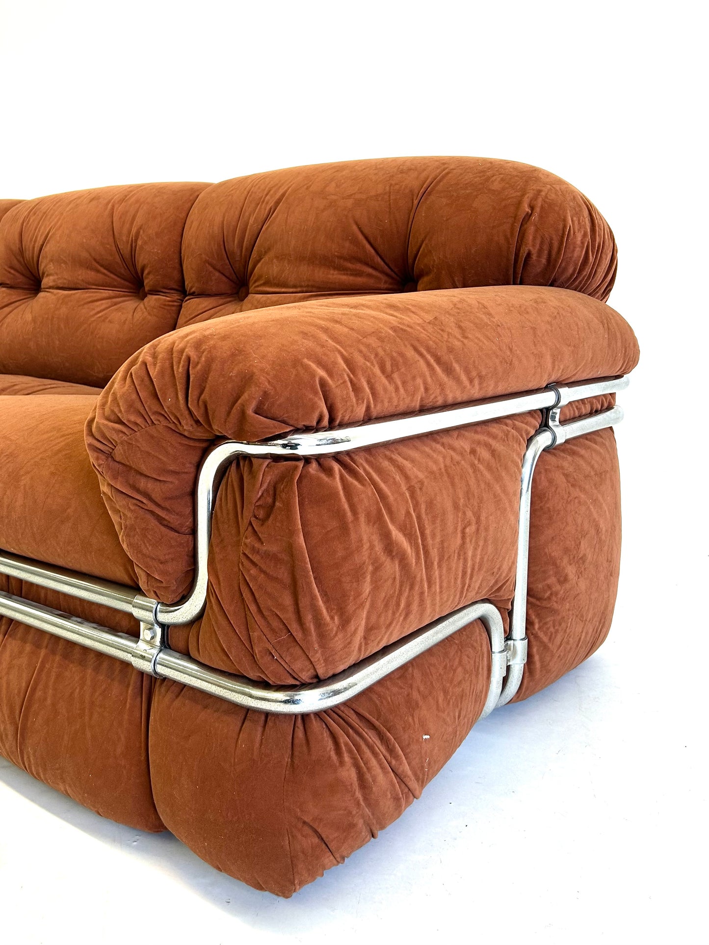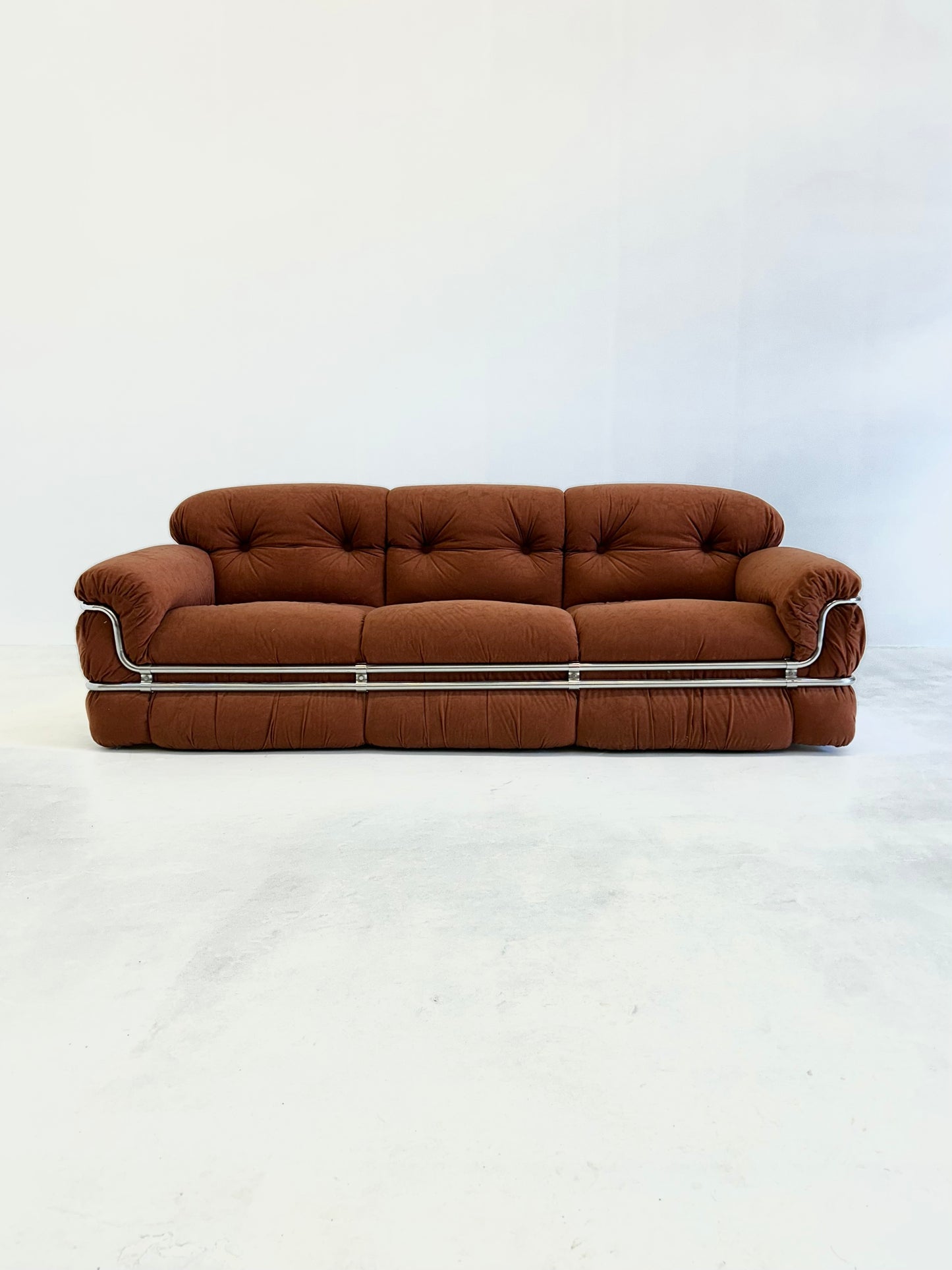 Deze 3-zit bank, ontworpen door Adriano Piazzesi in de jaren '70, is een prachtig voorbeeld van zijn vooruitstrevende benadering van meubeldesign. Piazzesi combineerde zijn architectonische achtergrond met zijn passie voor het creëren van meubels die zowel functioneel als esthetisch aantrekkelijk zijn. Het resultaat is een bank met zachte, ronde vormen en een chrome frame, dat zowel speels als elegant oogt.