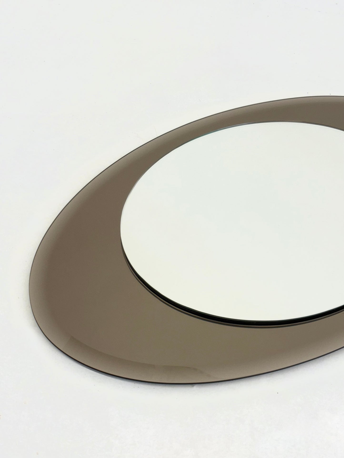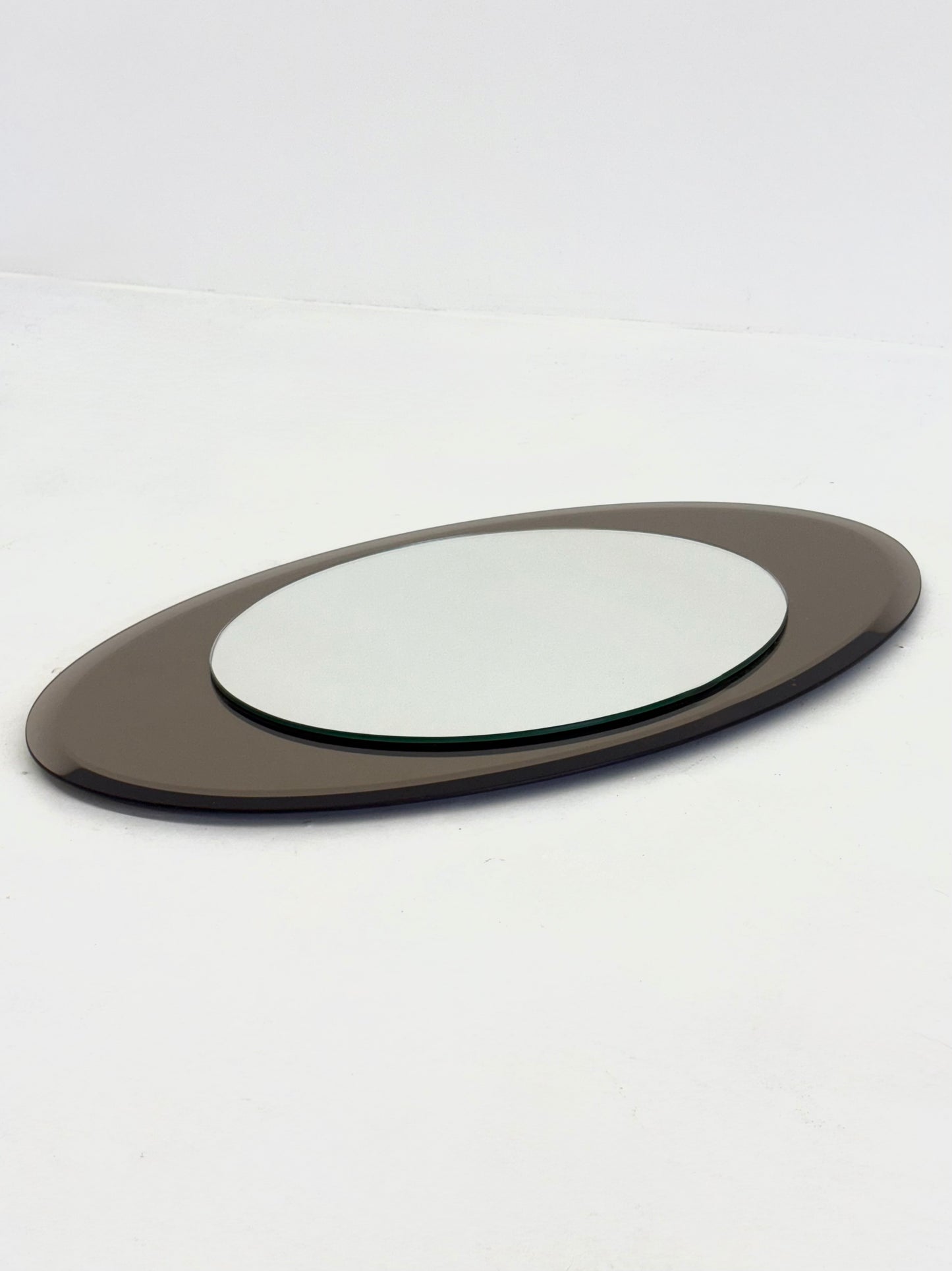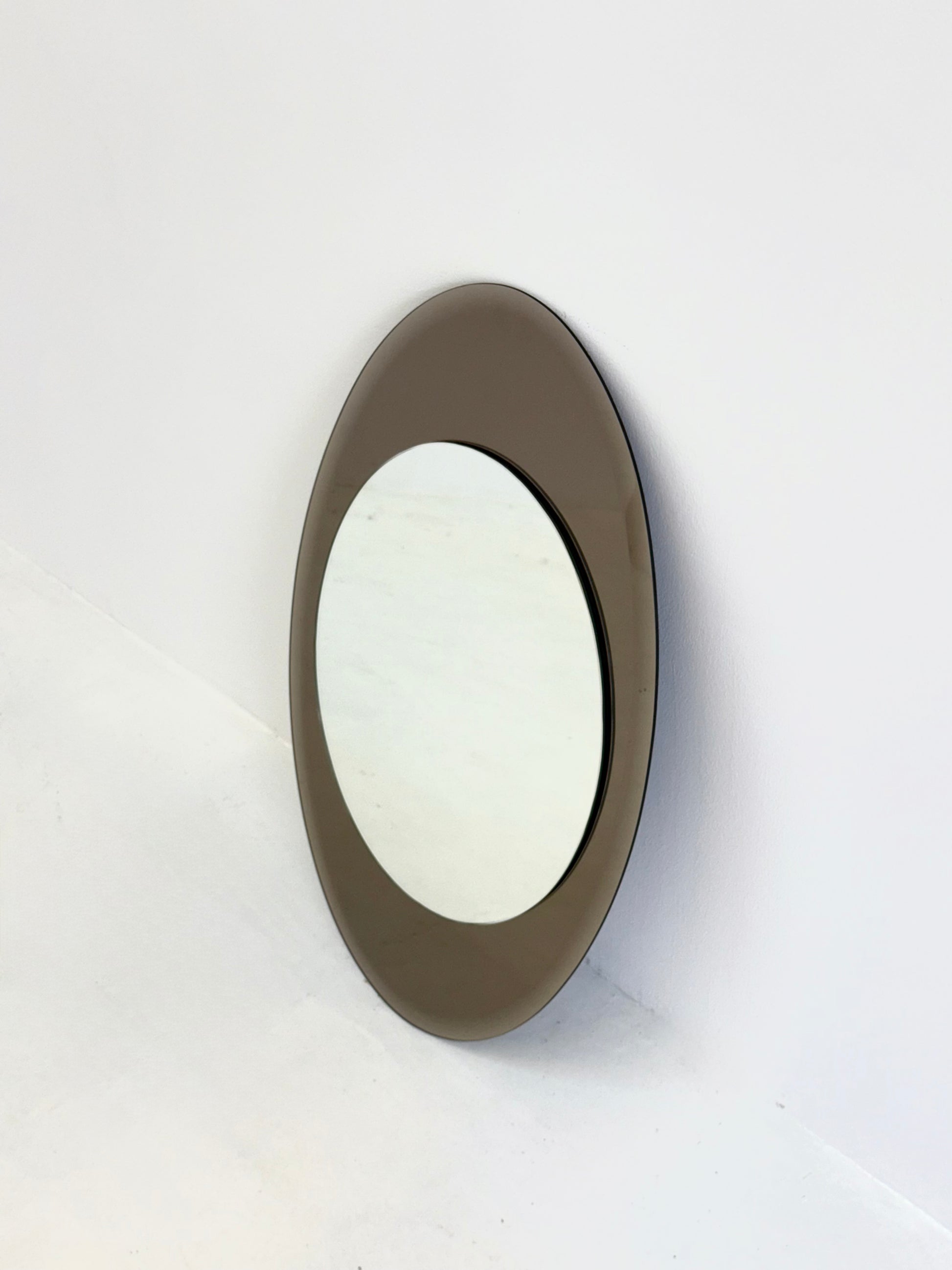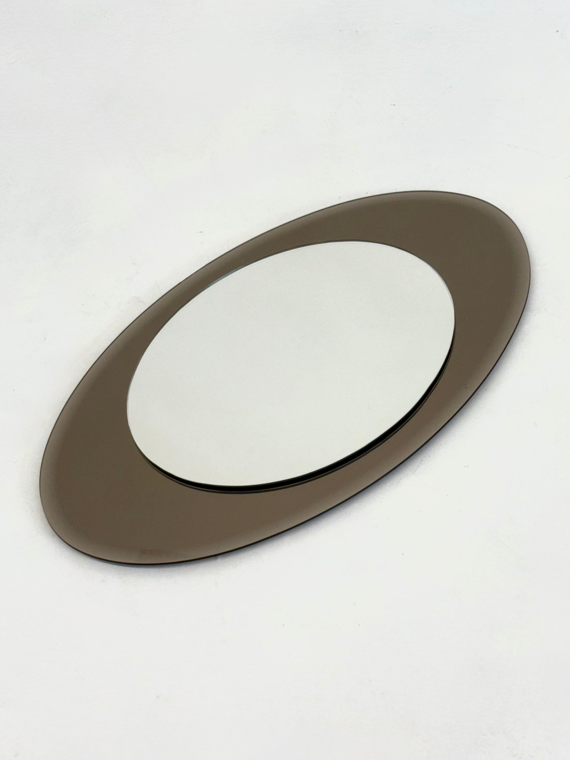 Deze Italiaanse vintage spiegel heeft een ovale vorm met een taupe getinte spiegel en een tweede ronde standaardspiegel.