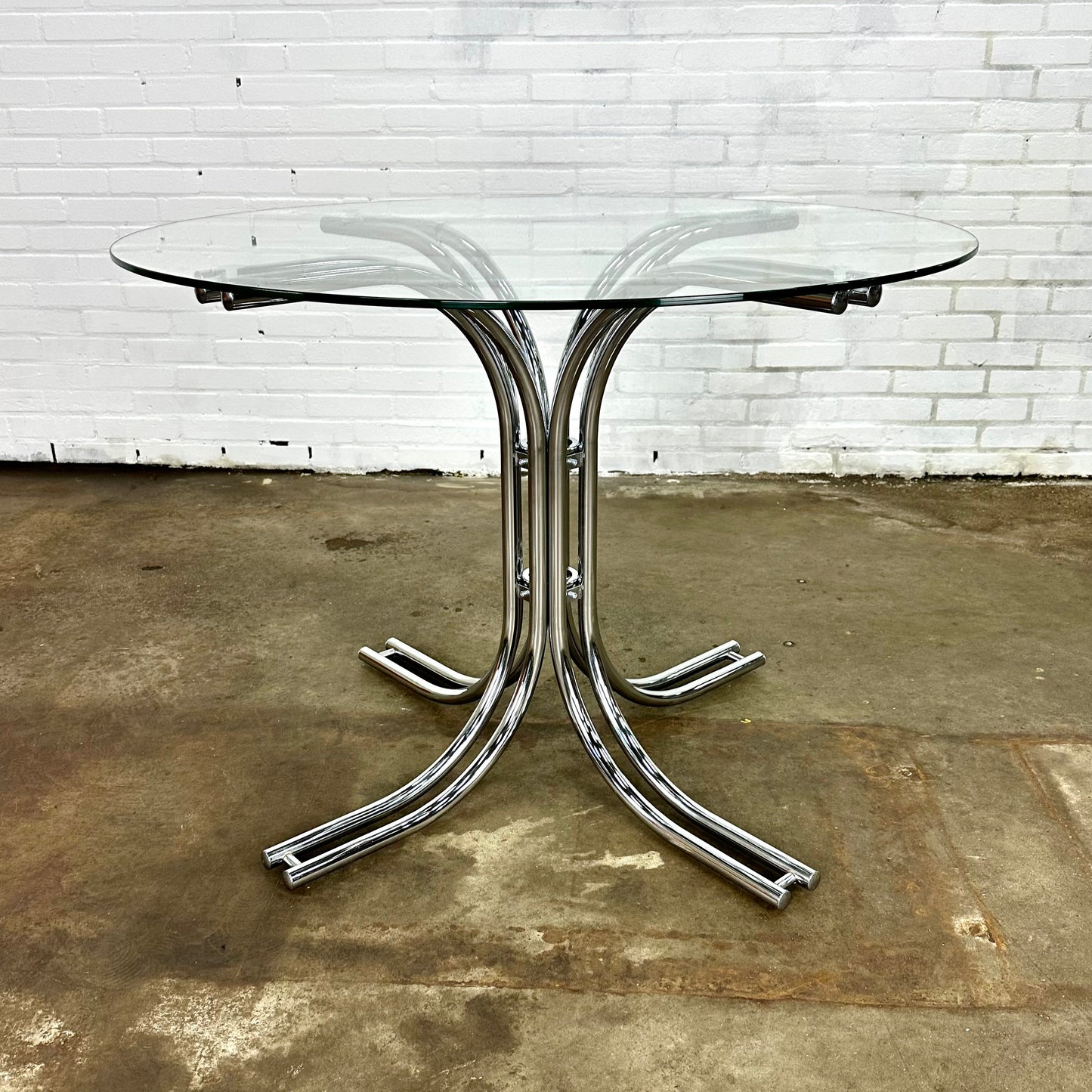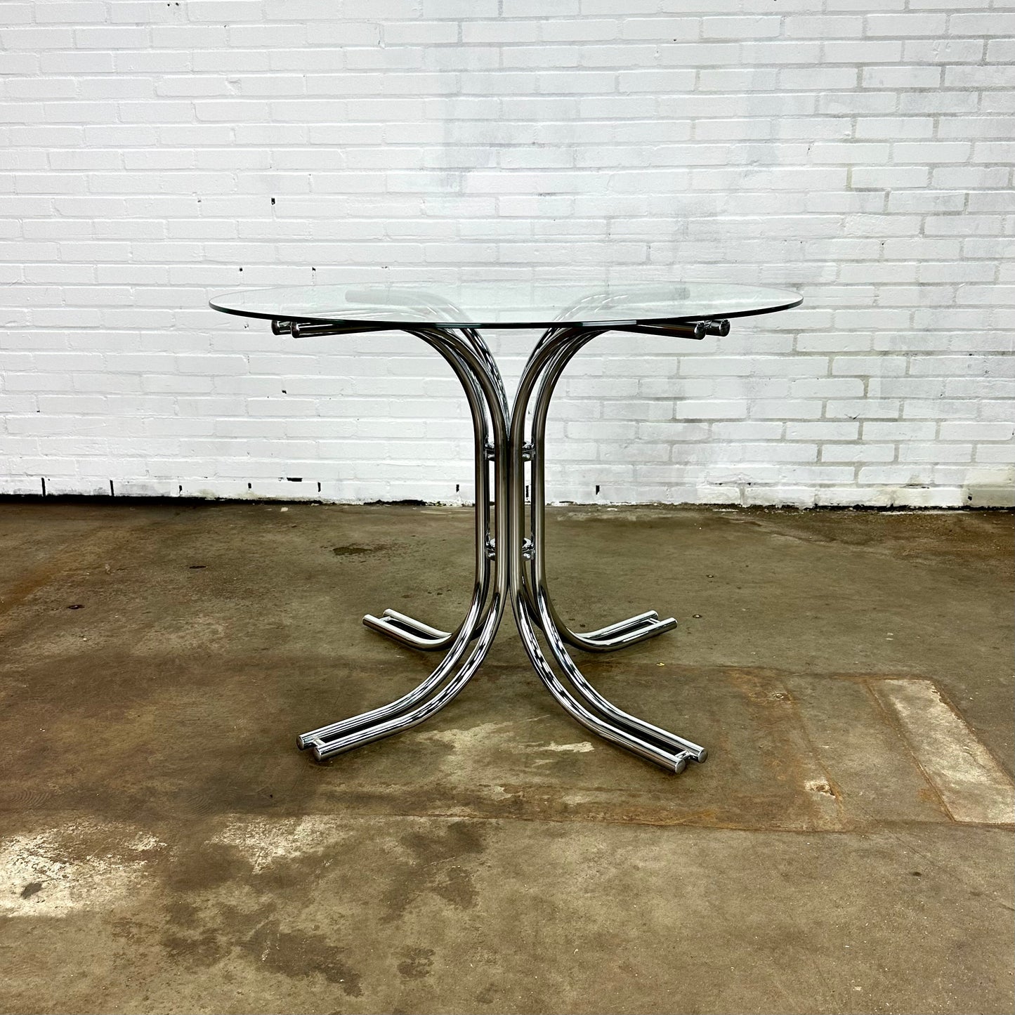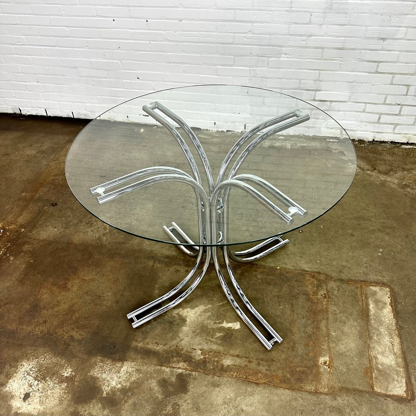 Omschrijving: Italiaanse ronde vintage eettafel met glazen blad en buisframe onderstel