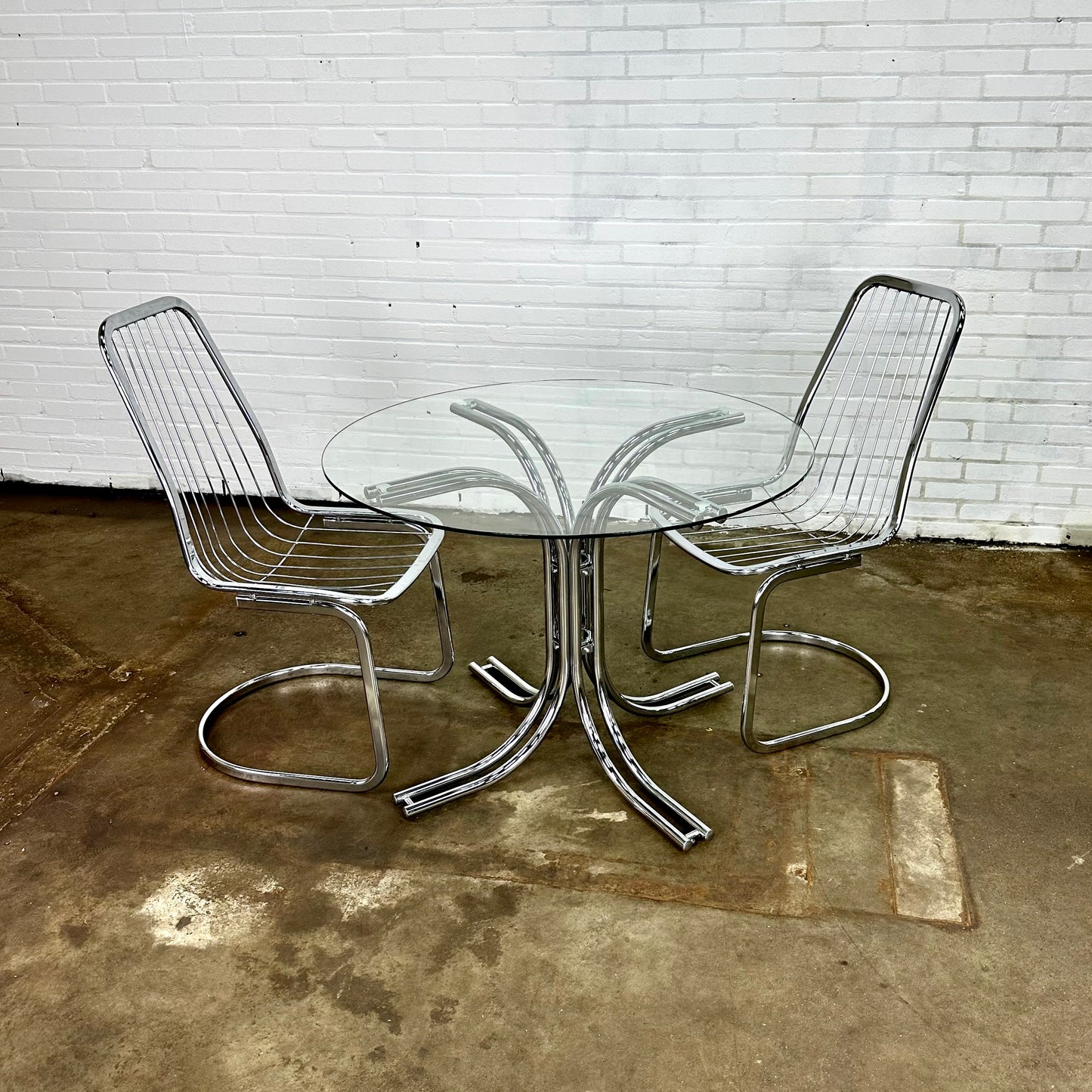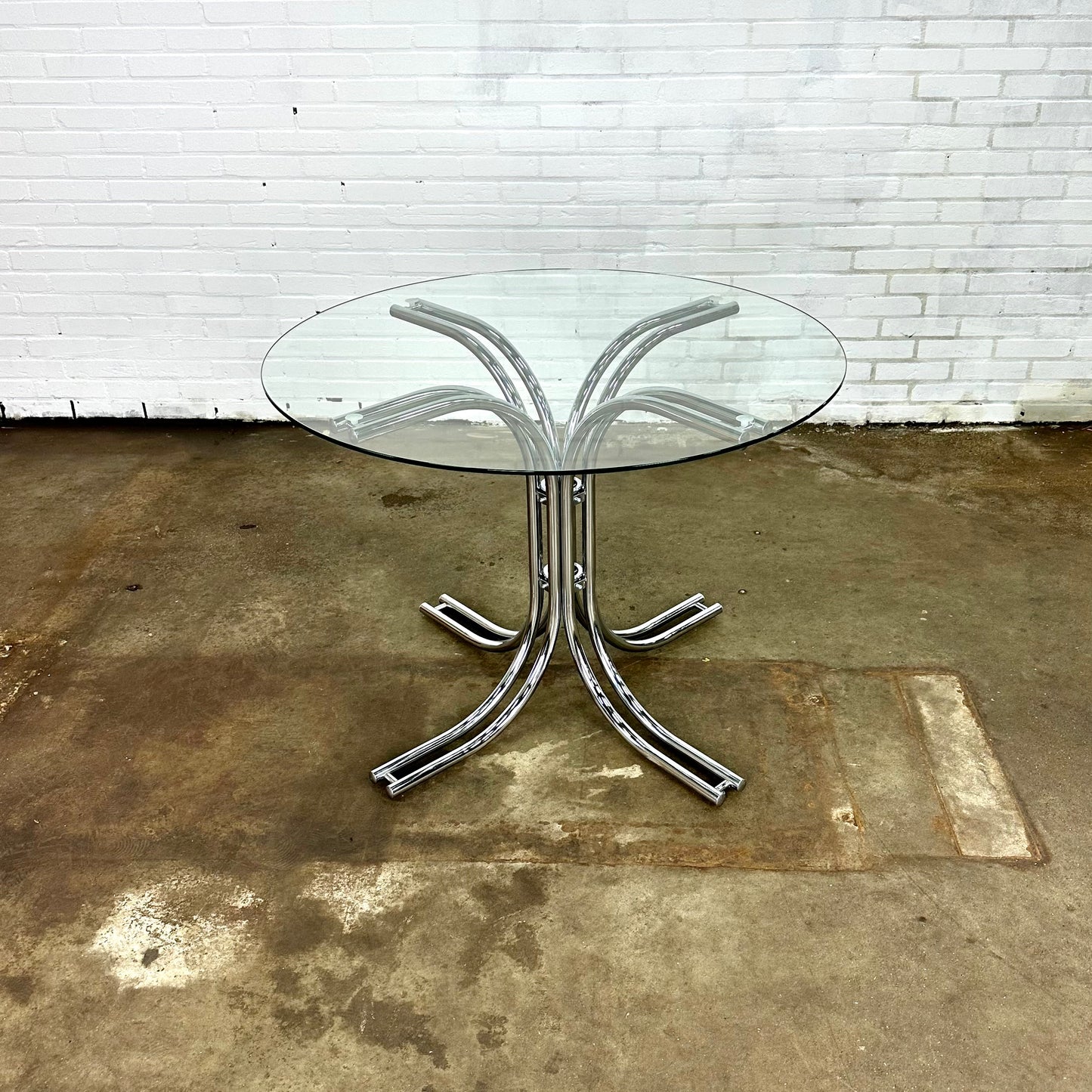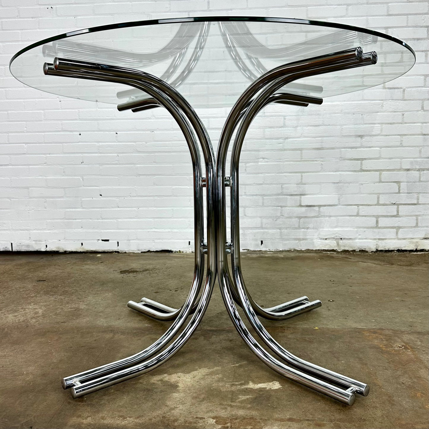Omschrijving: Italiaanse ronde vintage eettafel met glazen blad en buisframe onderstel