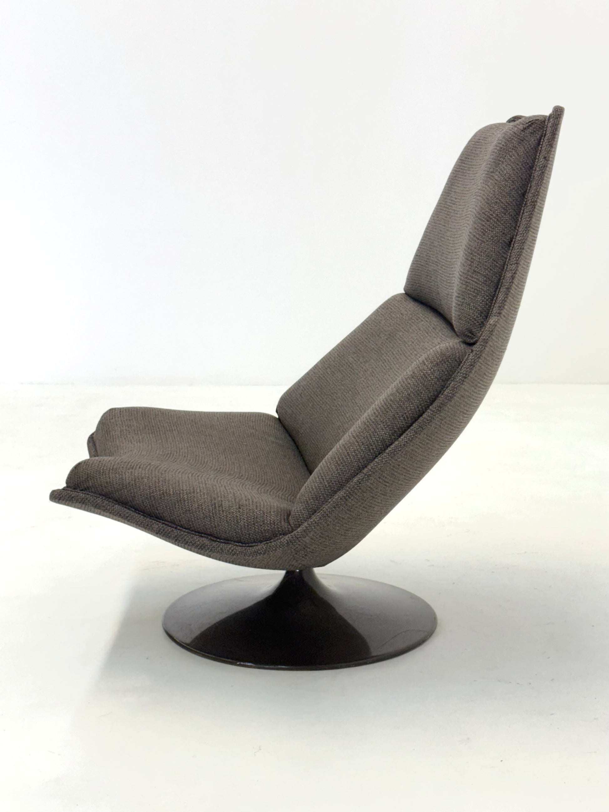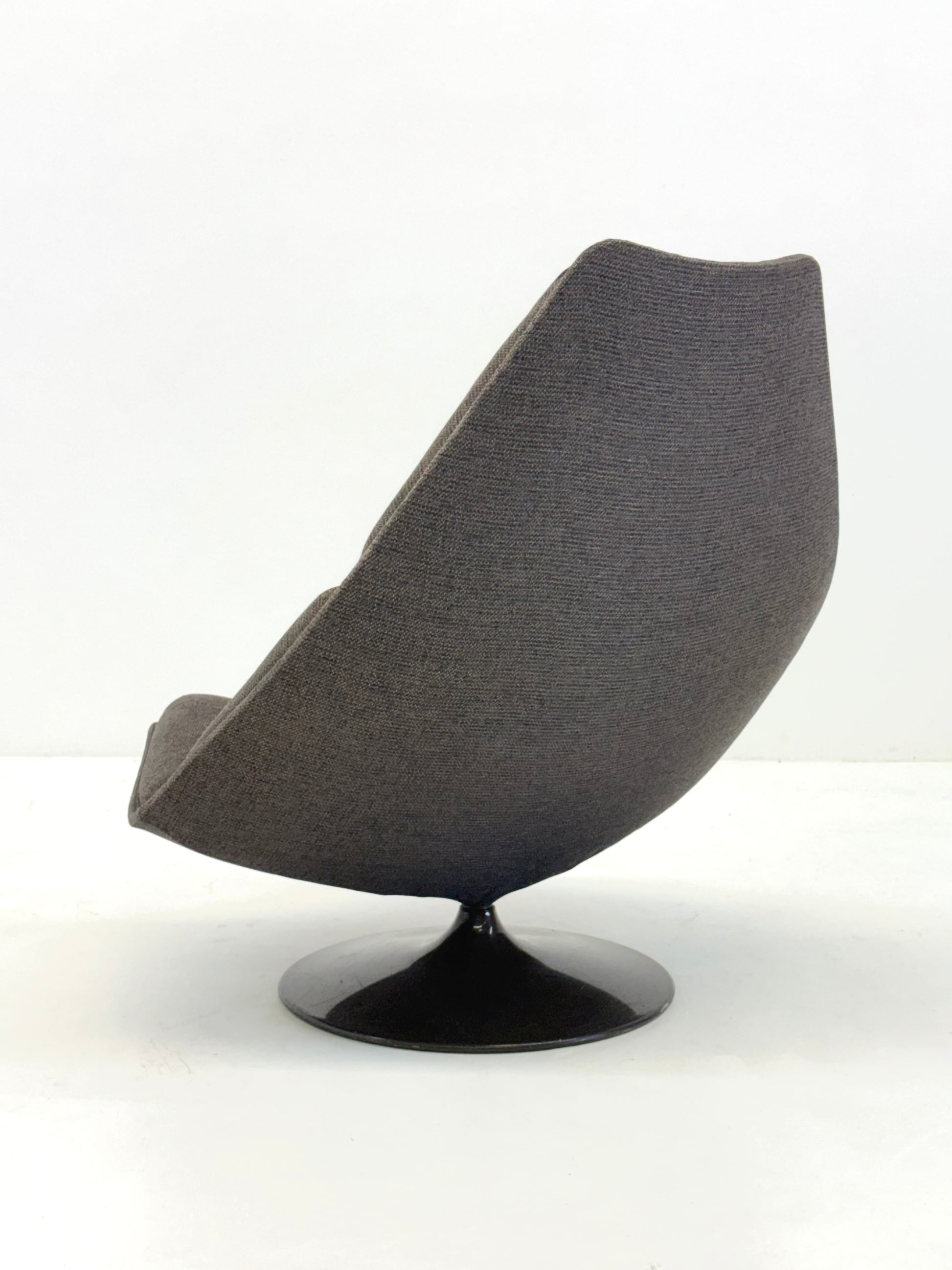 Deze comfortabele fauteuil, model F510, is een iconisch ontwerp van Geoffrey Harcourt voor Artifort uit de jaren ’60. Het model heeft een uitnodigende, omhullende vorm waardoor je er heerlijk in kunt wegzakken. De draaivoet is van metaal en heeft een subtiele kleur tussen grijs en taupe, wat mooi contrasteert met de nieuwe, donkergrijze stof waarin de stoel volledig is herbekleed.