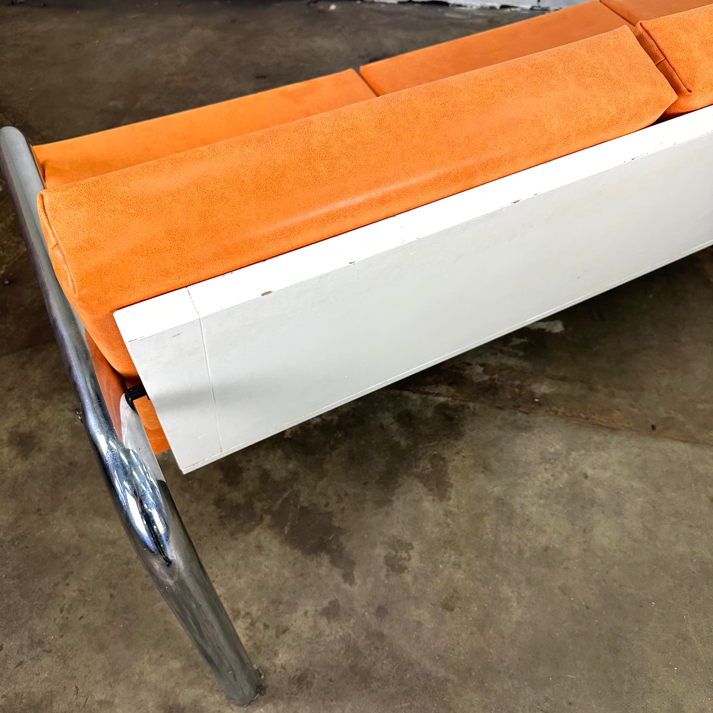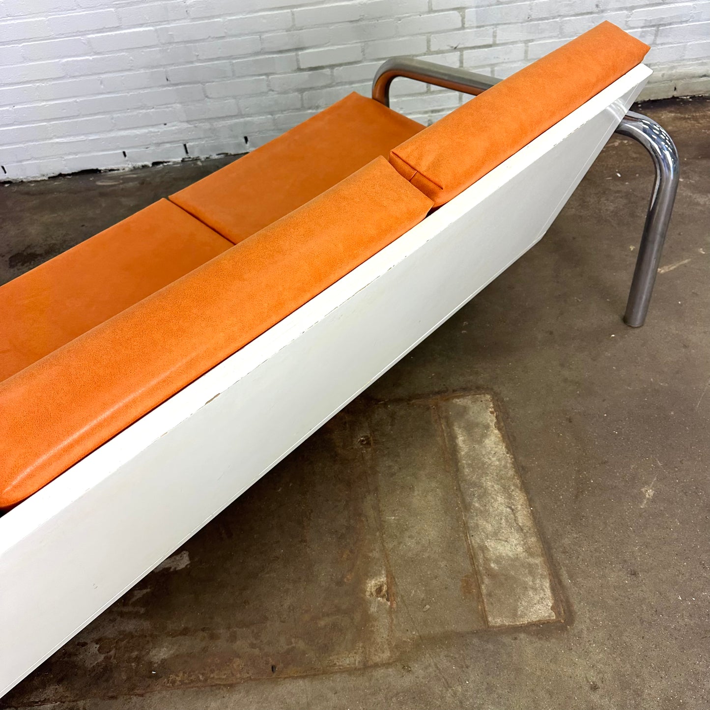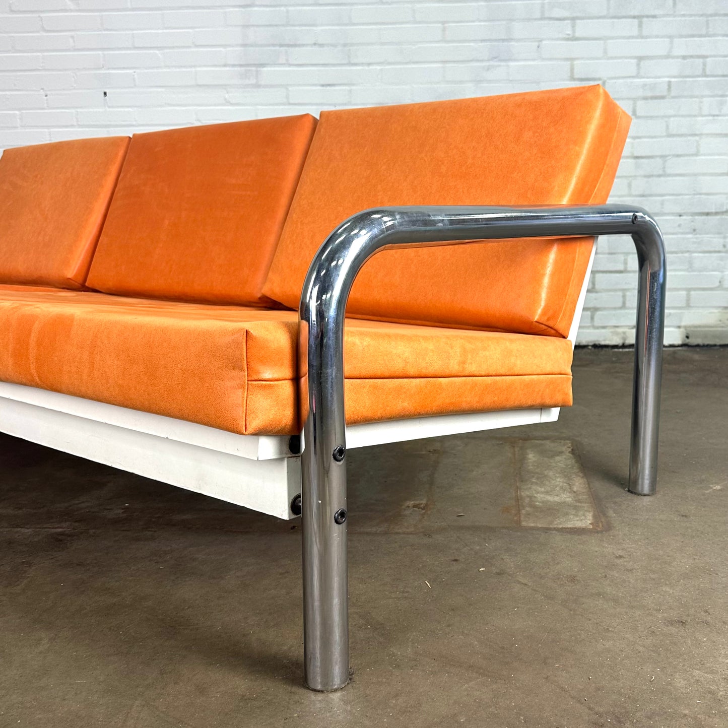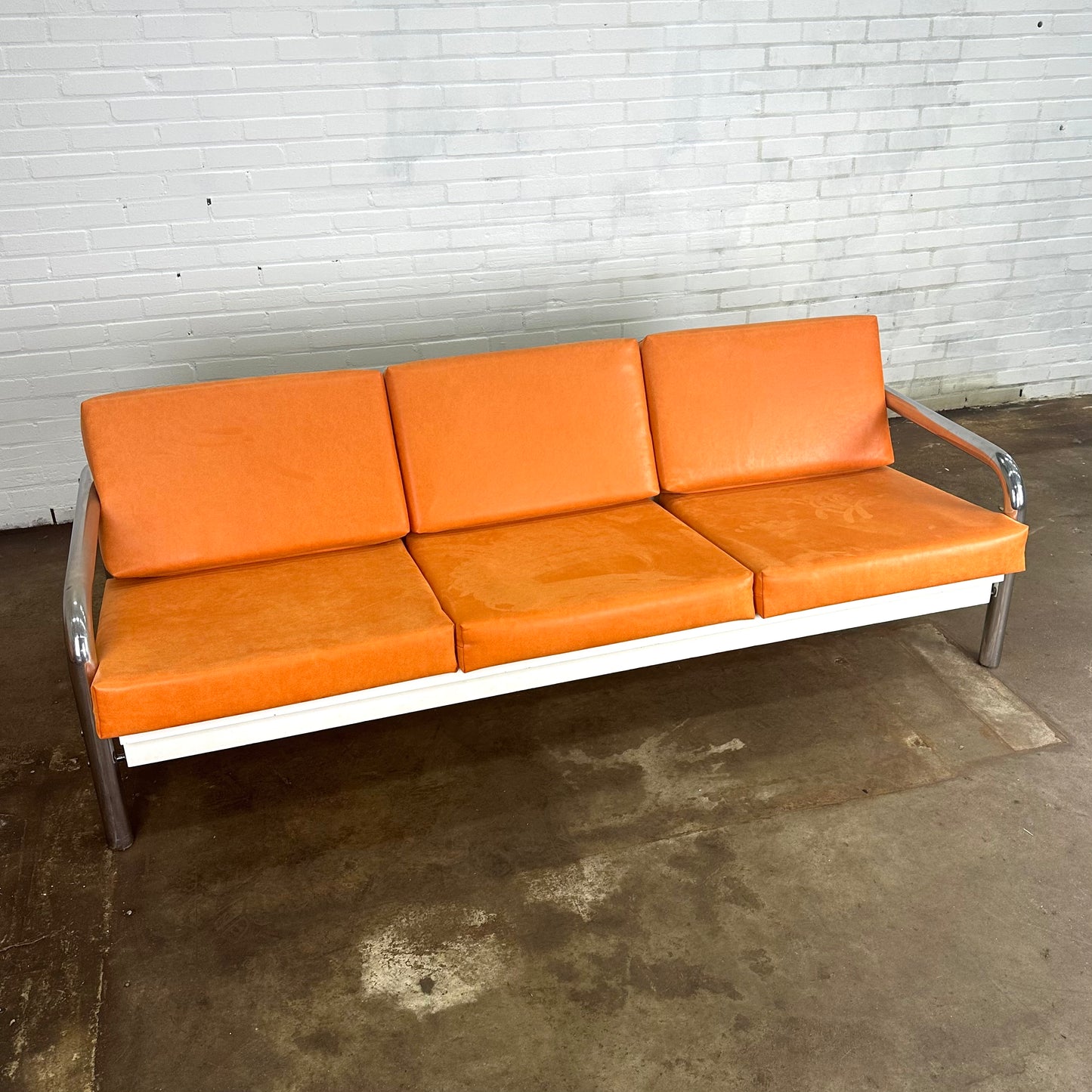 Omschrijving: oranje Gelderland bank met buisframe. De bekleding is opnieuw gestoffeerd!