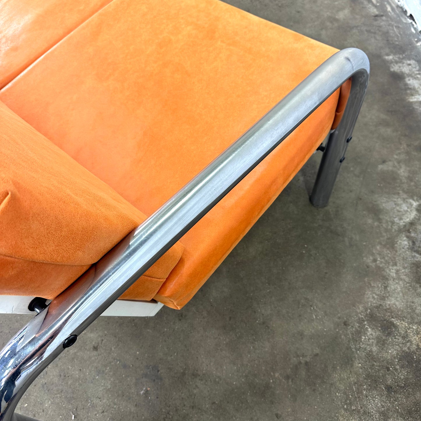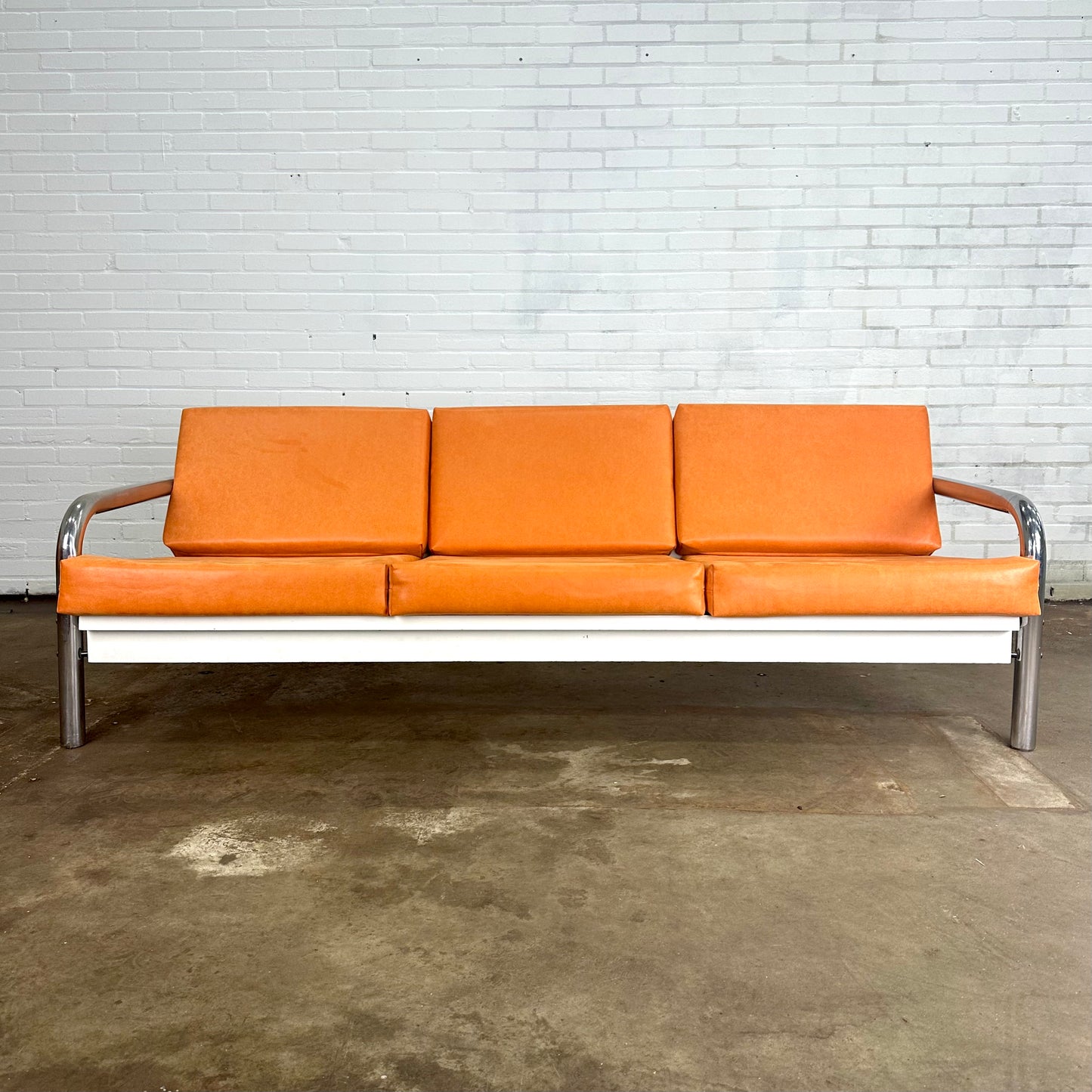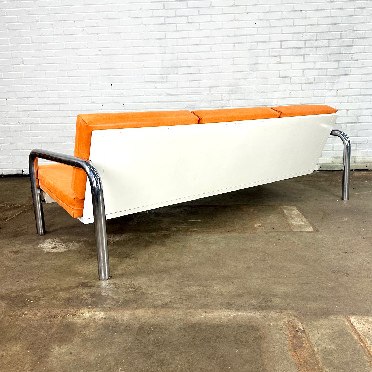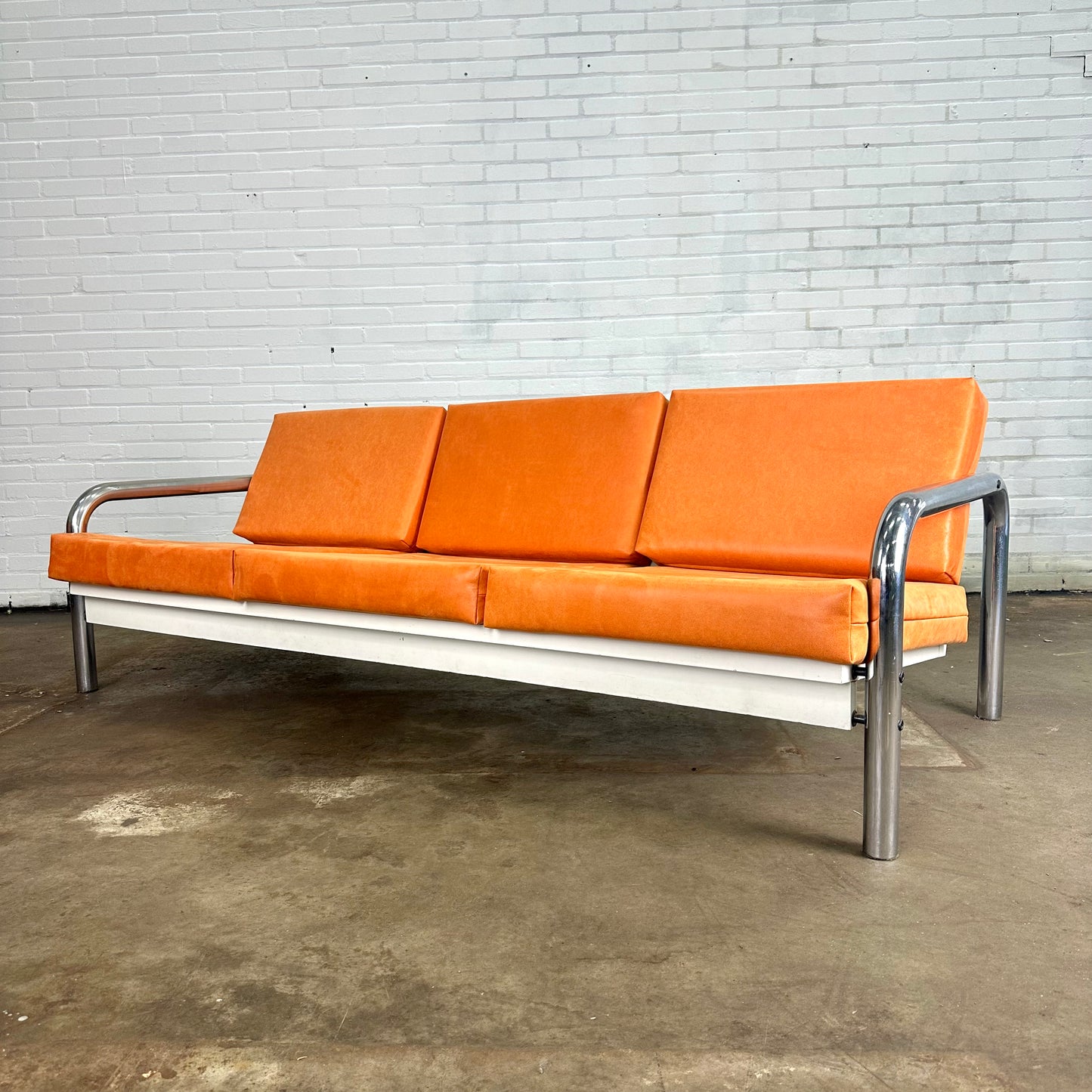 Omschrijving: oranje Gelderland bank met buisframe. De bekleding is opnieuw gestoffeerd!