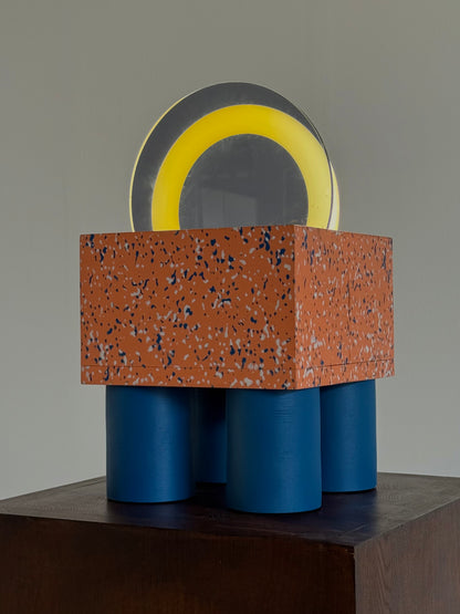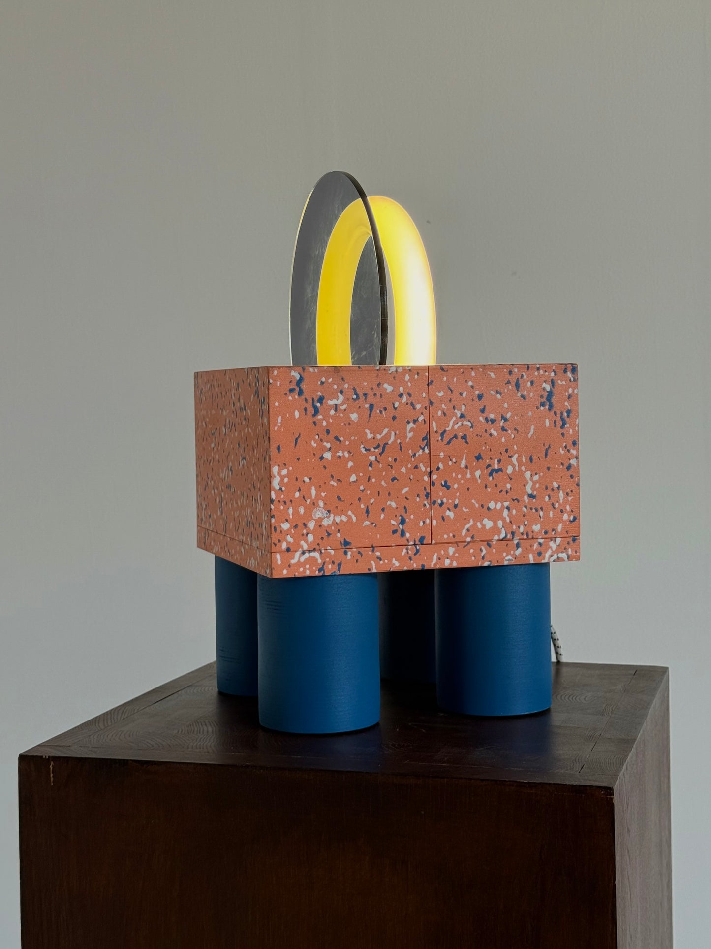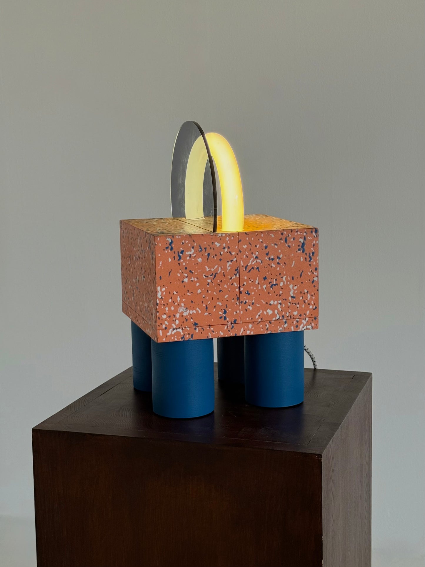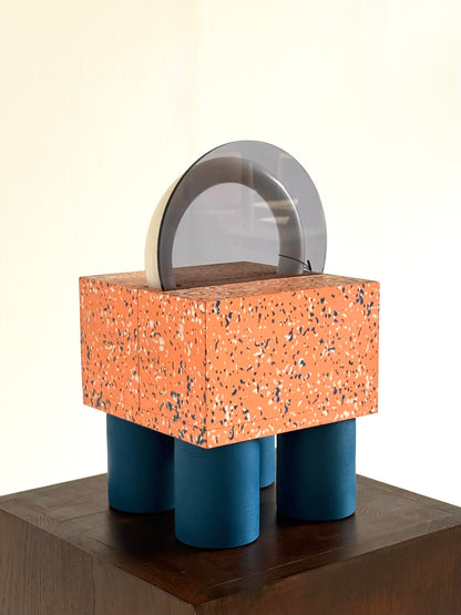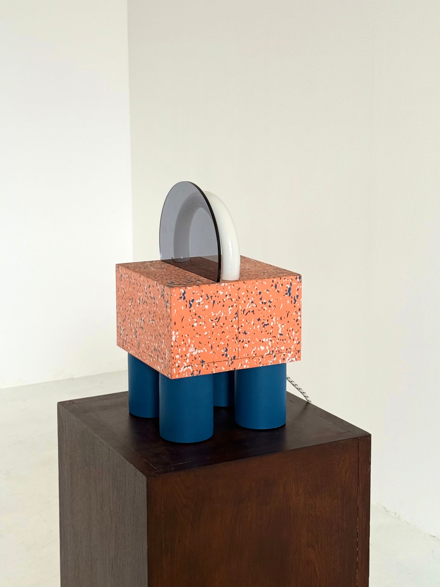 Unieke tafellamp in Memphis- of postmodernistische stijl, met een uitgesproken sculpturaal karakter. De lamp doet qua vormtaal sterk denken aan ontwerpen van Ettore Sottsass of Gio Schiano, met een spel tussen geometrie, kleur en materiaal.