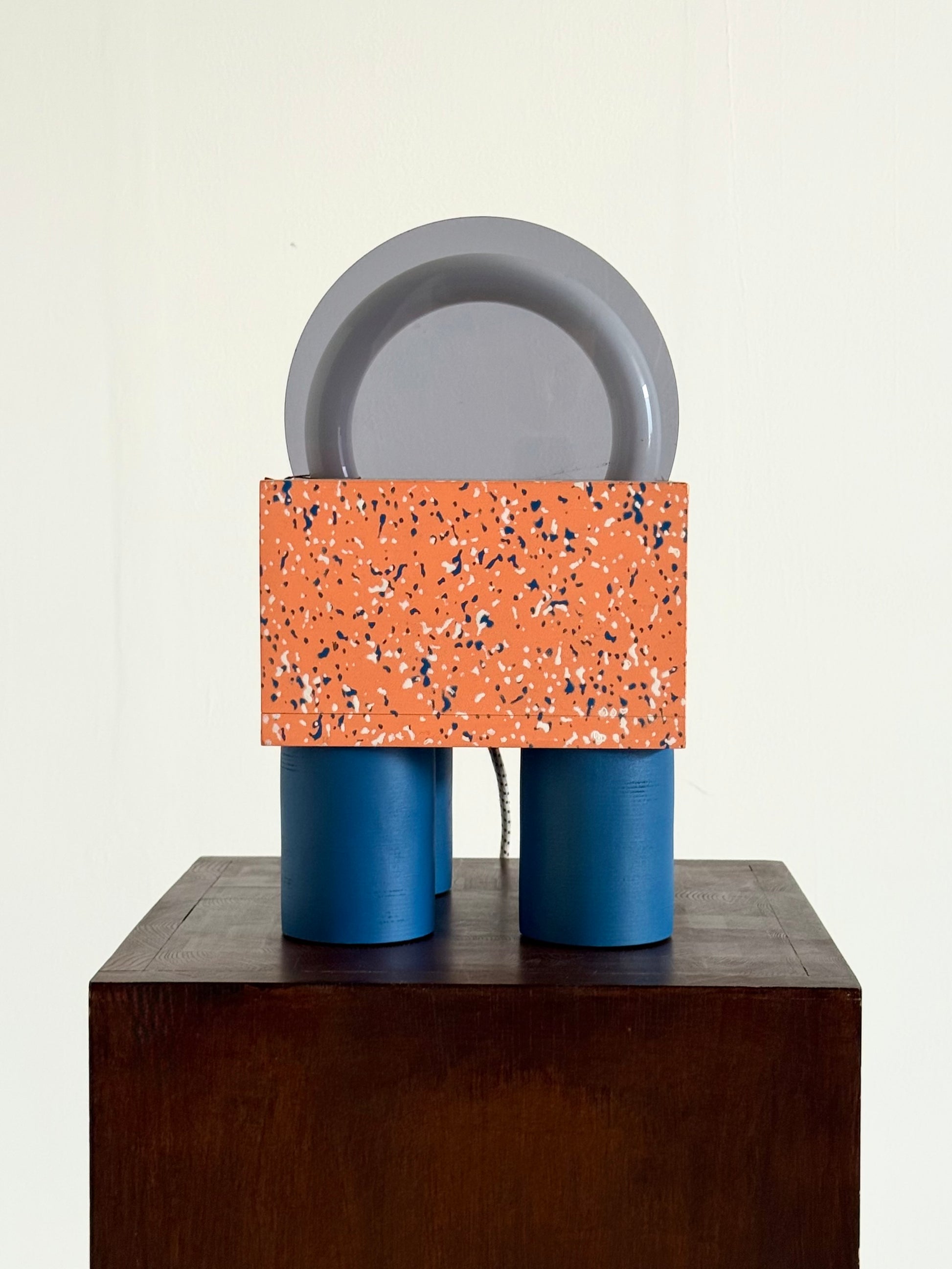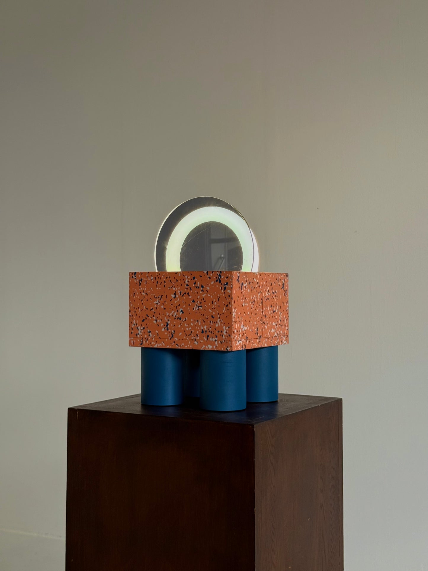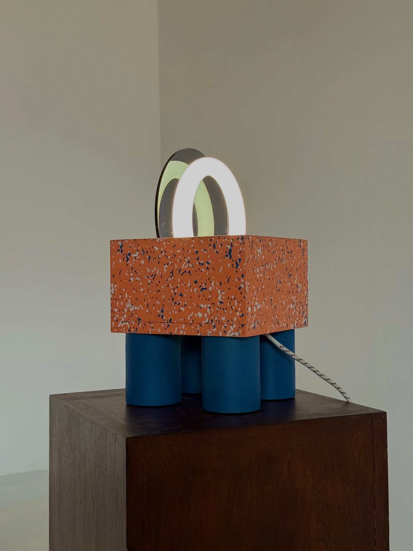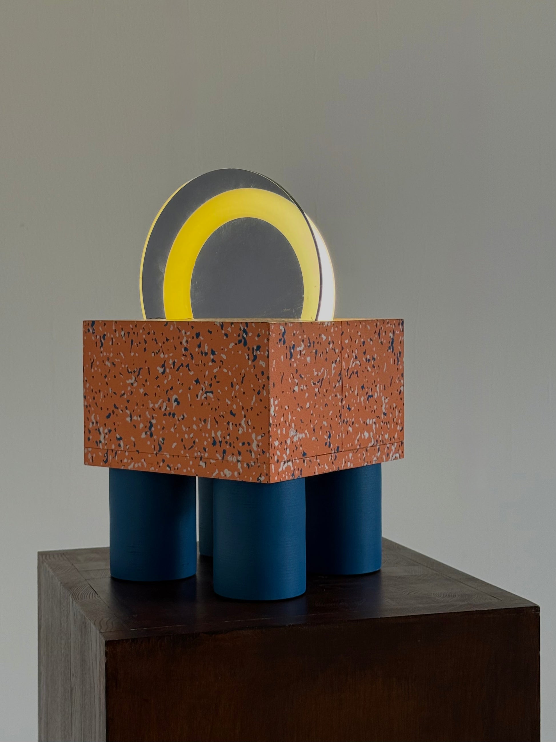 Unieke tafellamp in Memphis- of postmodernistische stijl, met een uitgesproken sculpturaal karakter. De lamp doet qua vormtaal sterk denken aan ontwerpen van Ettore Sottsass of Gio Schiano, met een spel tussen geometrie, kleur en materiaal.