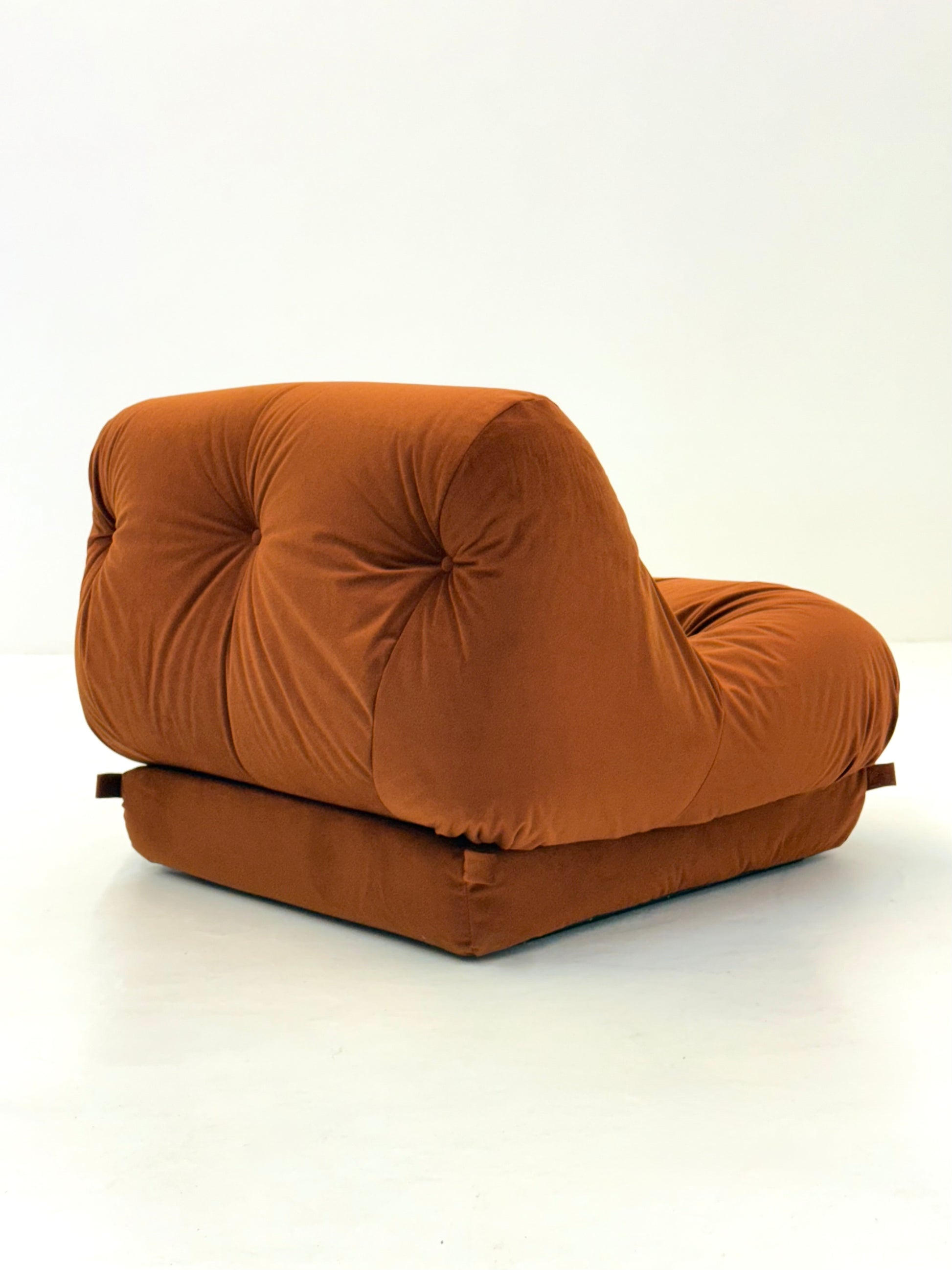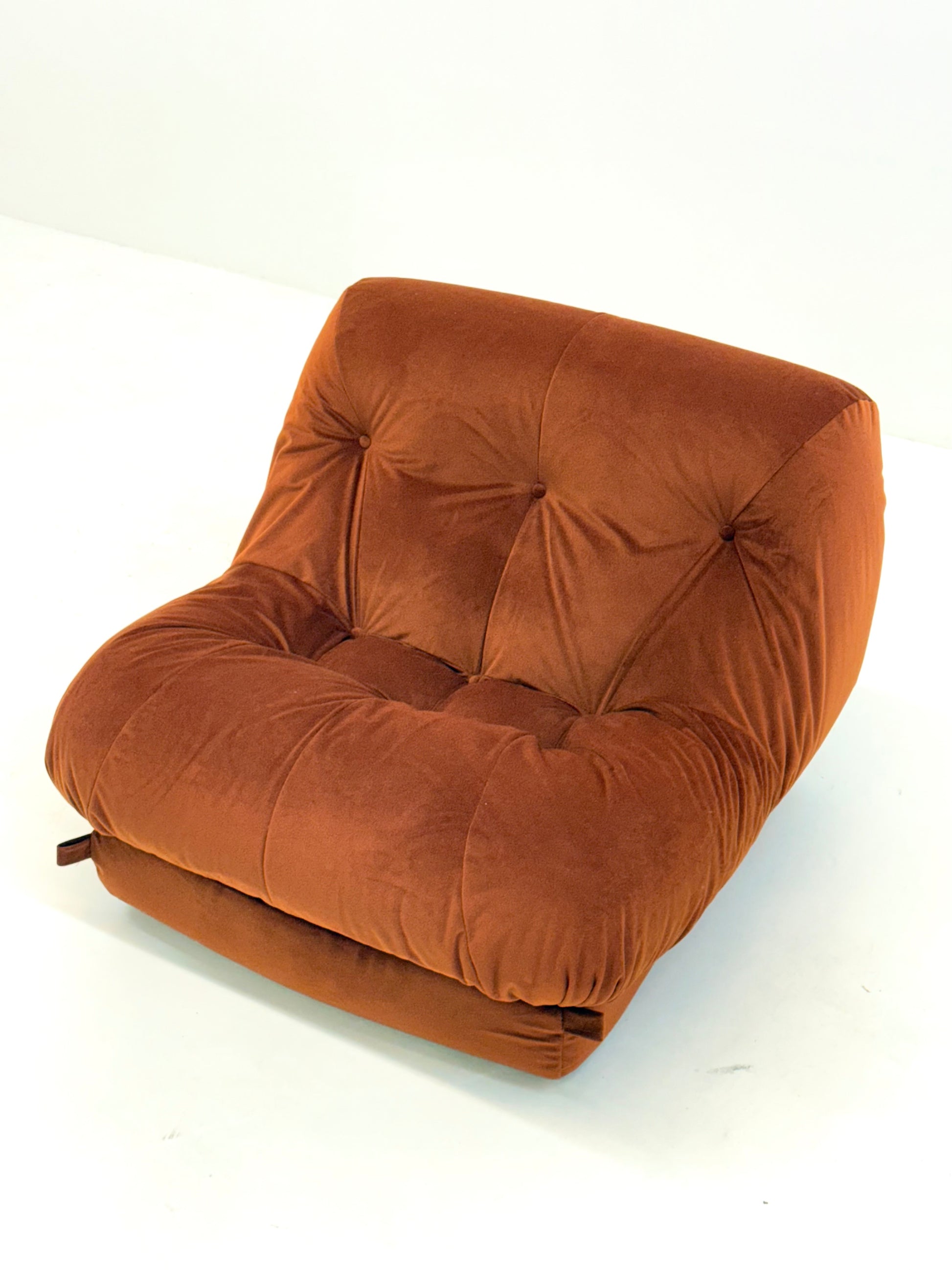 Dit exemplaar is volledig opnieuw gestoffeerd in een velvet stof in een warme terracotta-oranje kleur. De fluweelachtige structuur benadrukt de organische lijnen van het ontwerp en geeft de fauteuil een eigentijdse, luxe uitstraling.