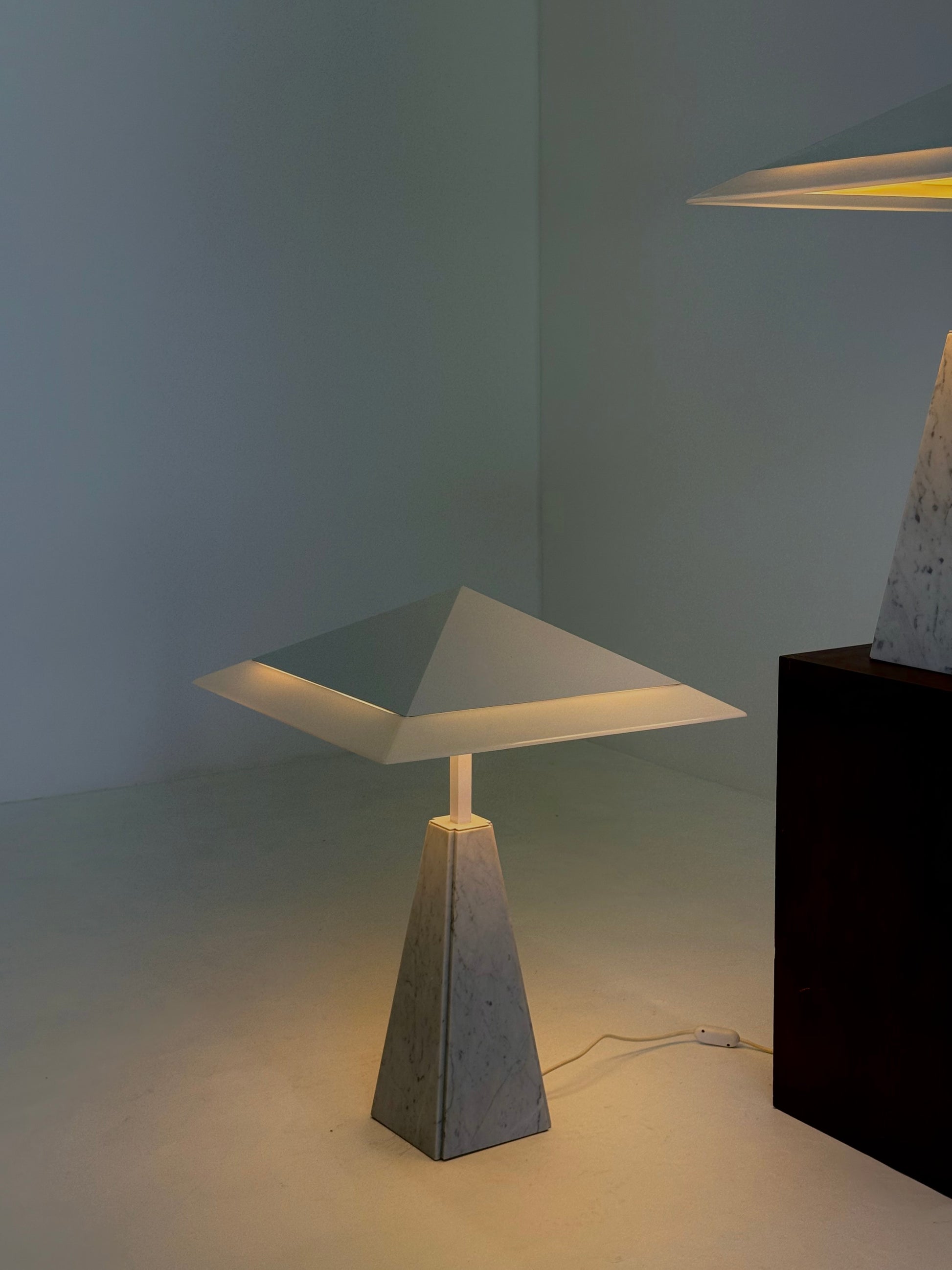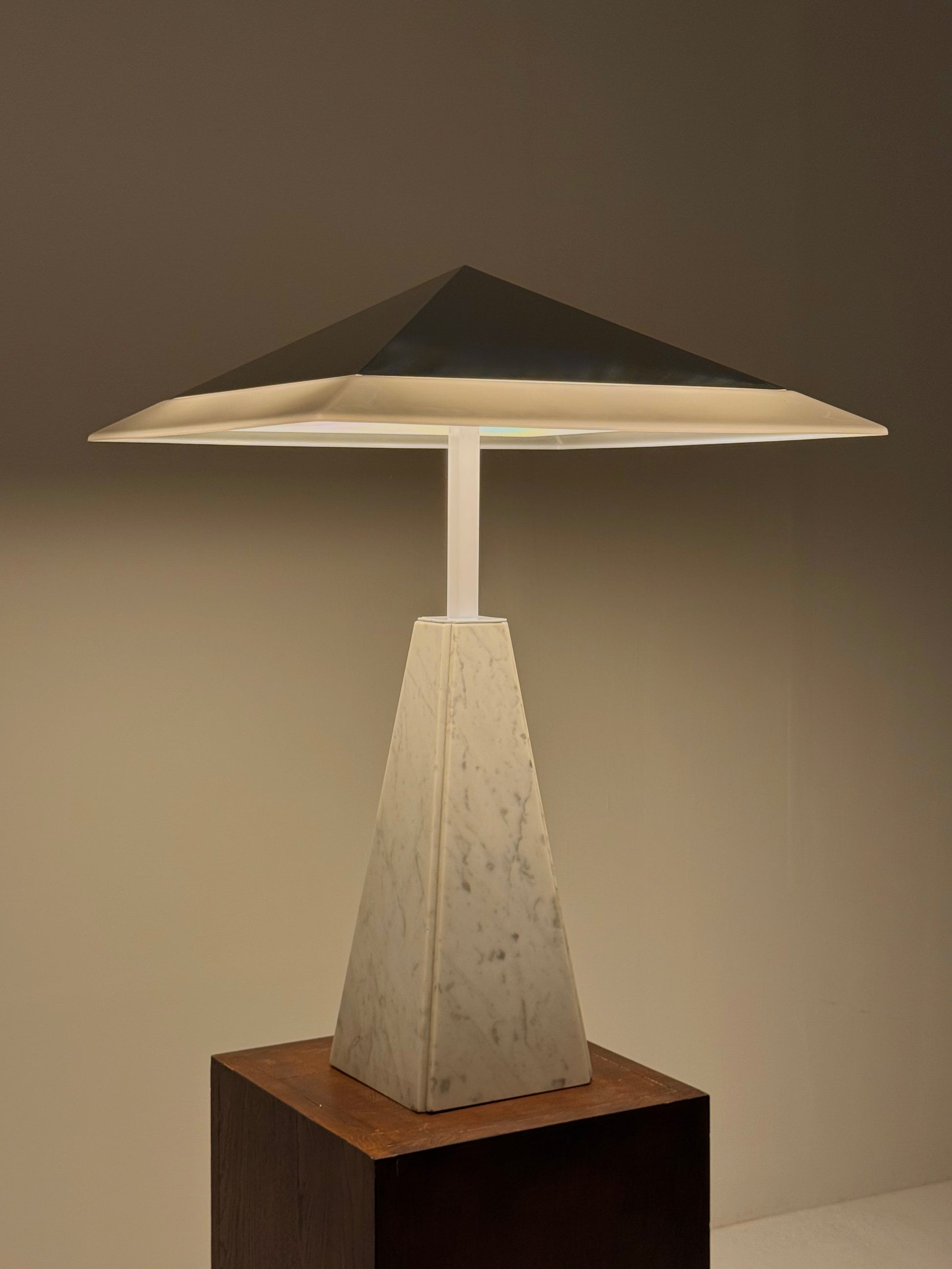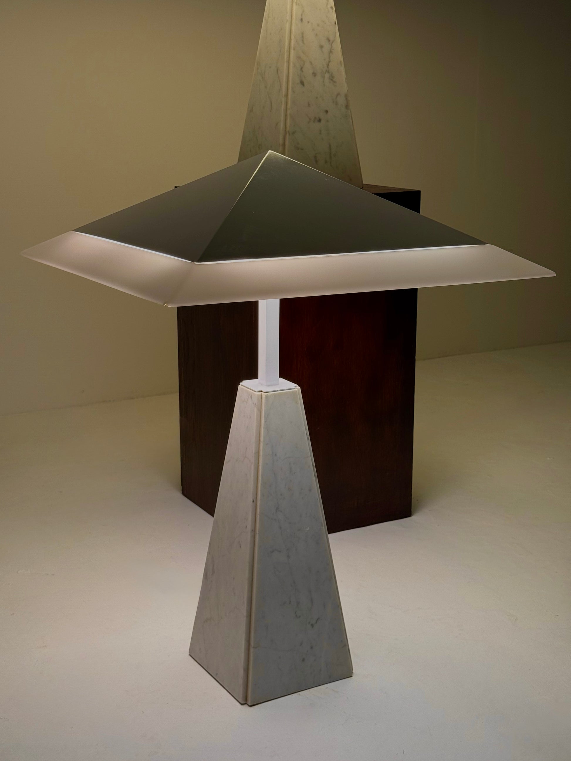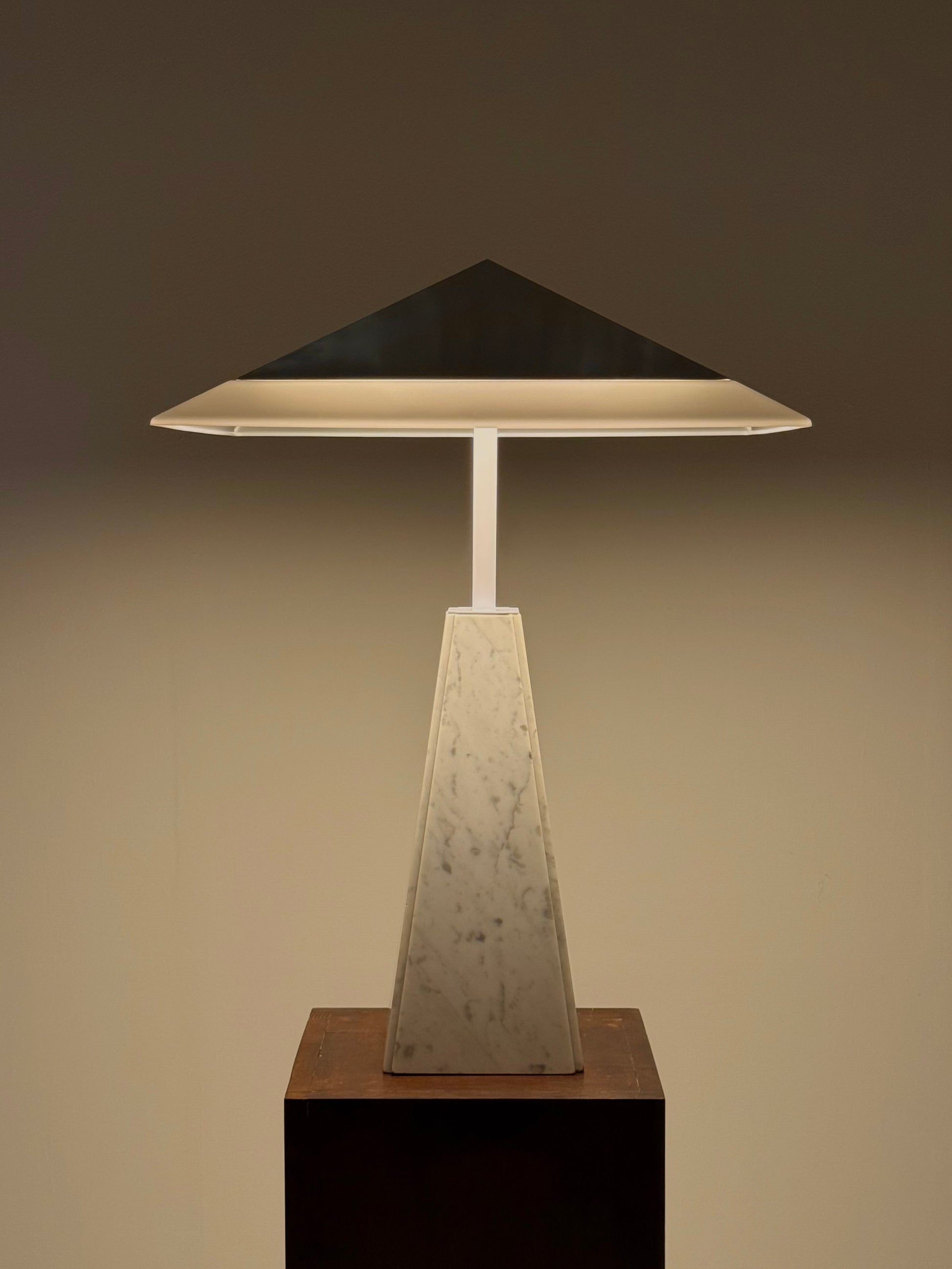 Deze iconische “Abat Jour” tafellamp, ontworpen door Cini Boeri in de jaren 70 voor Arteluce. De lamp heeft een piramidevormige basis van wit marmer en een methacrylaat kap, gedragen door een strak wit metalen frame. Het ontwerp combineert elegantie met minimalistische vormgeving en wordt wereldwijd erkend in designmusea, waaronder het Triennale Design Museum in Milaan.