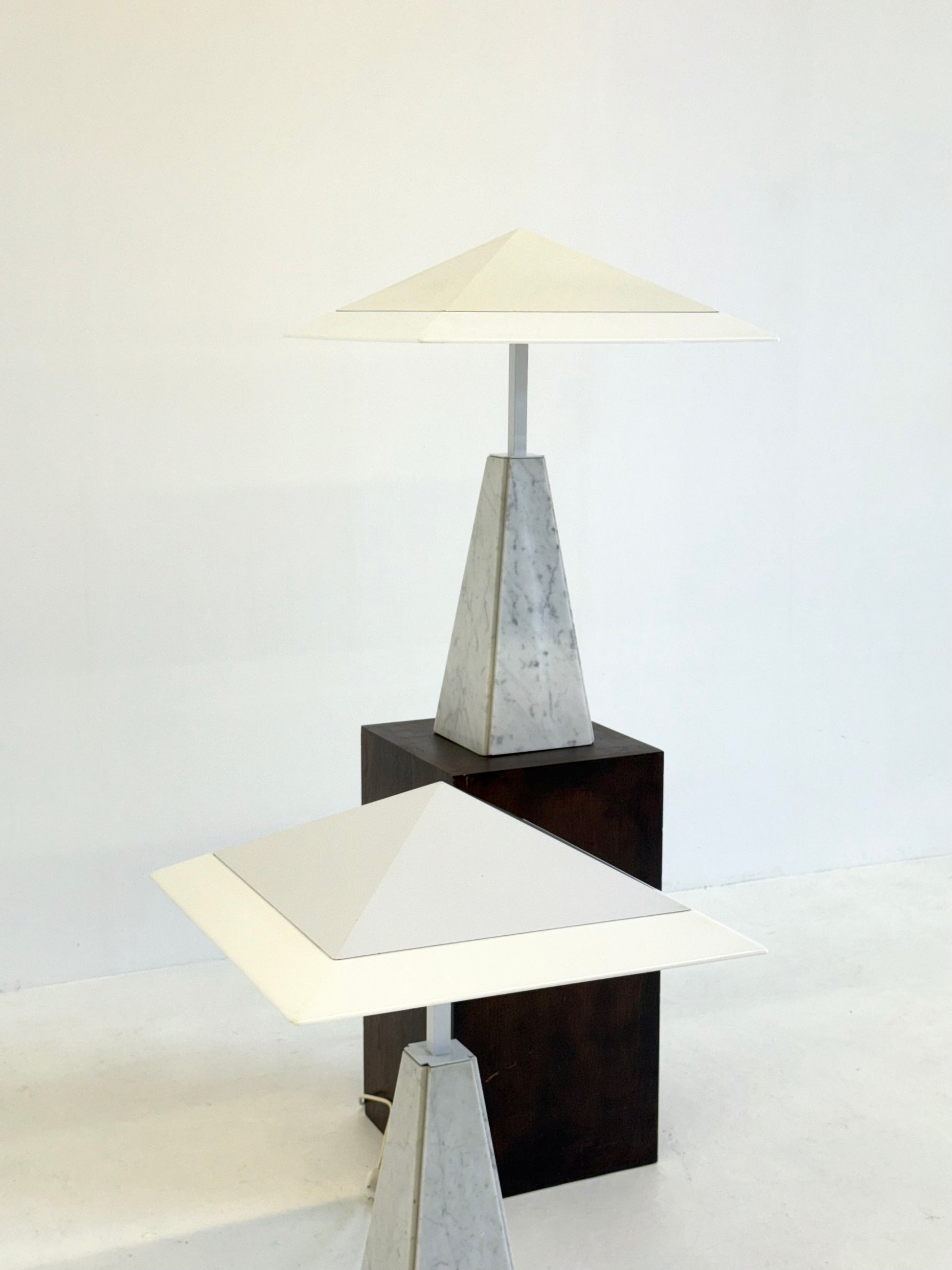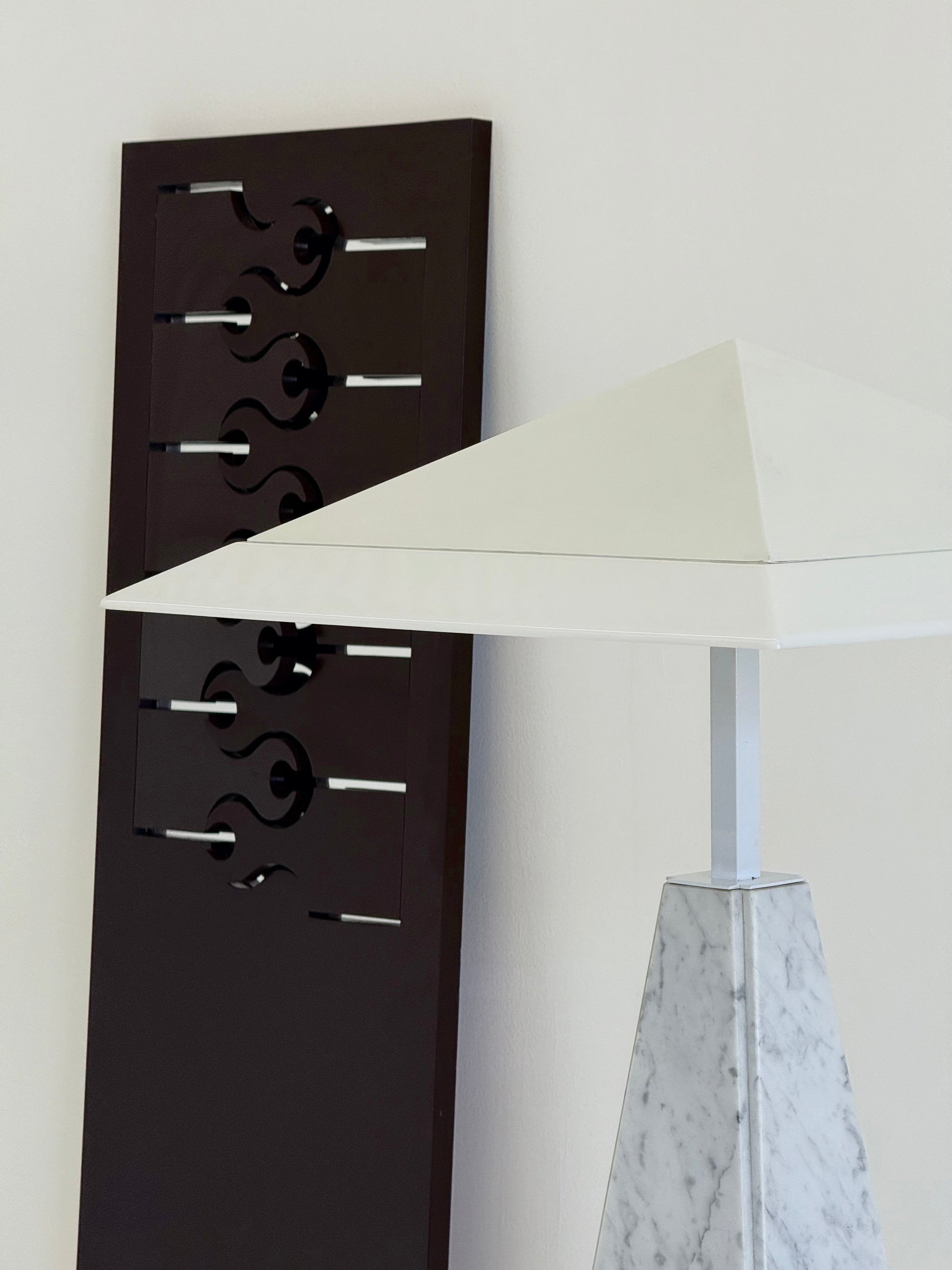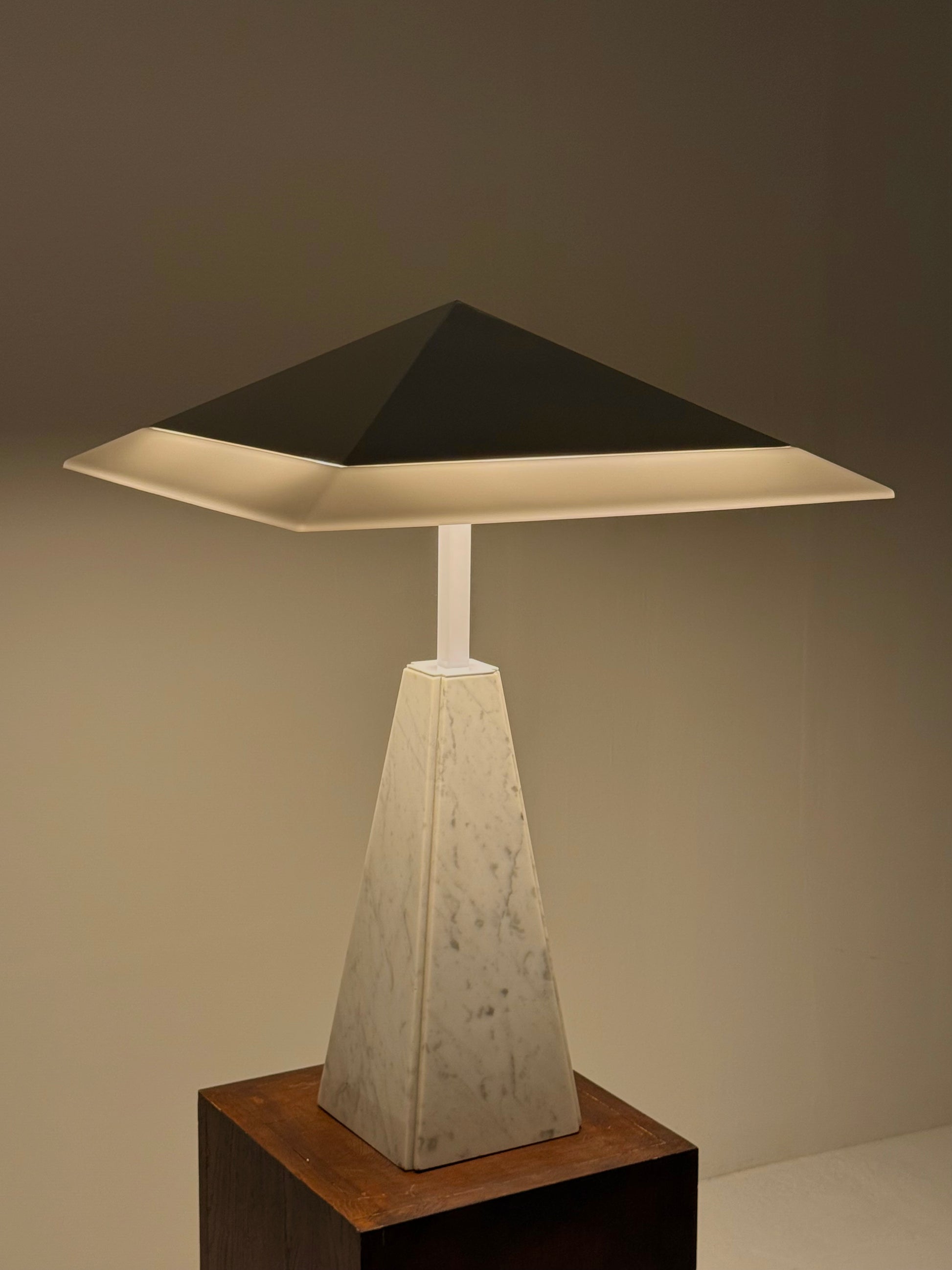 Deze iconische “Abat Jour” tafellamp, ontworpen door Cini Boeri in de jaren 70 voor Arteluce. De lamp heeft een piramidevormige basis van wit marmer en een methacrylaat kap, gedragen door een strak wit metalen frame. Het ontwerp combineert elegantie met minimalistische vormgeving en wordt wereldwijd erkend in designmusea, waaronder het Triennale Design Museum in Milaan.