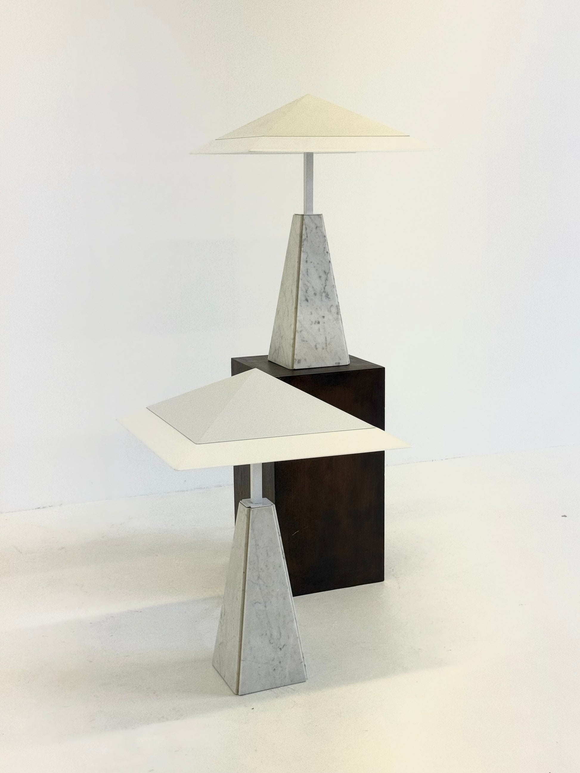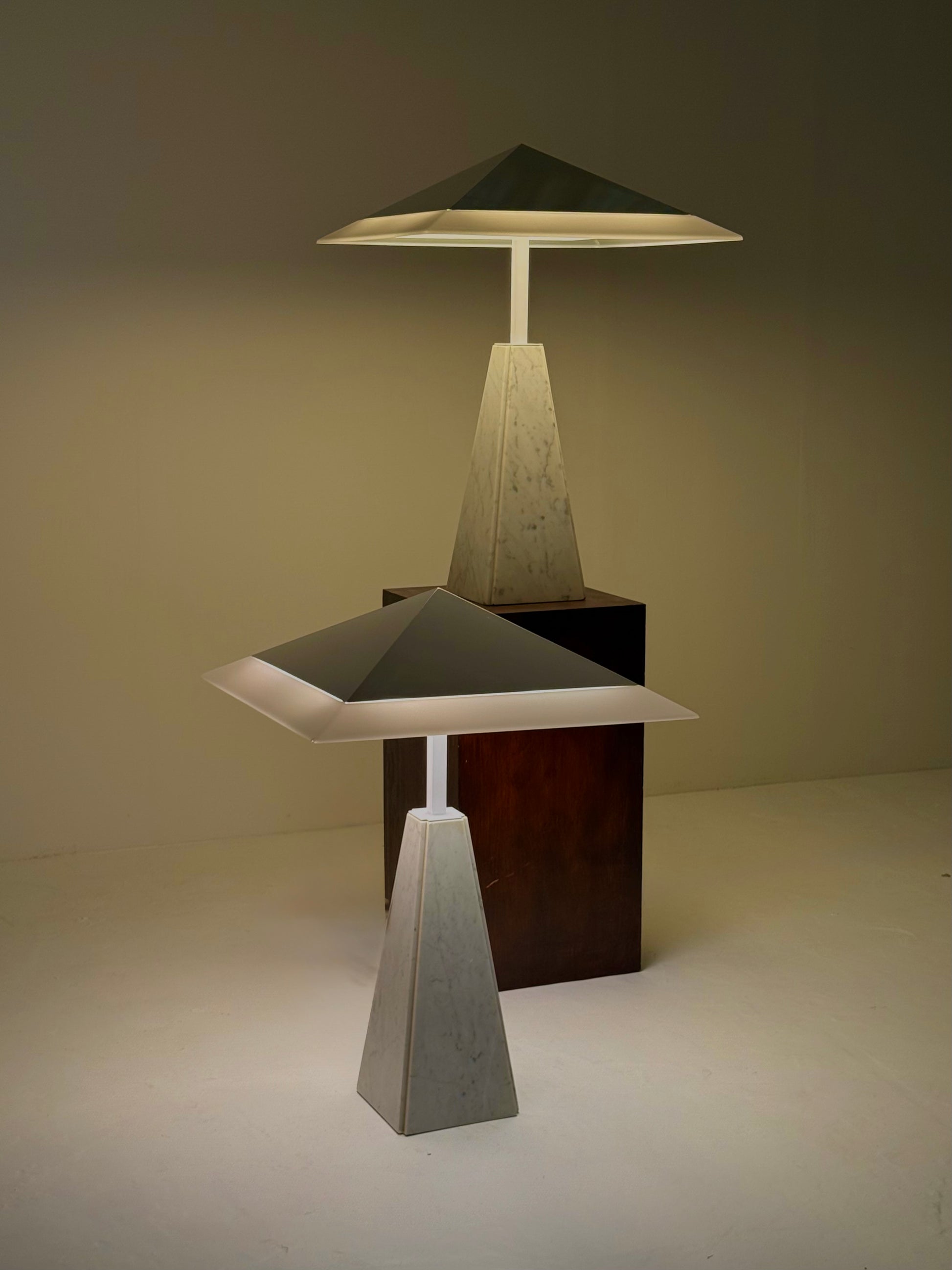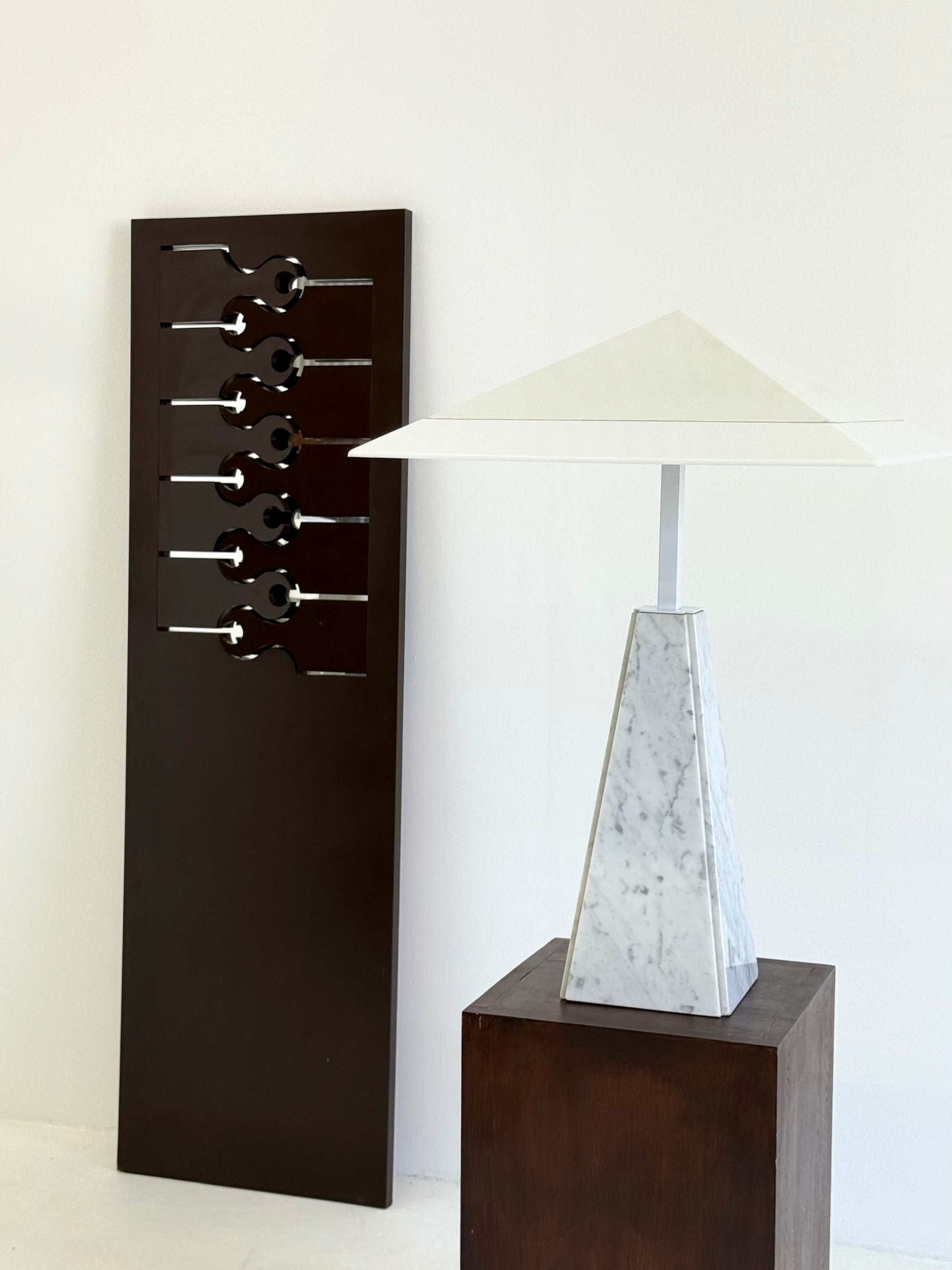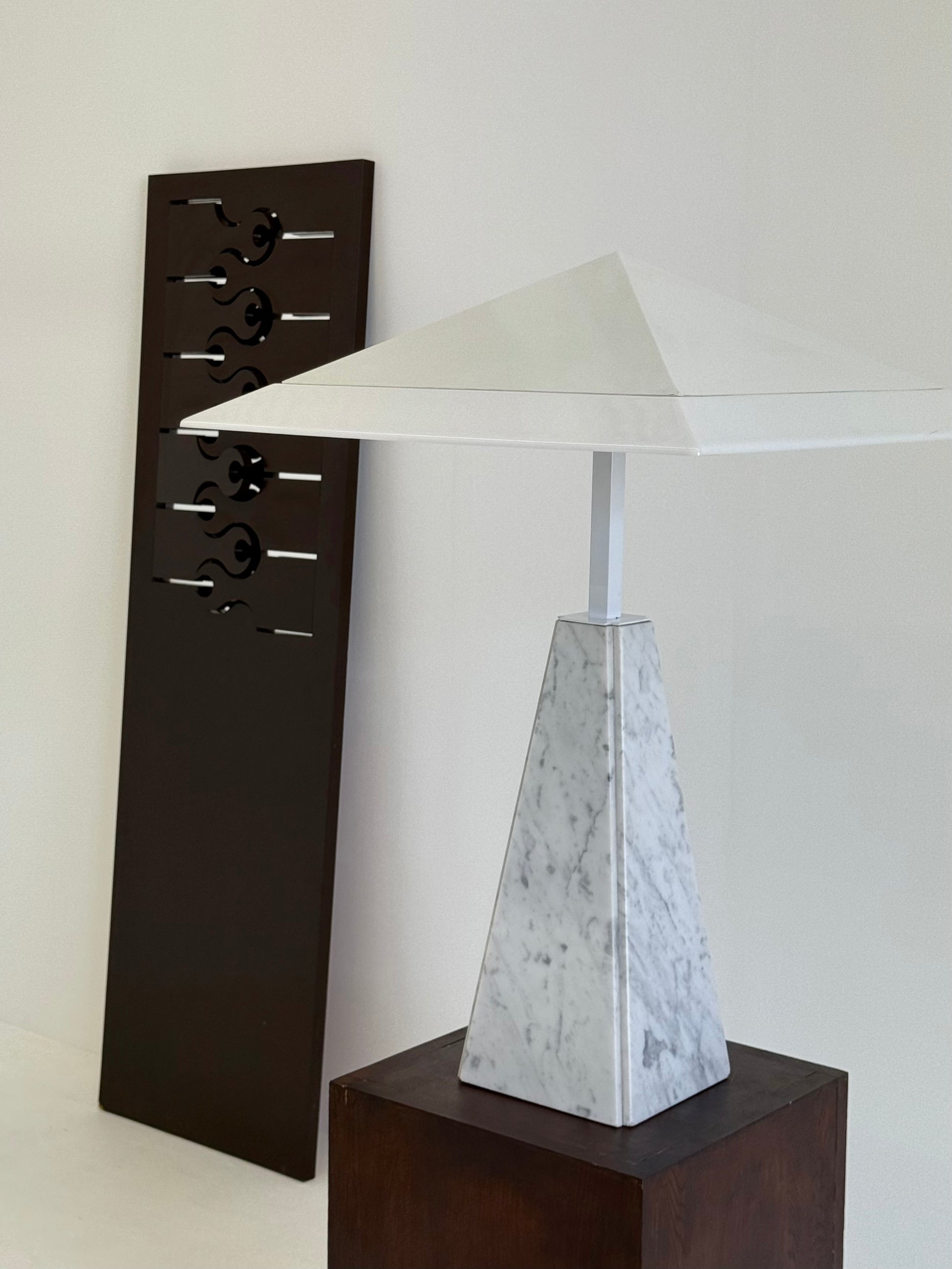 Deze iconische “Abat Jour” tafellamp, ontworpen door Cini Boeri in de jaren 70 voor Arteluce. De lamp heeft een piramidevormige basis van wit marmer en een methacrylaat kap, gedragen door een strak wit metalen frame. Het ontwerp combineert elegantie met minimalistische vormgeving en wordt wereldwijd erkend in designmusea, waaronder het Triennale Design Museum in Milaan.