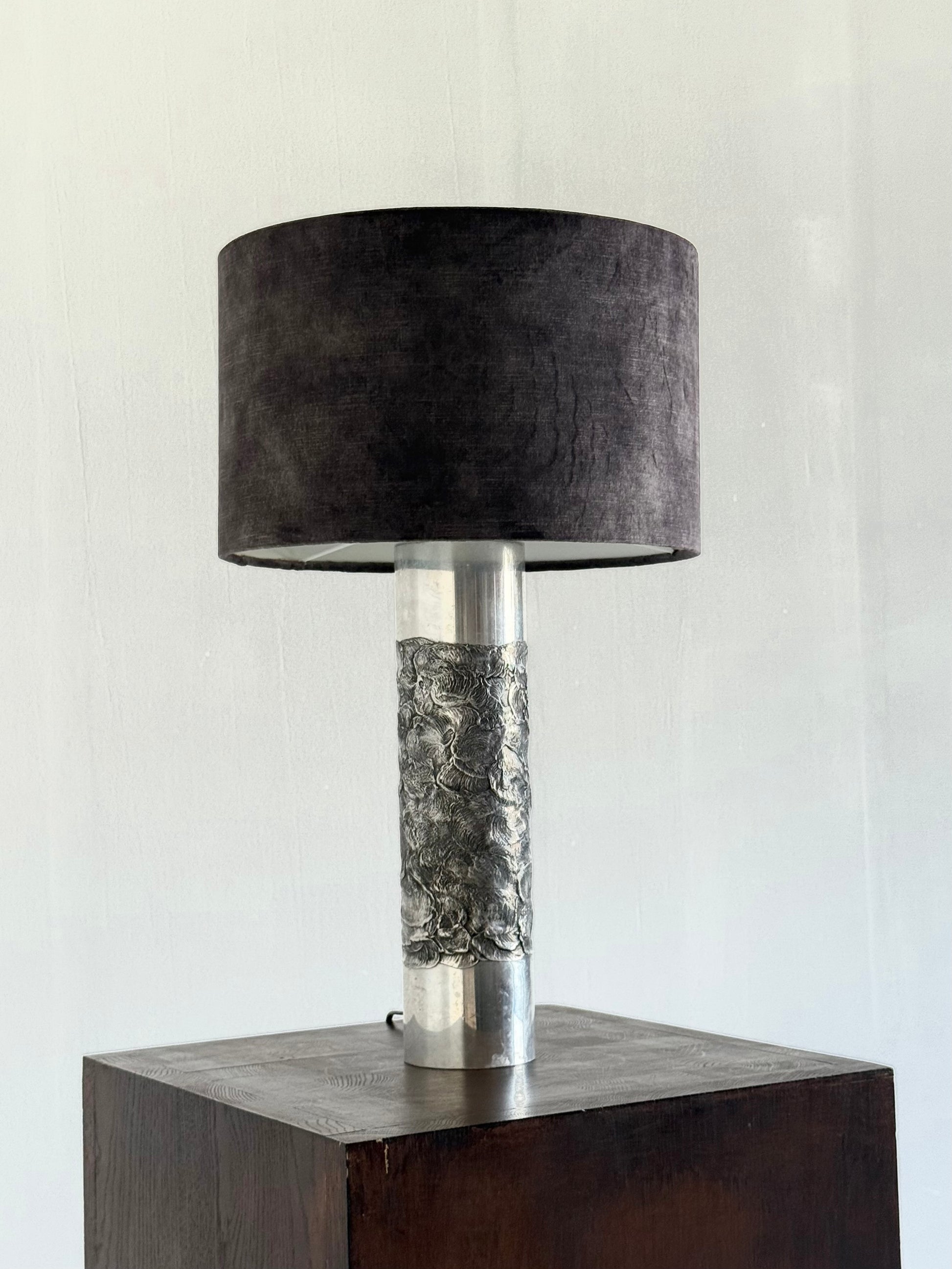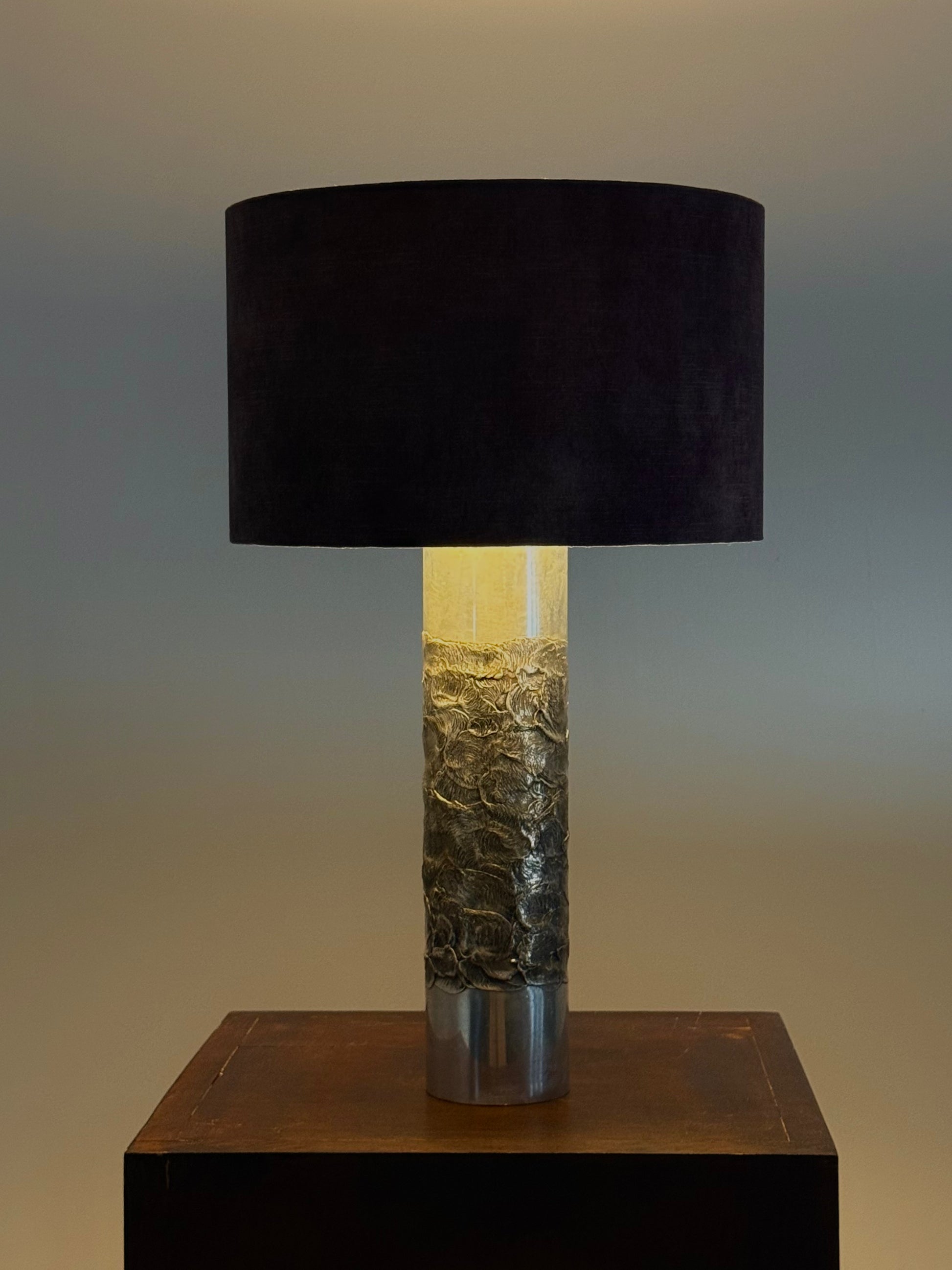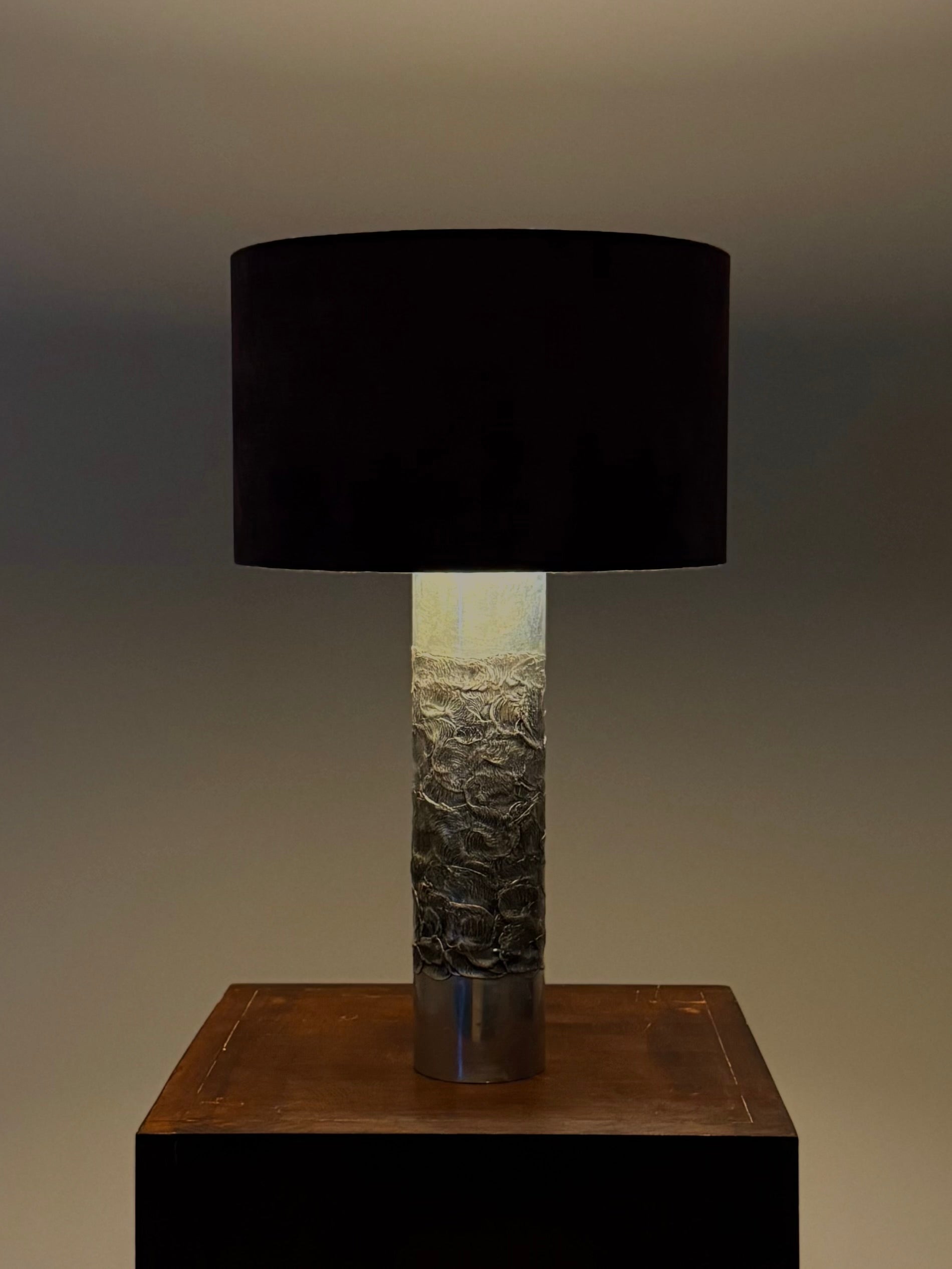 Deze lamp is een prachtig voorbeeld van de kenmerkende brutalistische stijl van Luyckx, met robuuste vormen en een industriële uitstraling. Aluclair produceerde in deze periode een reeks unieke objecten, waaronder asbakken, kandelaars en diverse lampen in hetzelfde gebrande aluminium, waarbij vakmanschap en originaliteit centraal stonden.