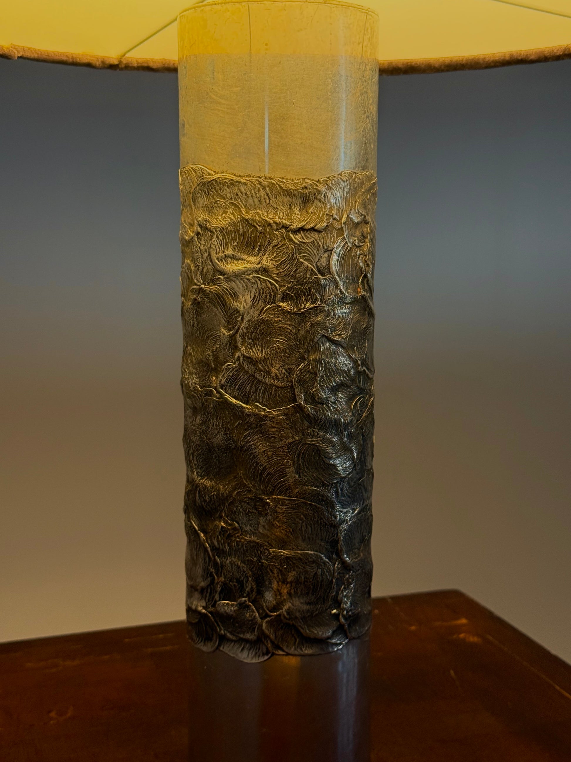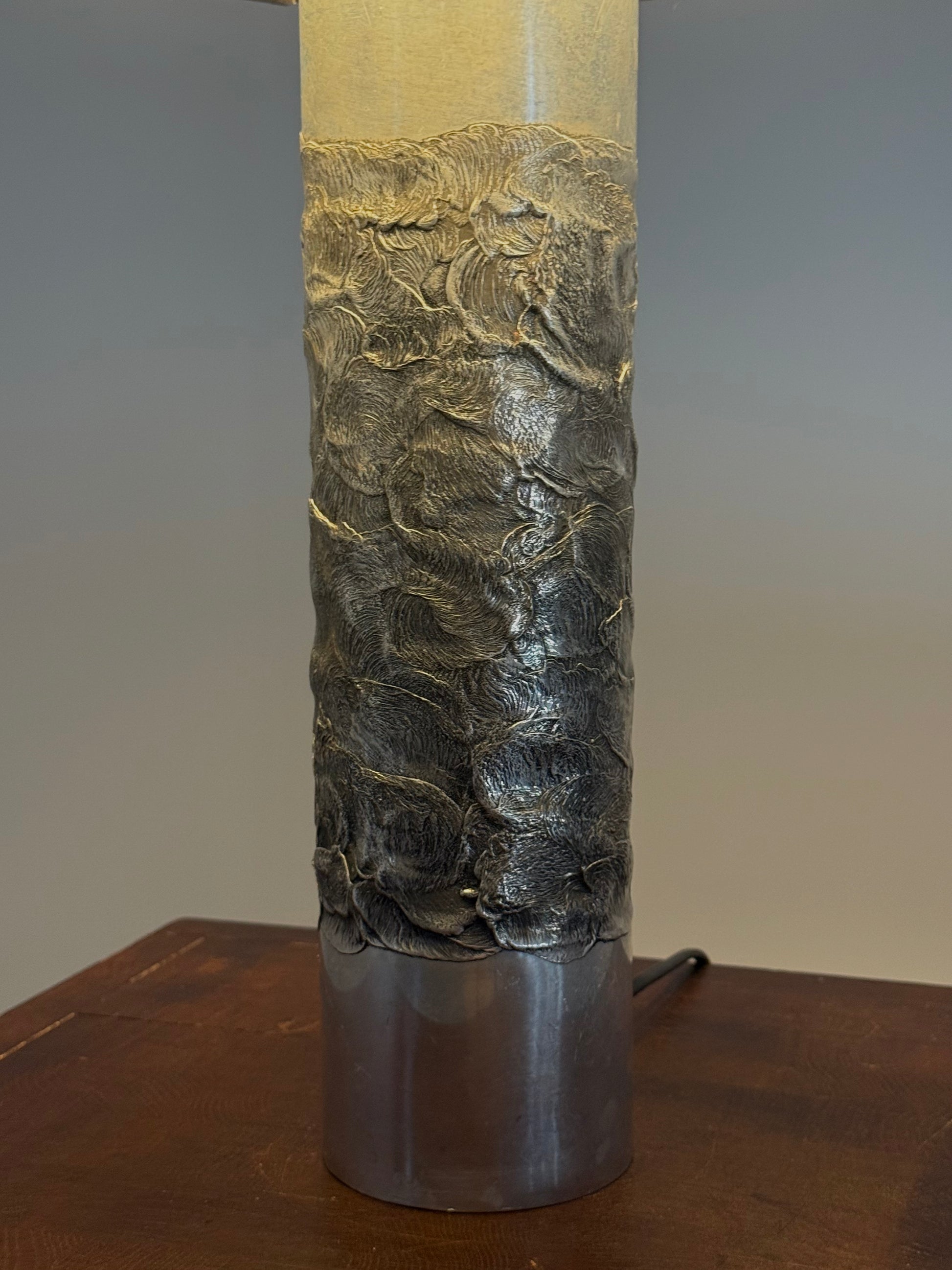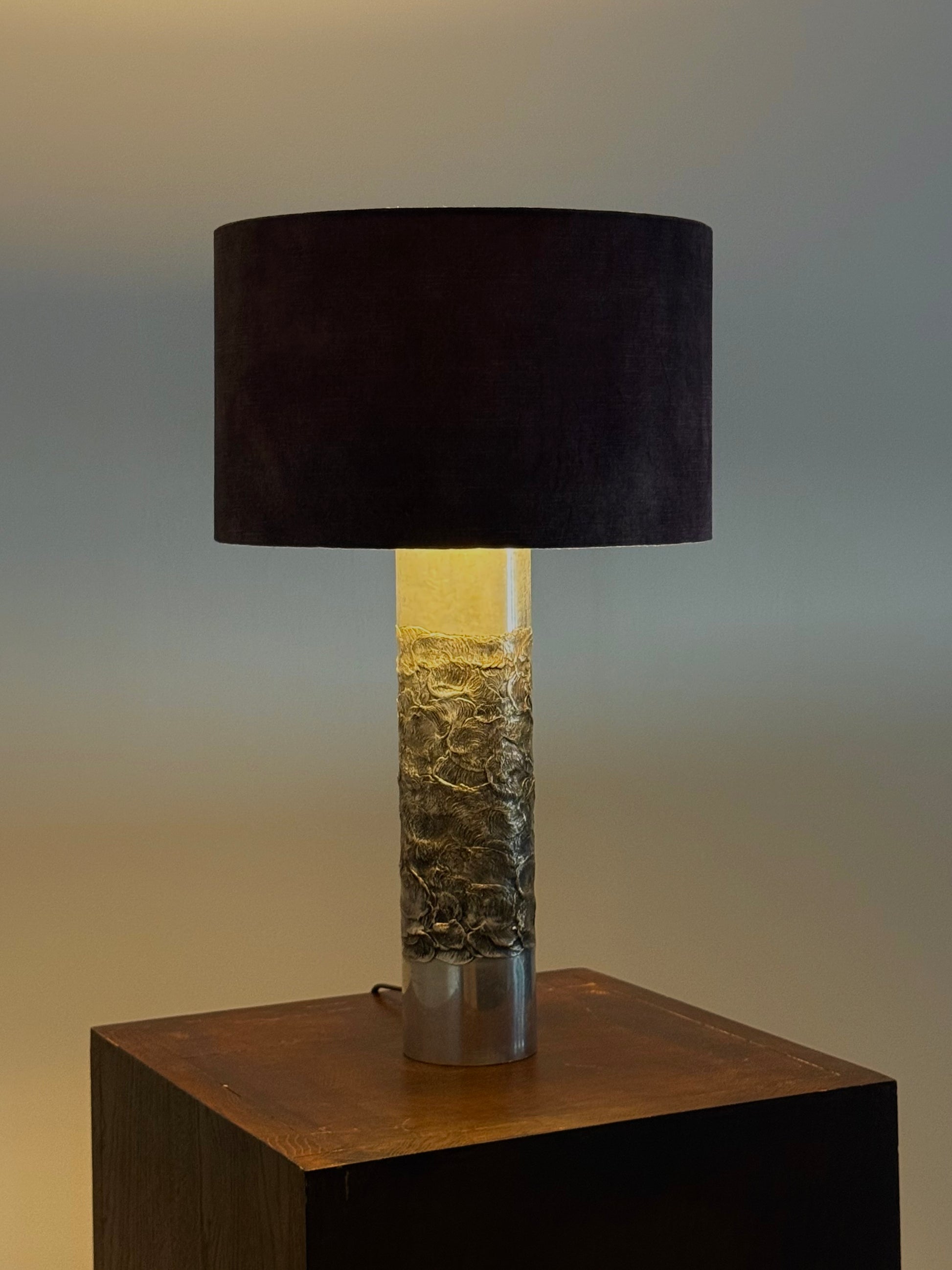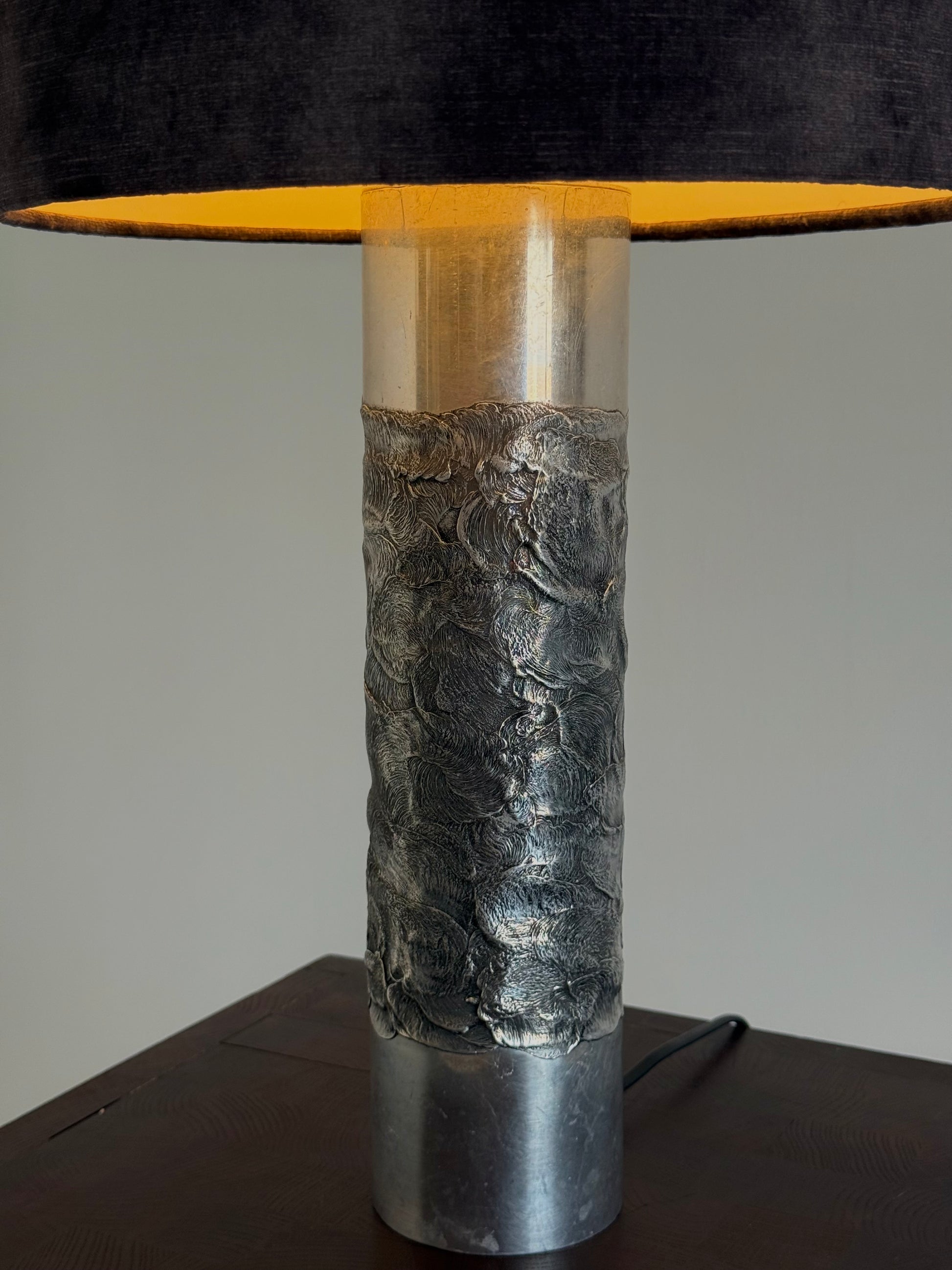 Deze lamp is een prachtig voorbeeld van de kenmerkende brutalistische stijl van Luyckx, met robuuste vormen en een industriële uitstraling. Aluclair produceerde in deze periode een reeks unieke objecten, waaronder asbakken, kandelaars en diverse lampen in hetzelfde gebrande aluminium, waarbij vakmanschap en originaliteit centraal stonden.