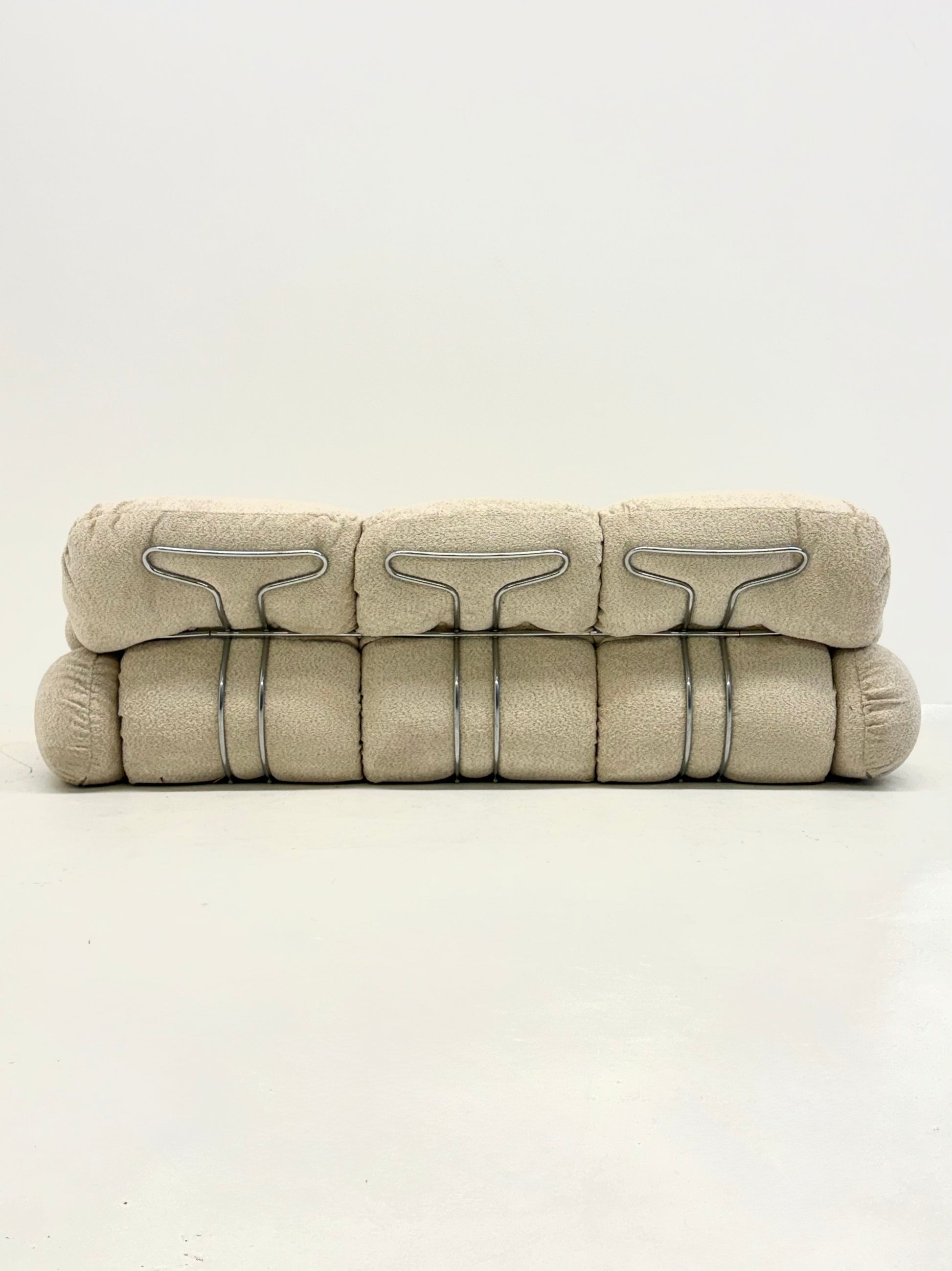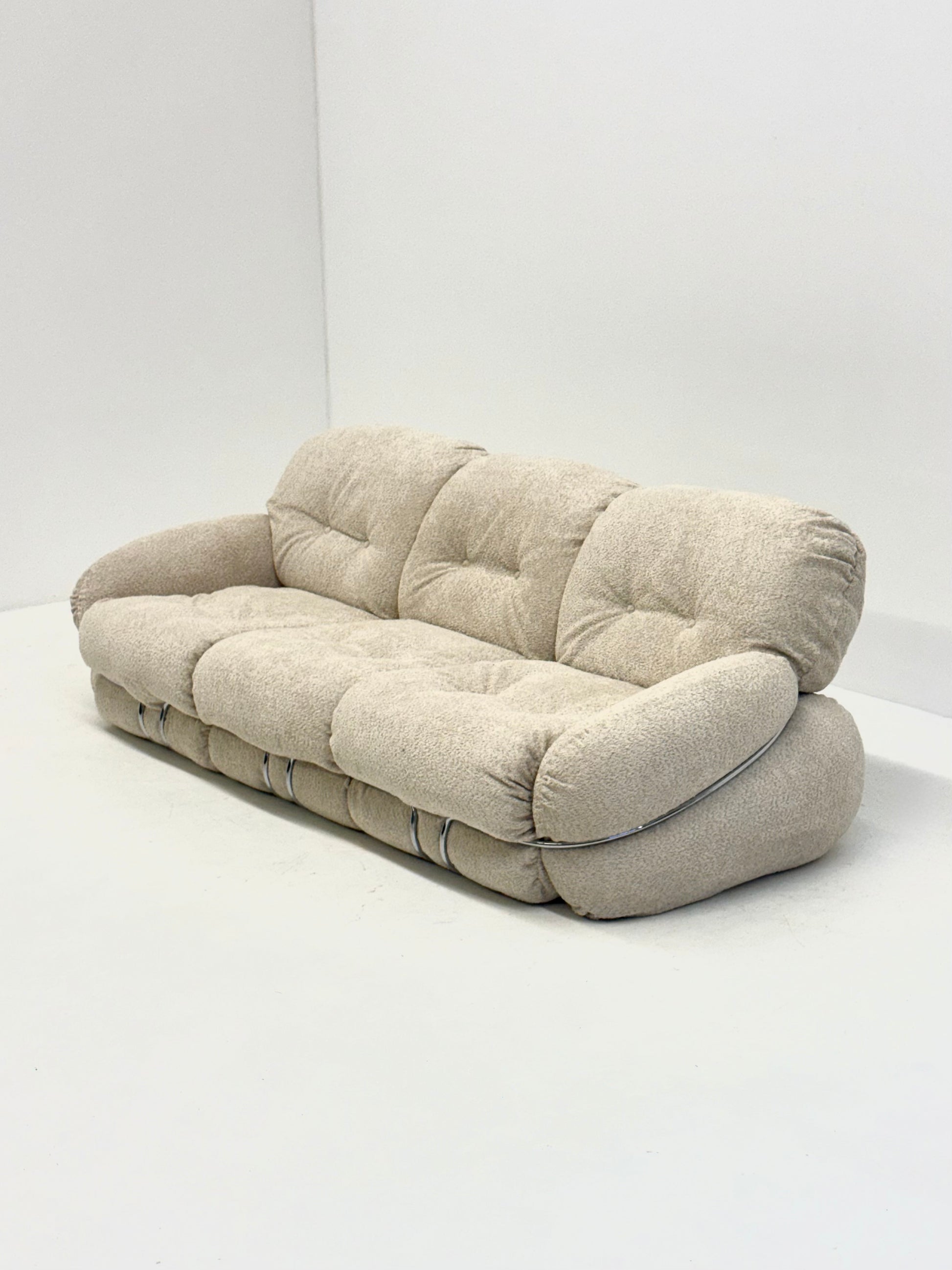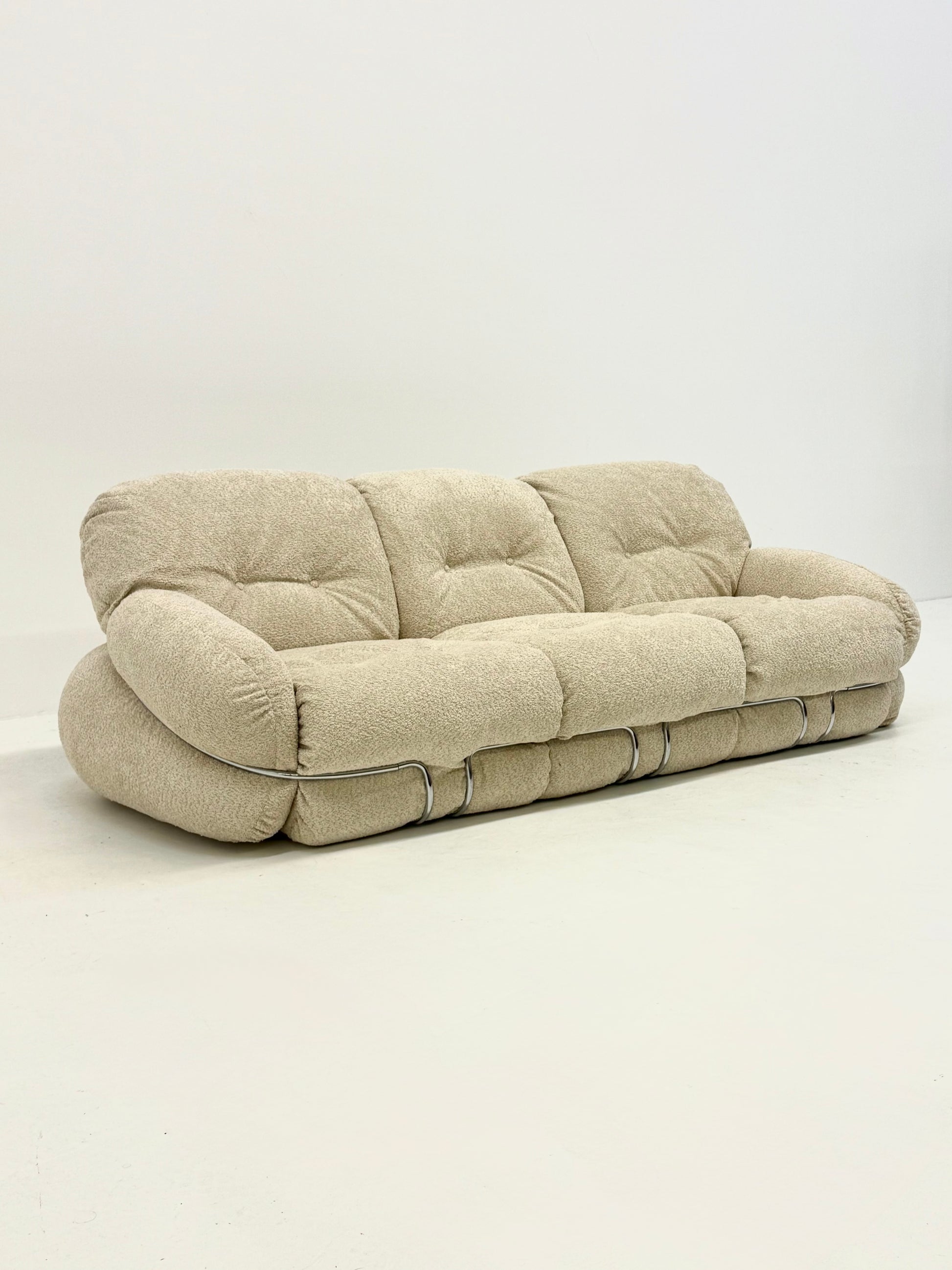 Deze 3-zits uitvoering is opnieuw gestoffeerd in een crème kleurige bouclé stof, wat het sculpturale ontwerp extra warmte en textuur geeft. De combinatie van het zachte, golvende silhouet en het strakke stalen frame zorgt voor een tijdloze uitstraling die moeiteloos past in zowel vintage als moderne interieurs.