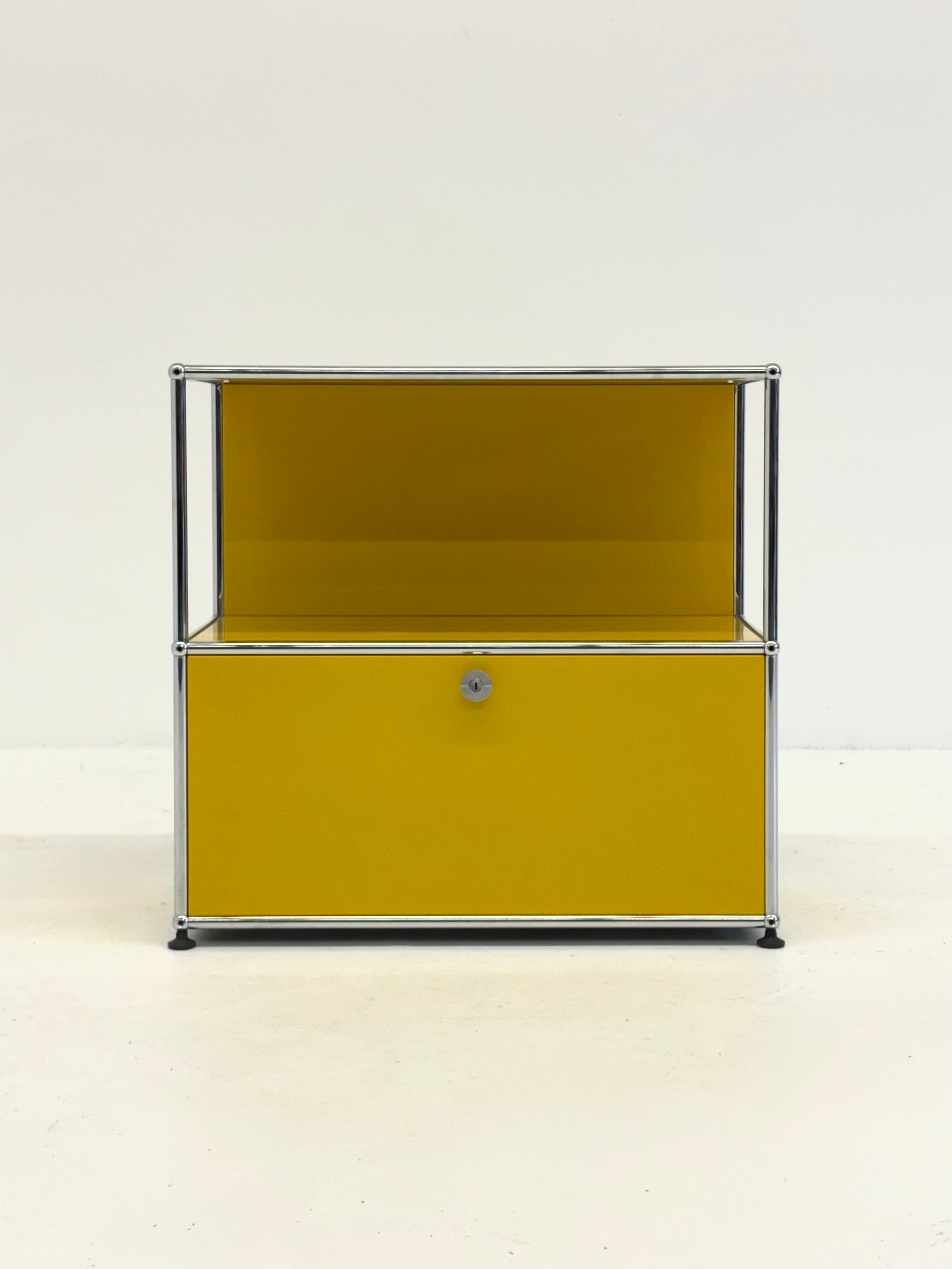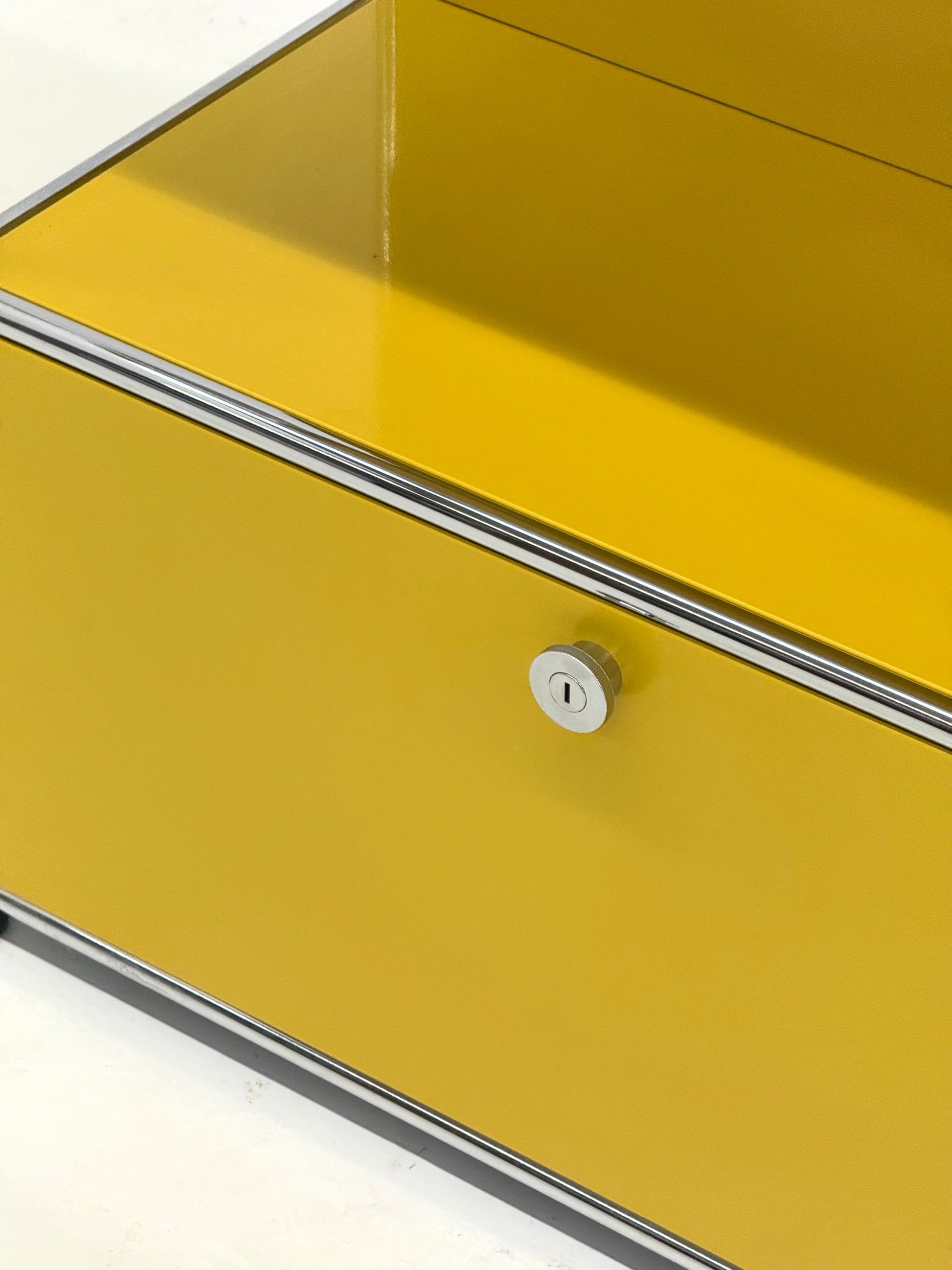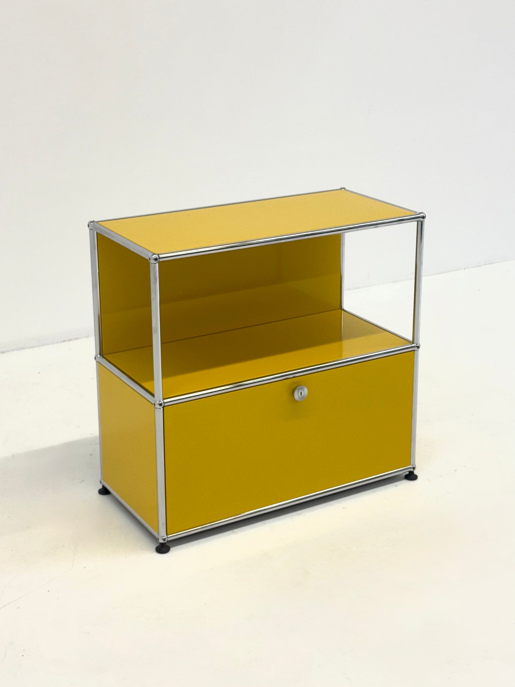 Modulaire USM Haller kast uitgevoerd in een gele kleur. Dit iconische systeemmeubel is opgebouwd uit metalen panelen en een verchroomde buisconstructie, zoals we kennen van het originele Zwitserse ontwerp.
