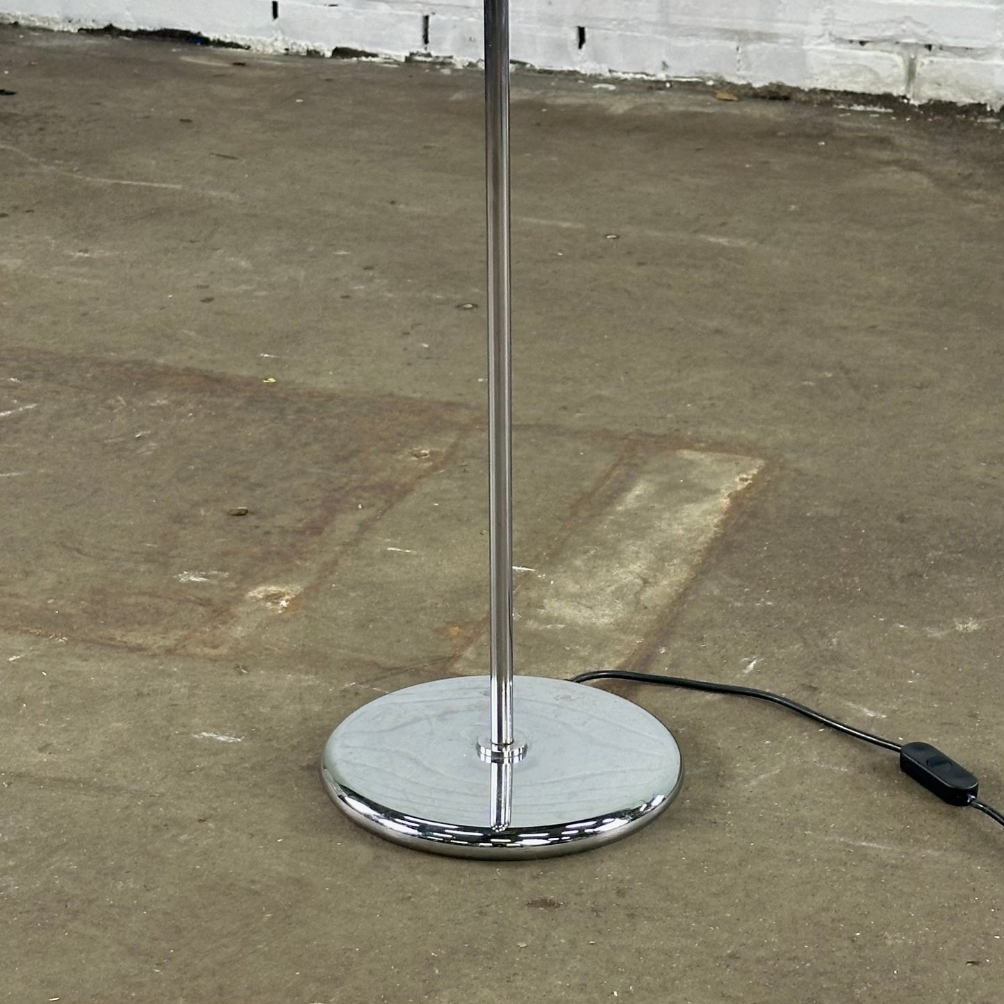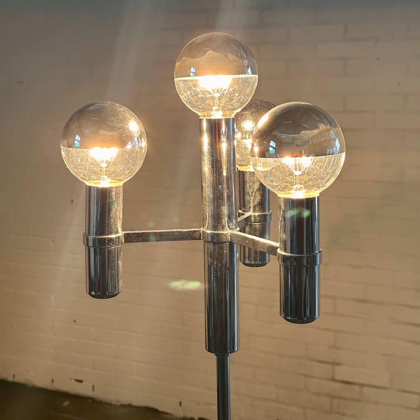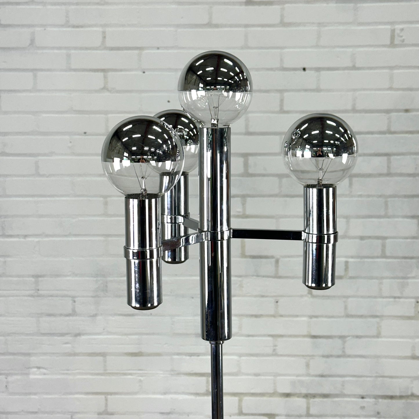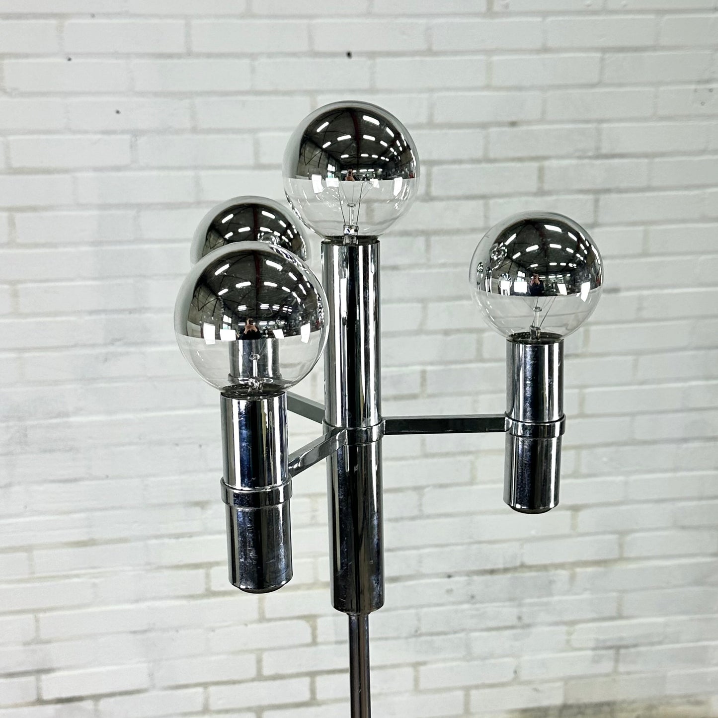 Omschrijving: Chrome space age vintage vloerlamp. De lamp is waarschijnlijk van het Italiaanse merk Sciolari.
