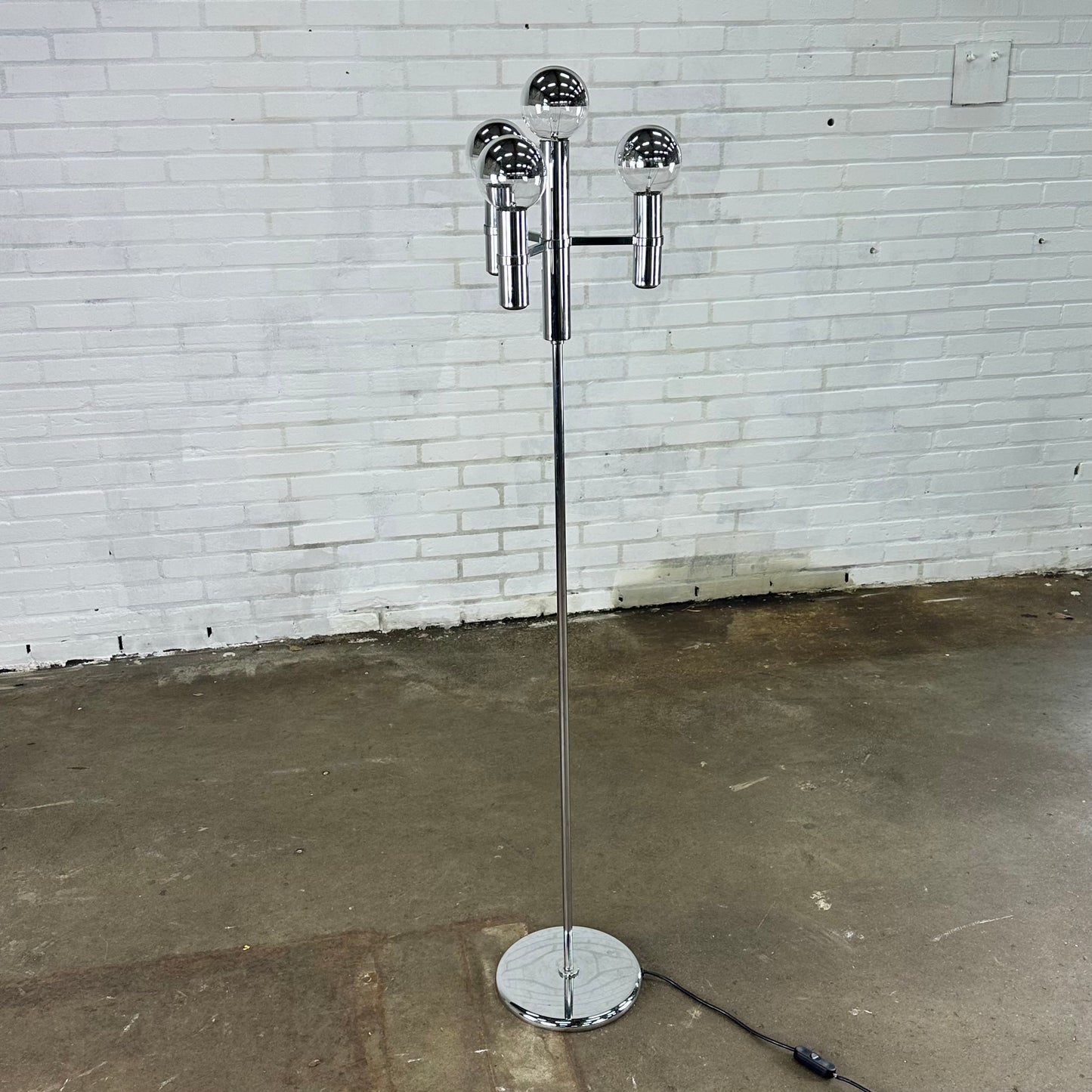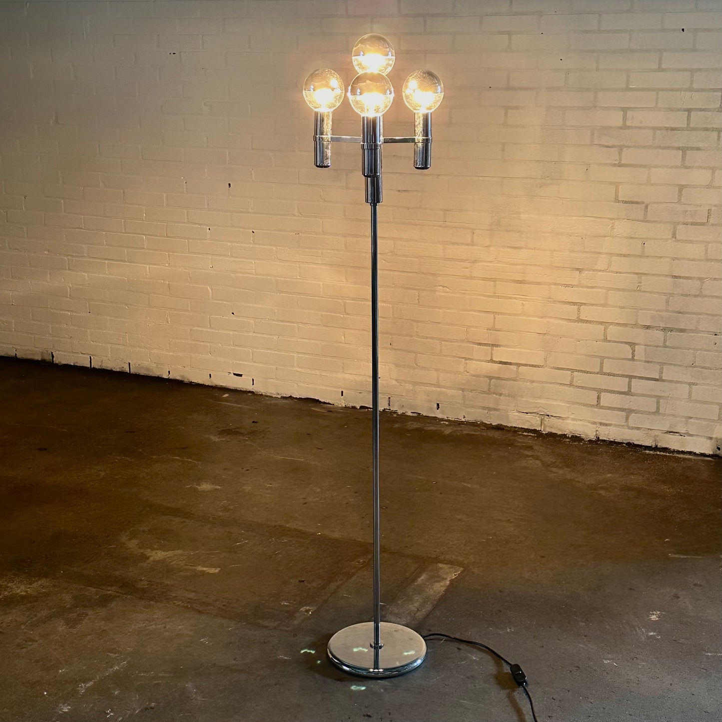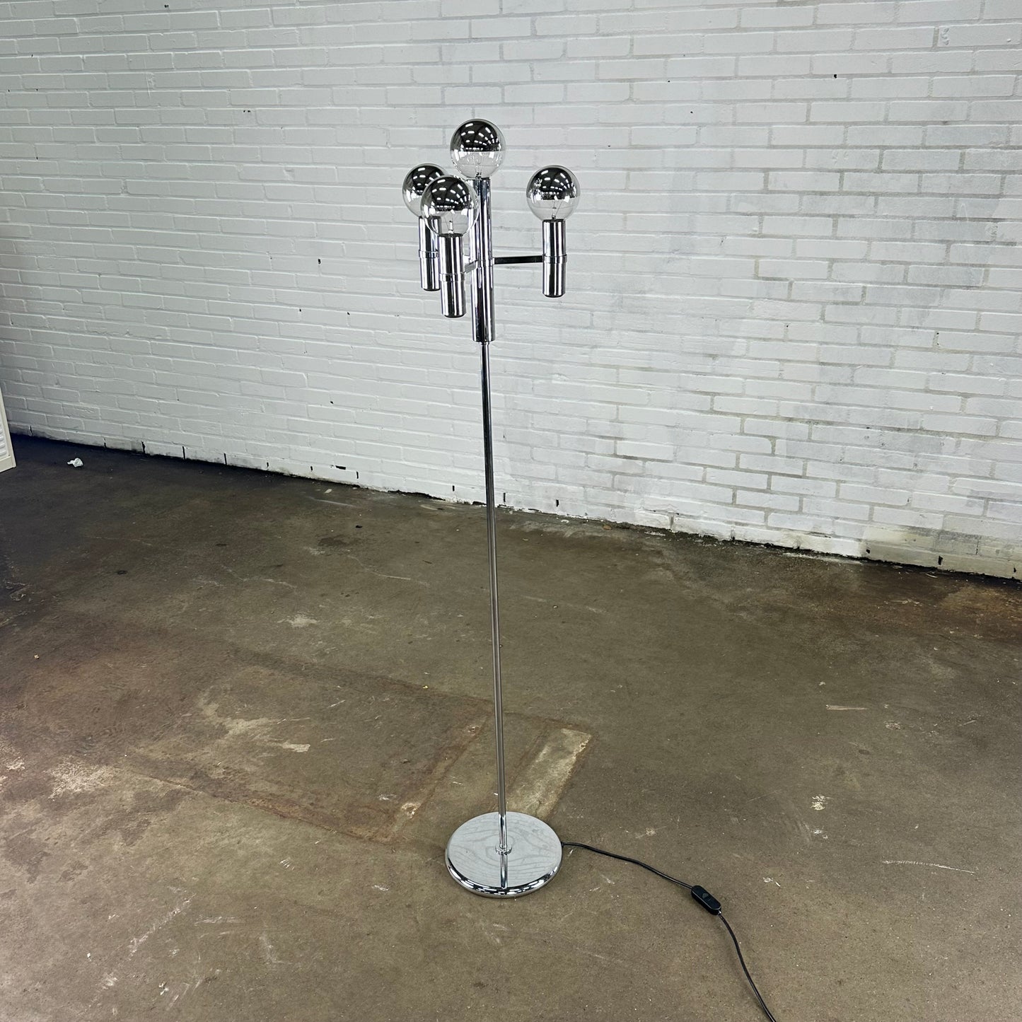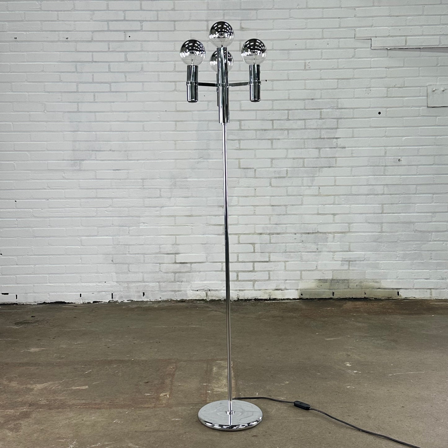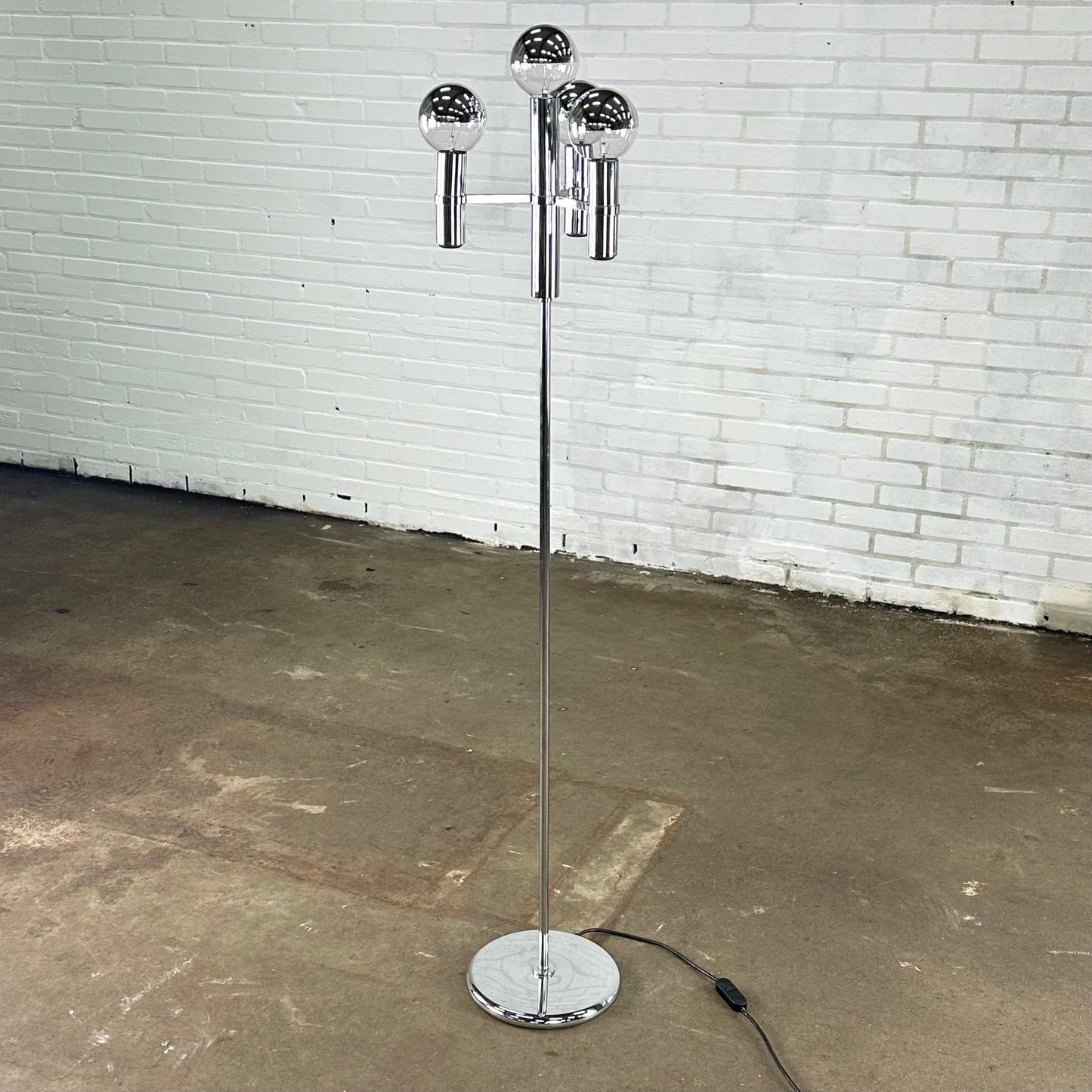 Omschrijving: Chrome space age vintage vloerlamp. De lamp is waarschijnlijk van het Italiaanse merk Sciolari.