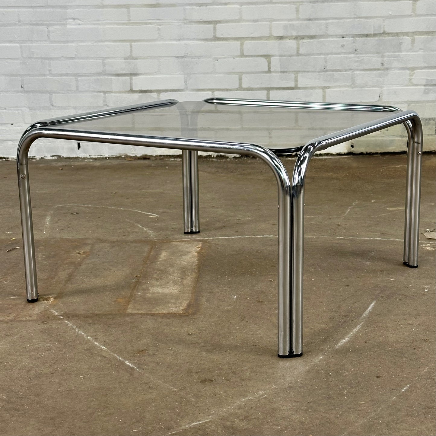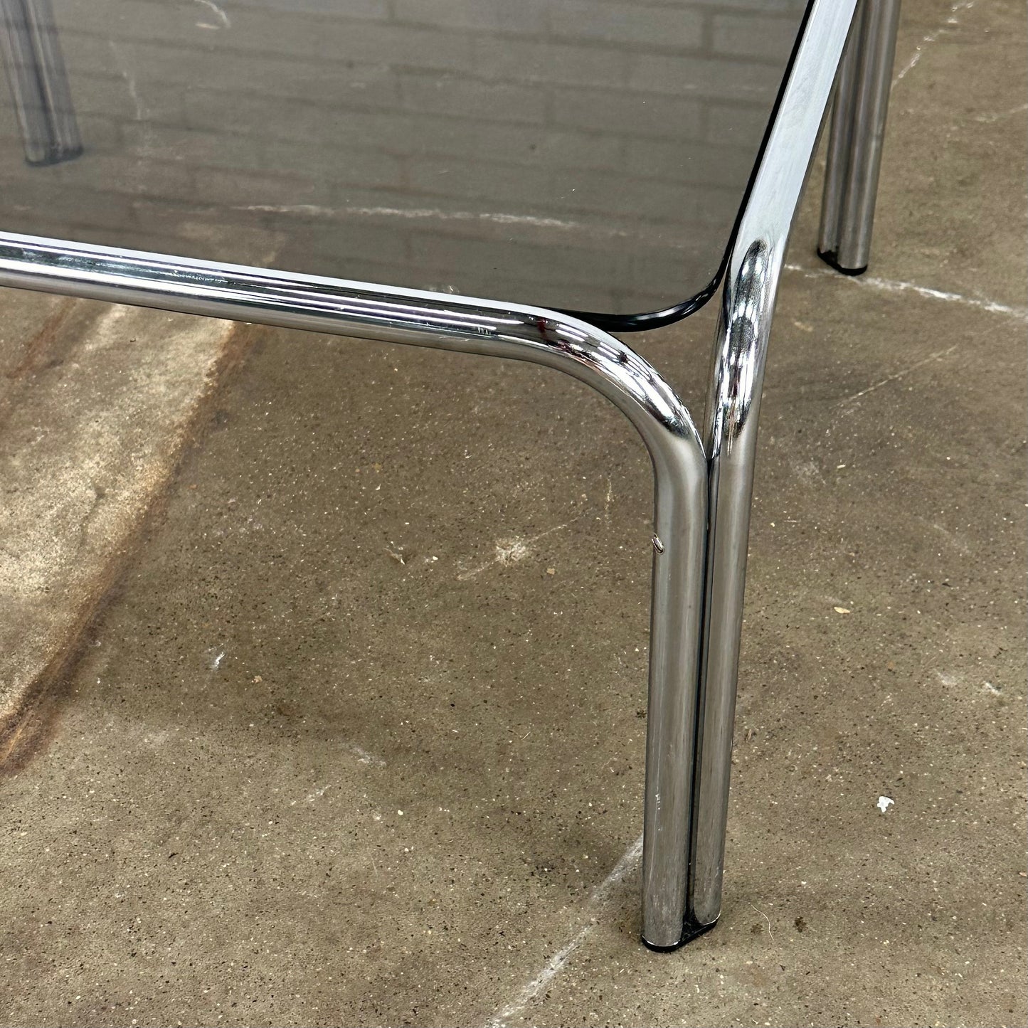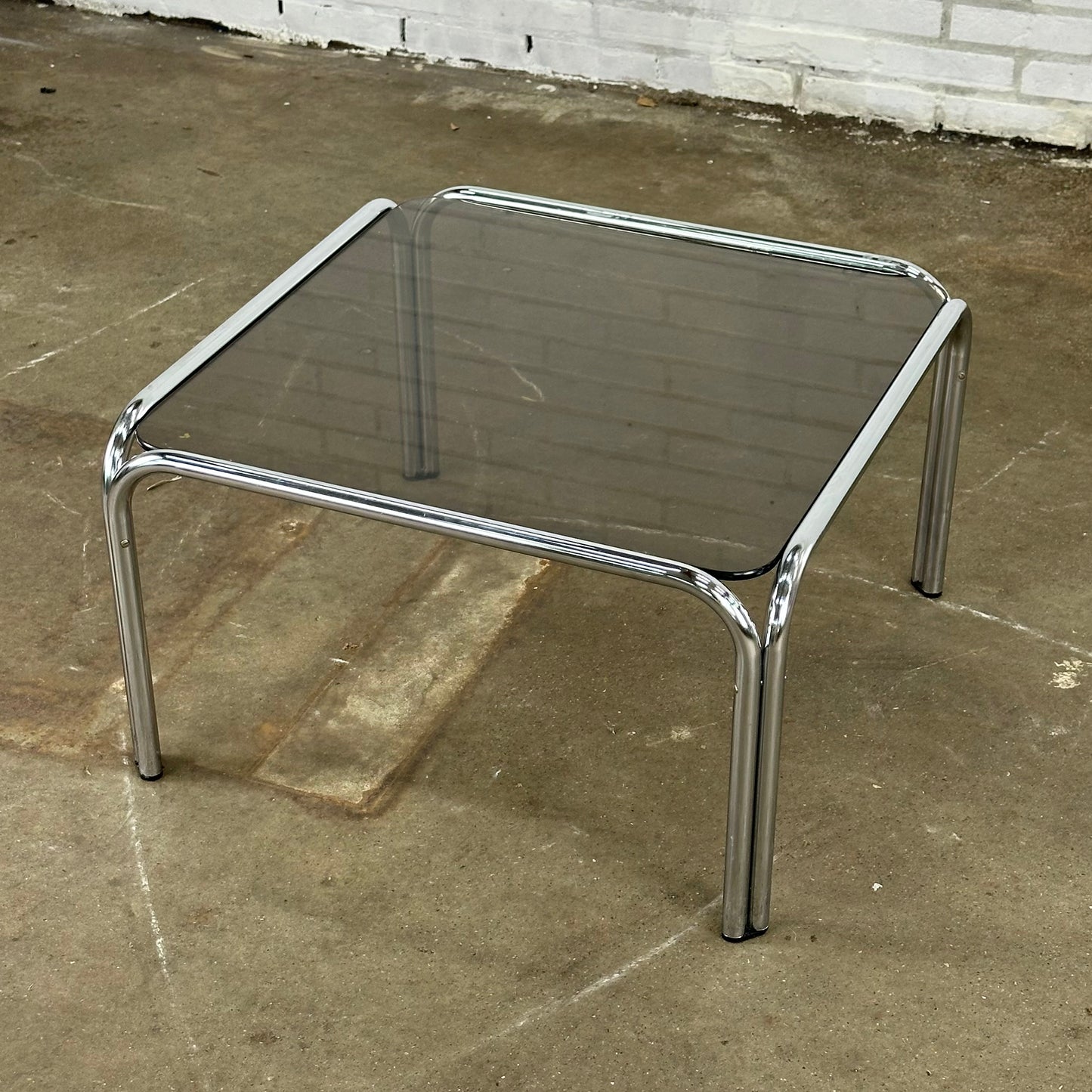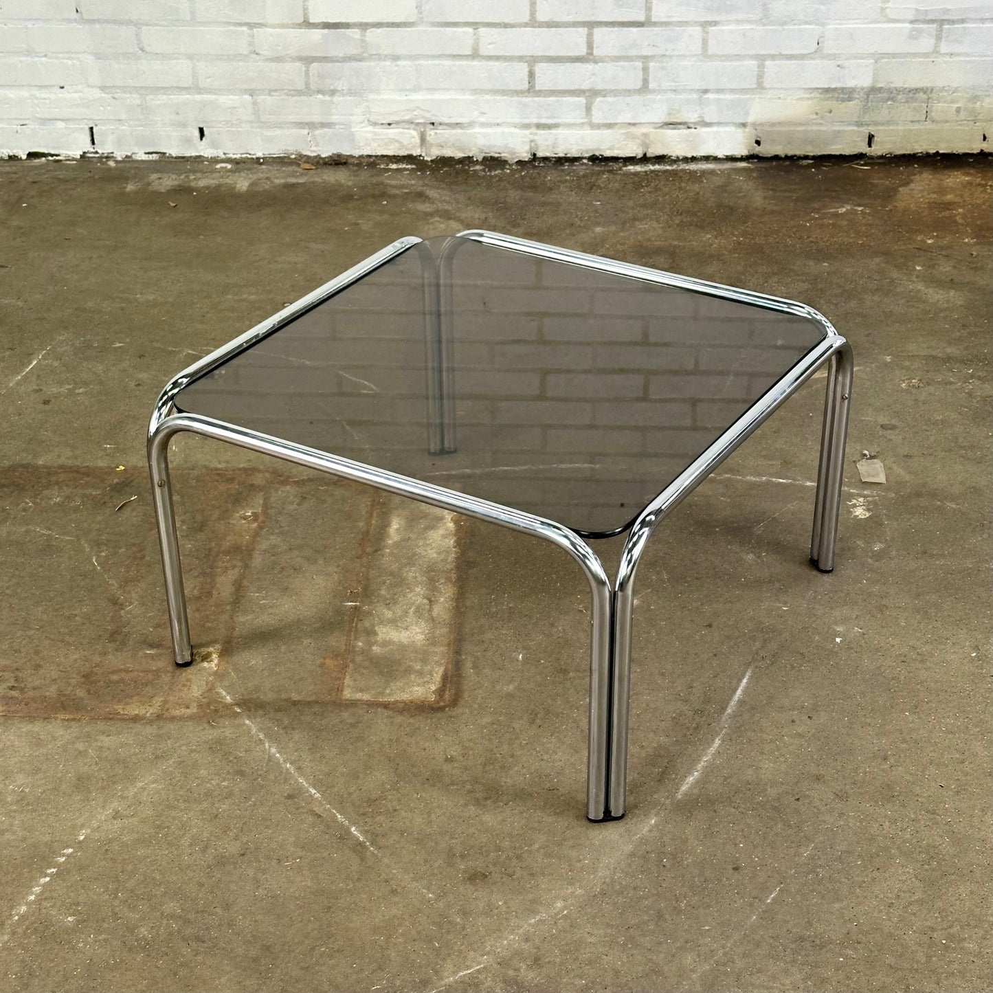 Omschrijving: Design vintage rookglas salontafel met buisframe