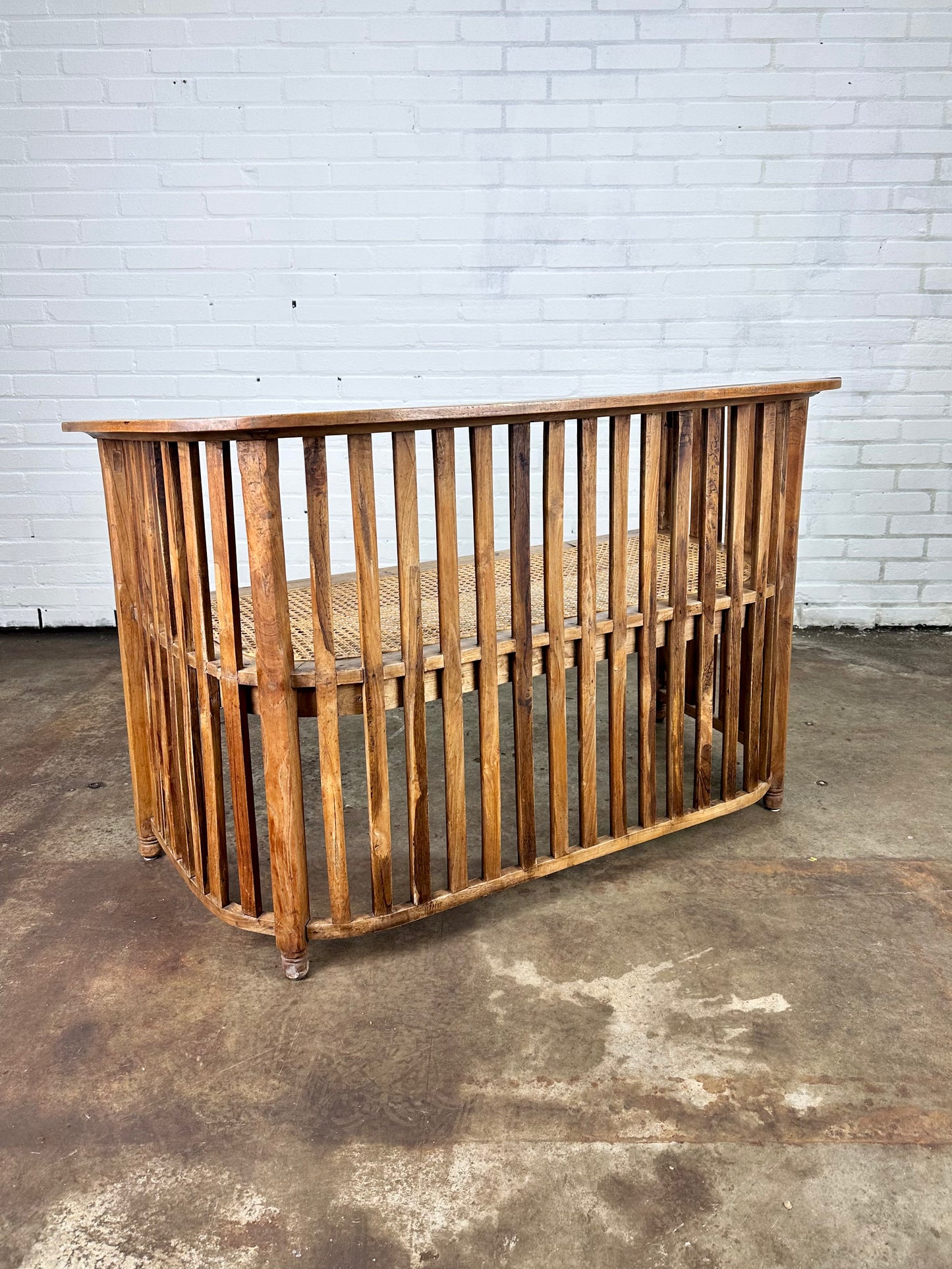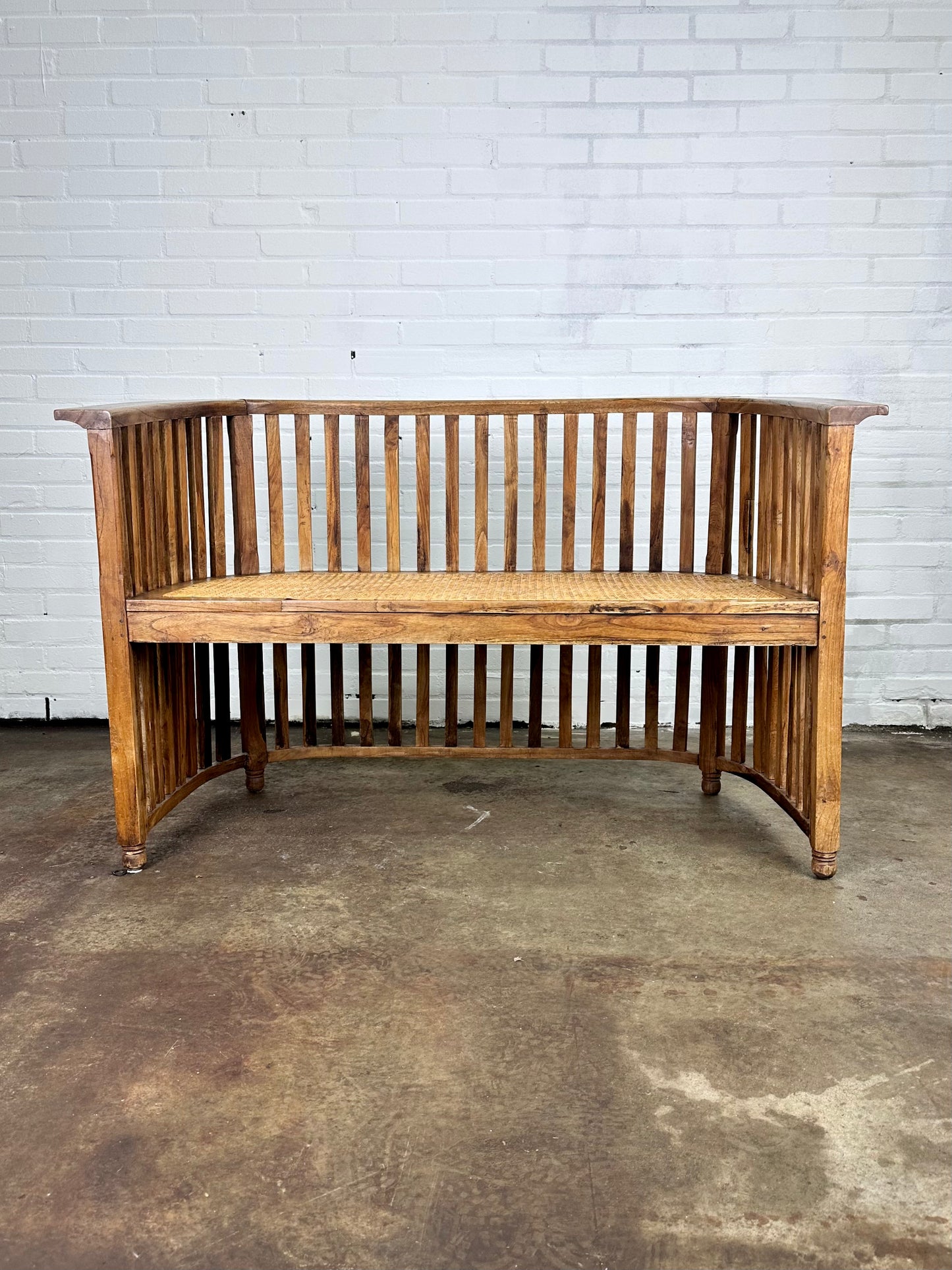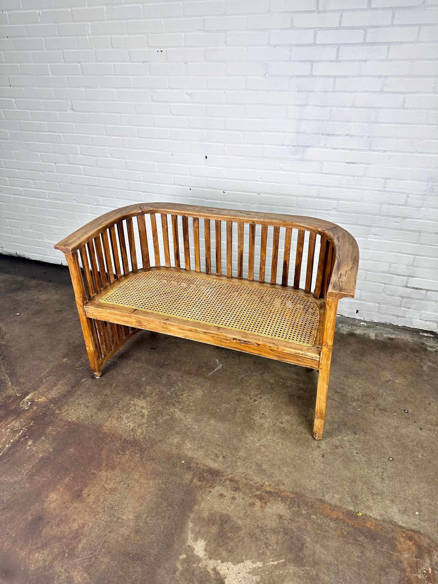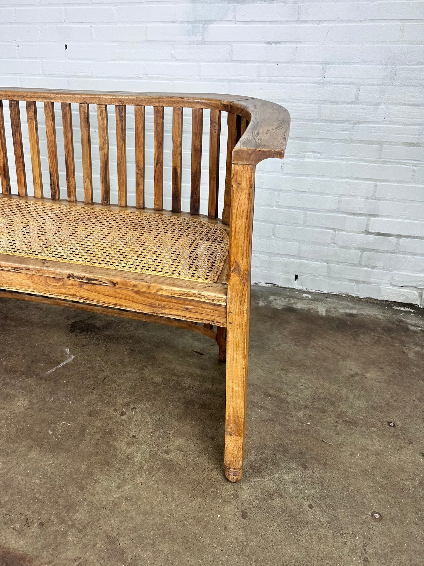 Omschrijving: Frans antiek (tuin)bankje van oak hout met een zitting van webbing.