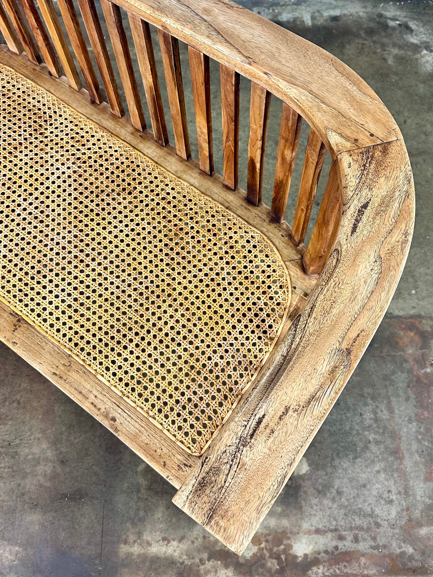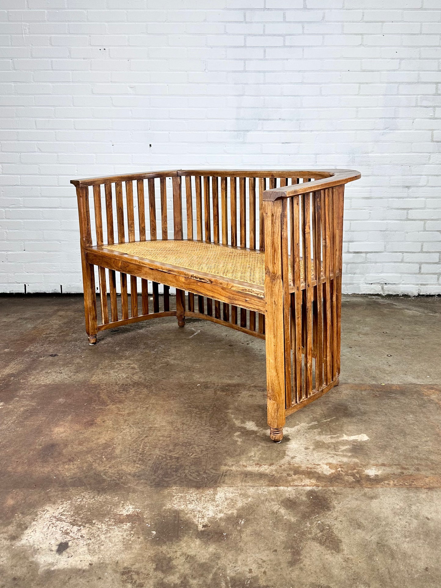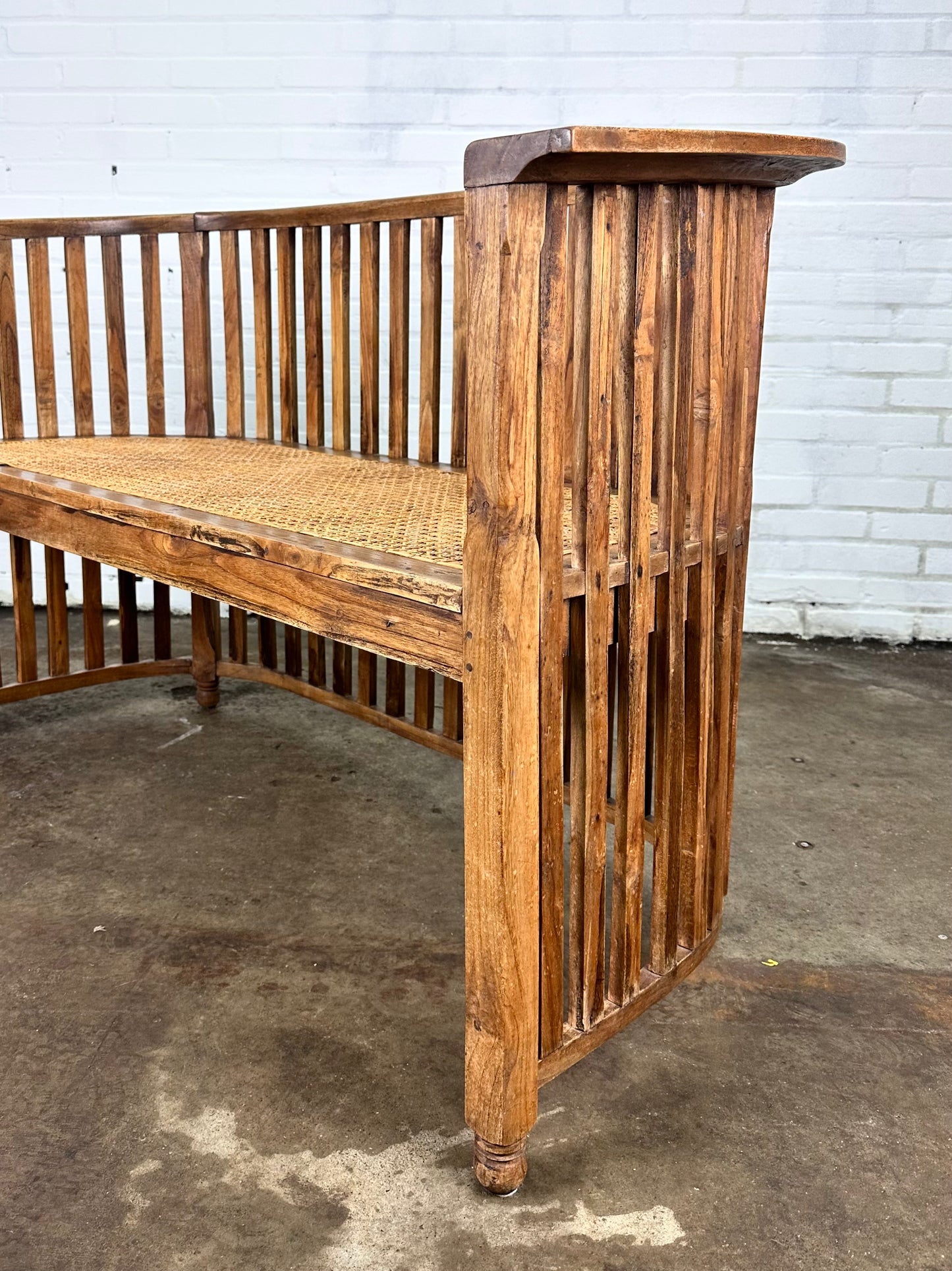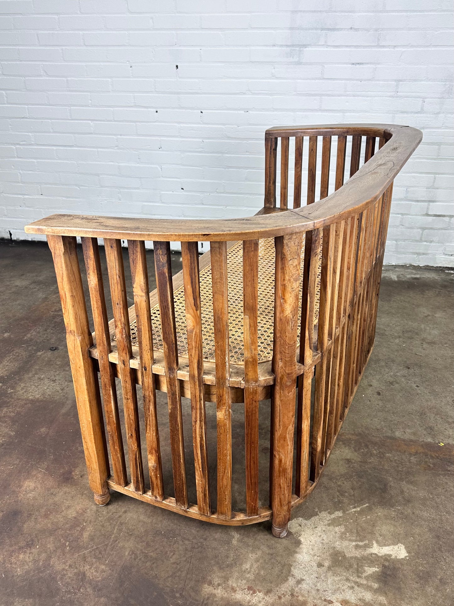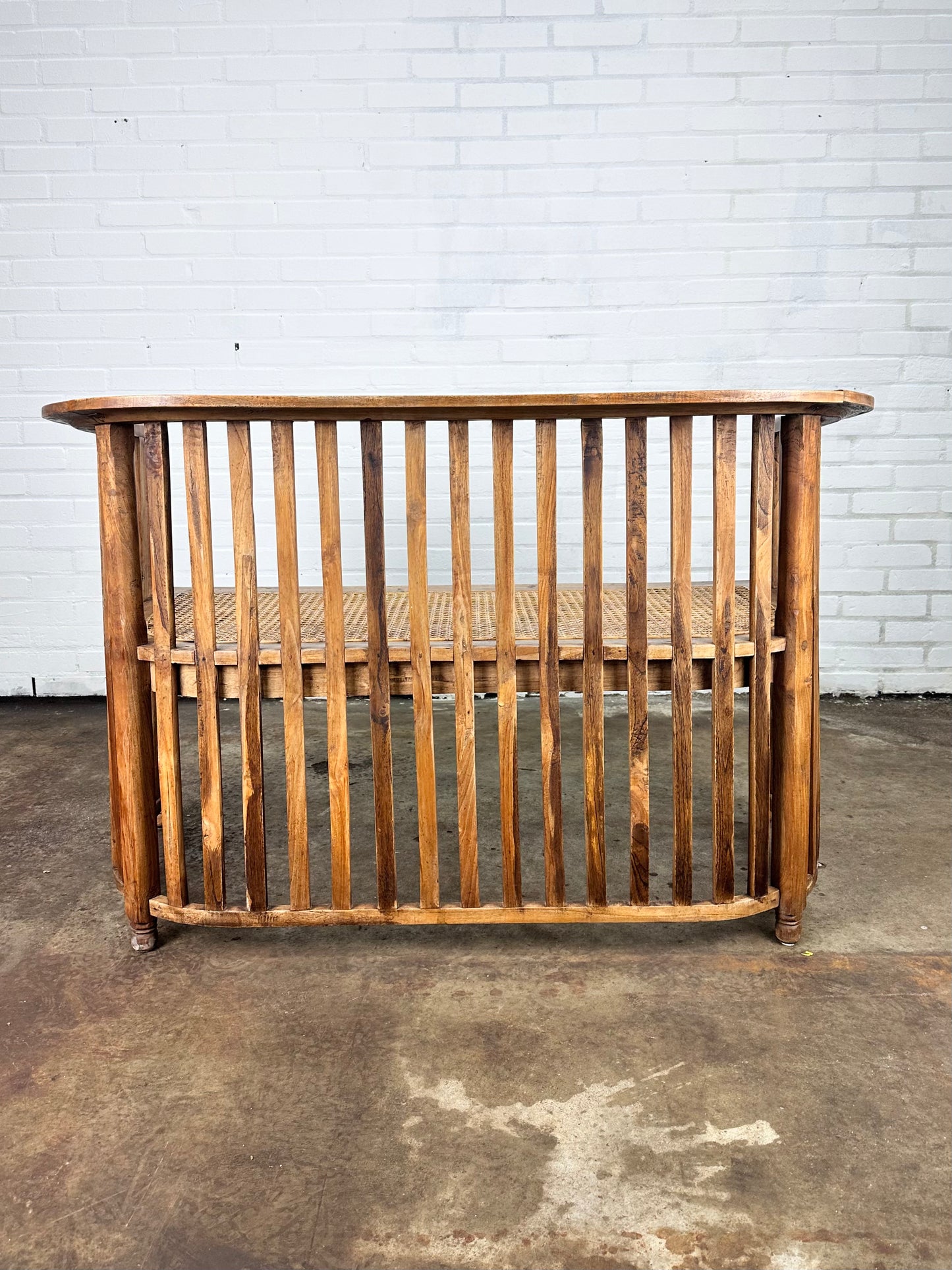 Omschrijving: Frans antiek (tuin)bankje van oak hout met een zitting van webbing.