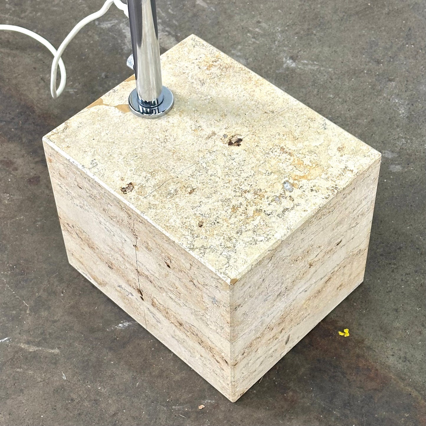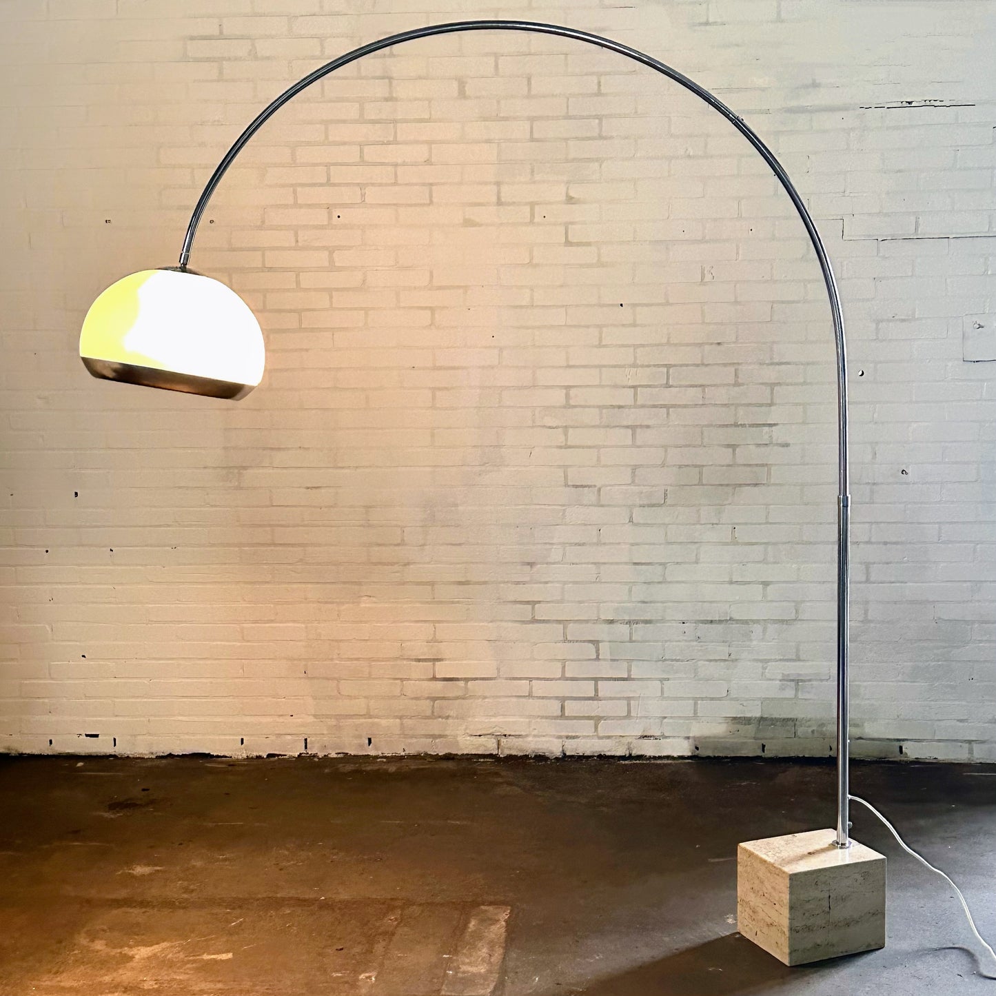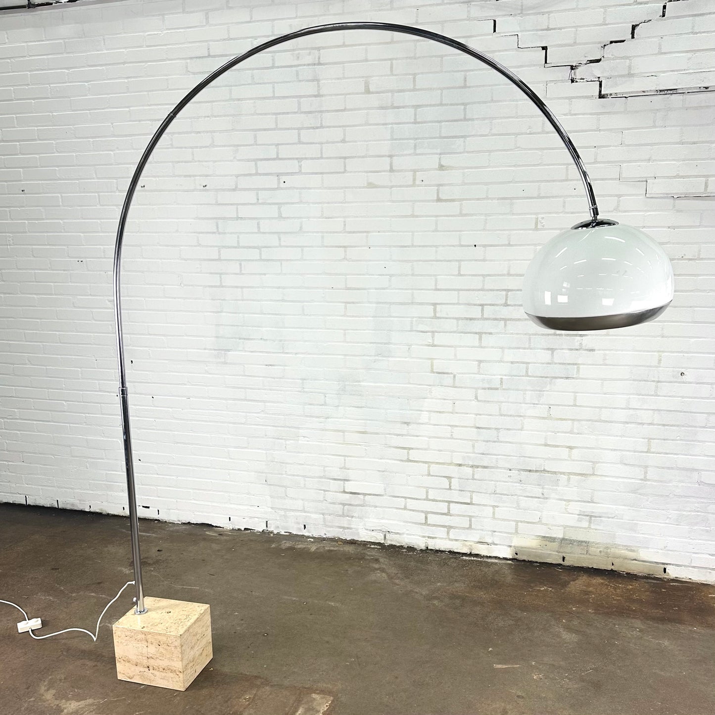 Omschrijving: Harvey Guzzini boog vloerLamp voor Laurel Lighting Co. De lamp heeft een kunsttof witte kap en een marmeren voet.