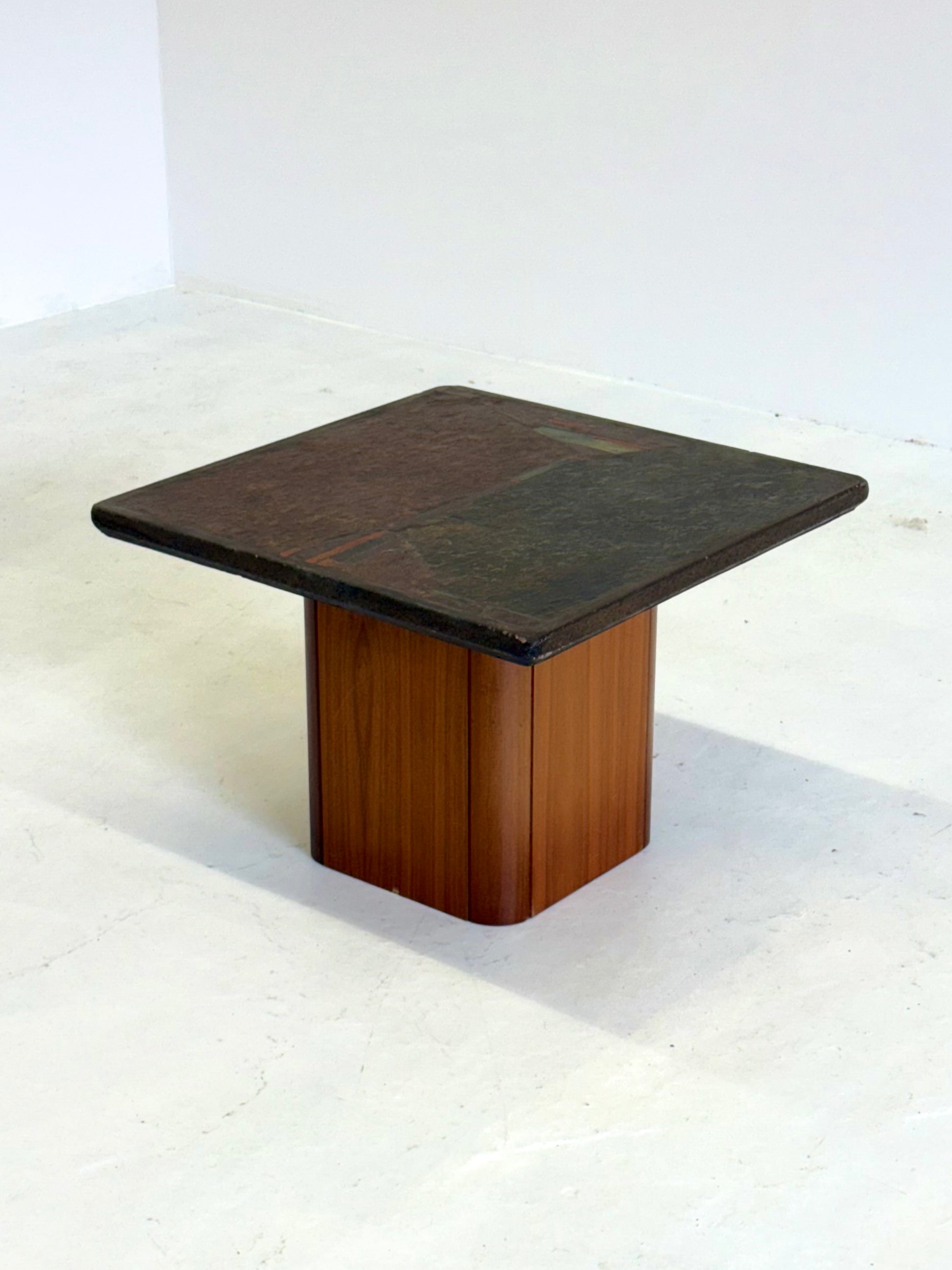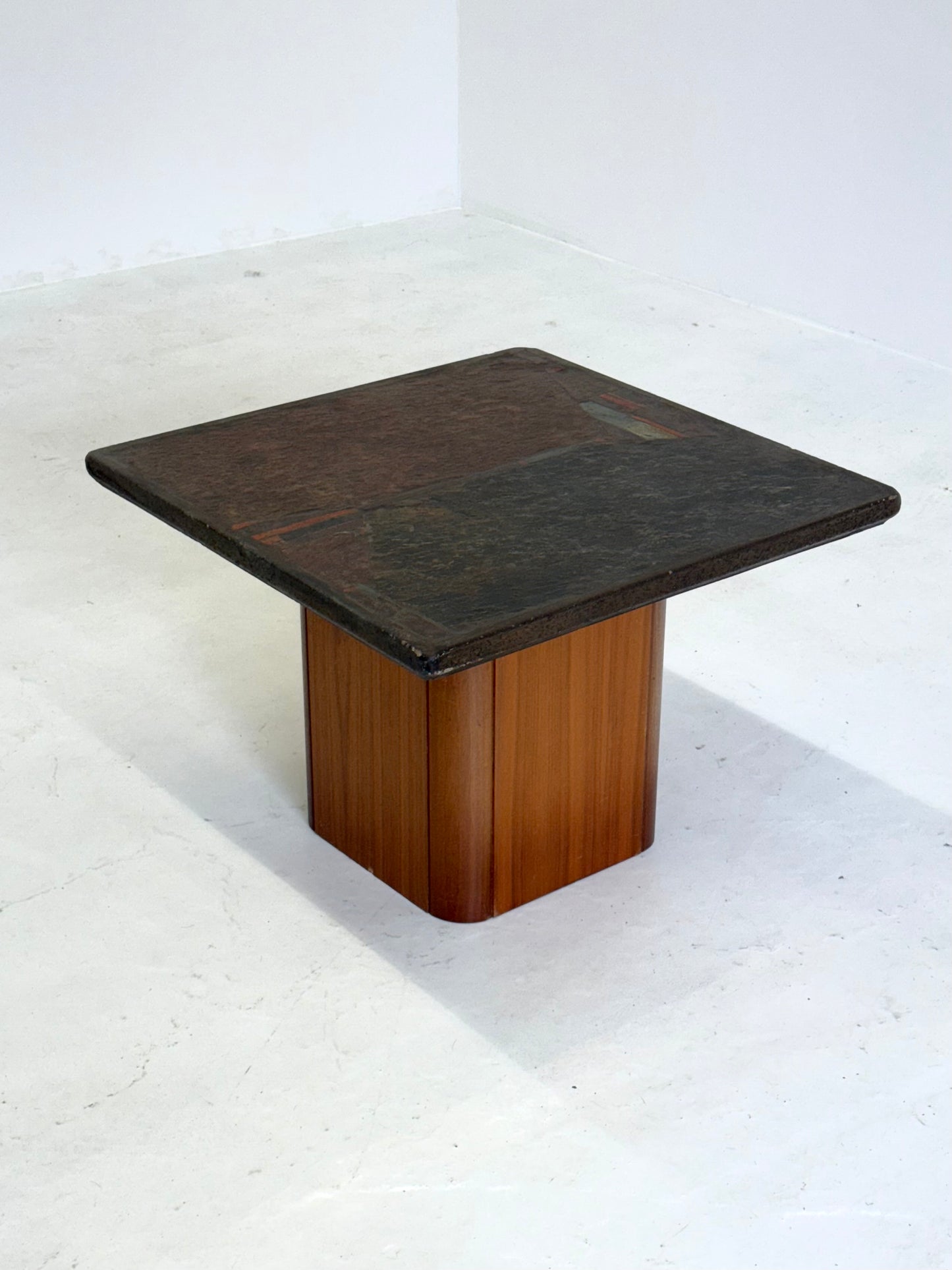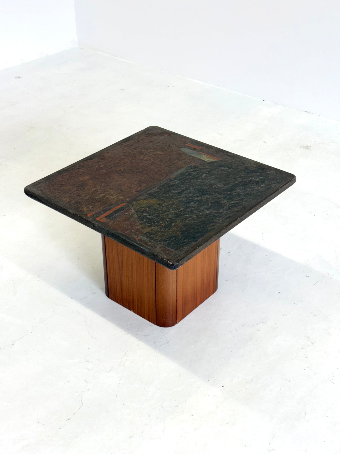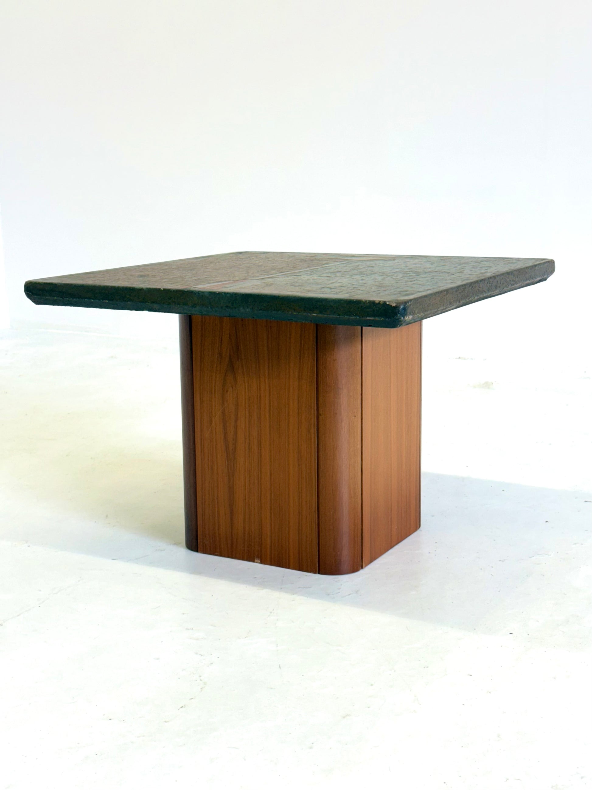 De tafel heeft een zwaar natuurstenen blad van leisteen, rustend op een massief teakhouten onderstel. Een robuust ontwerp dat perfect past binnen de brutalistische stijl.