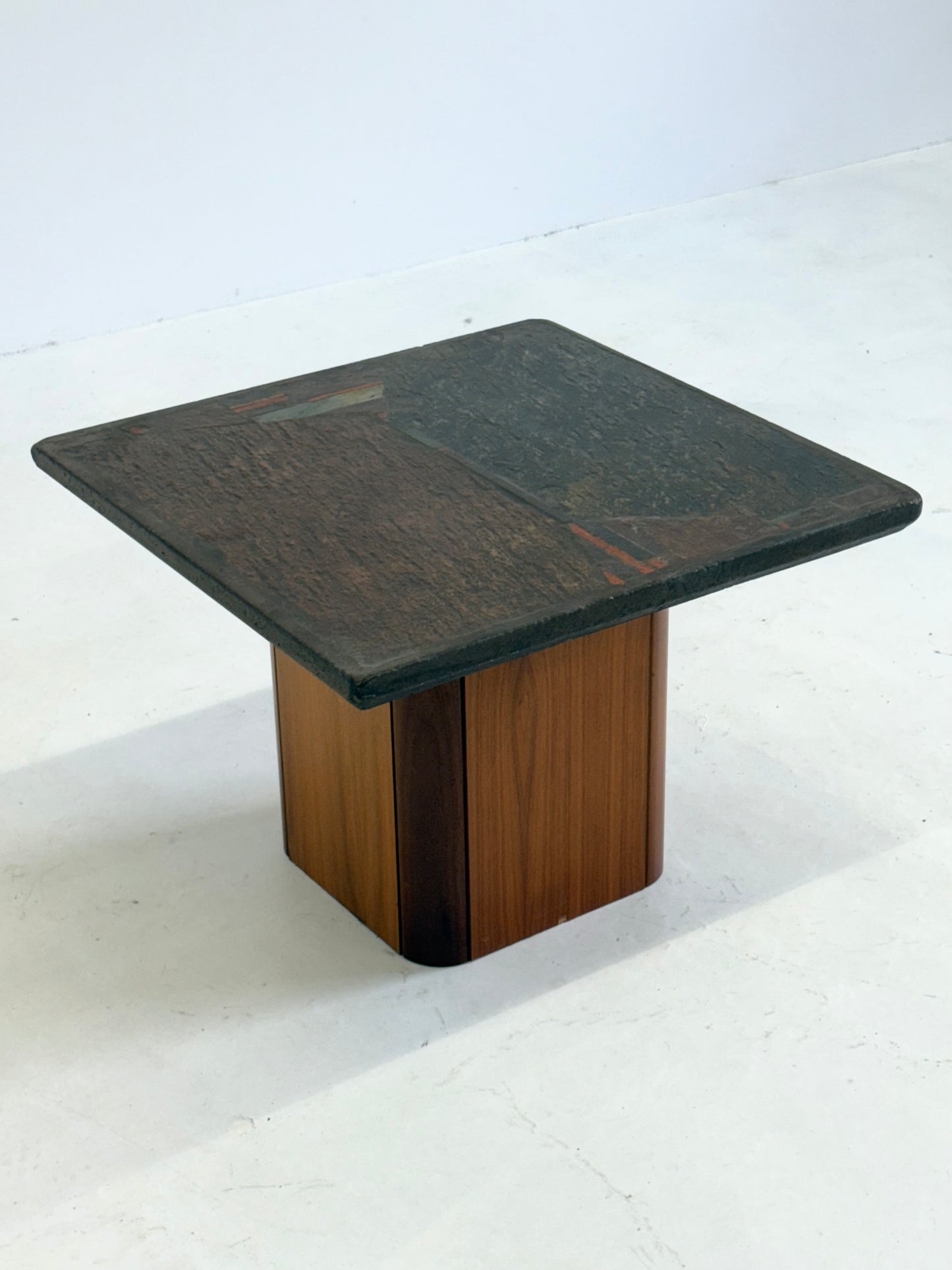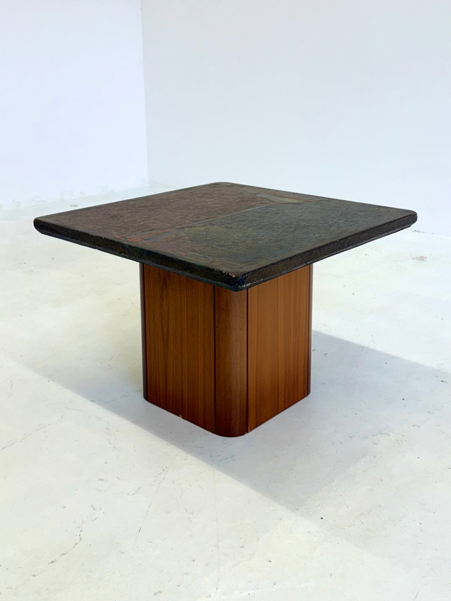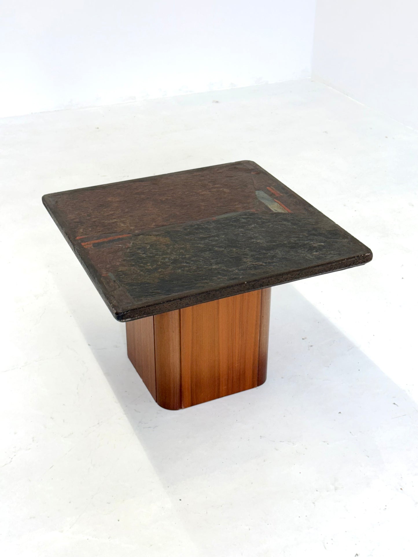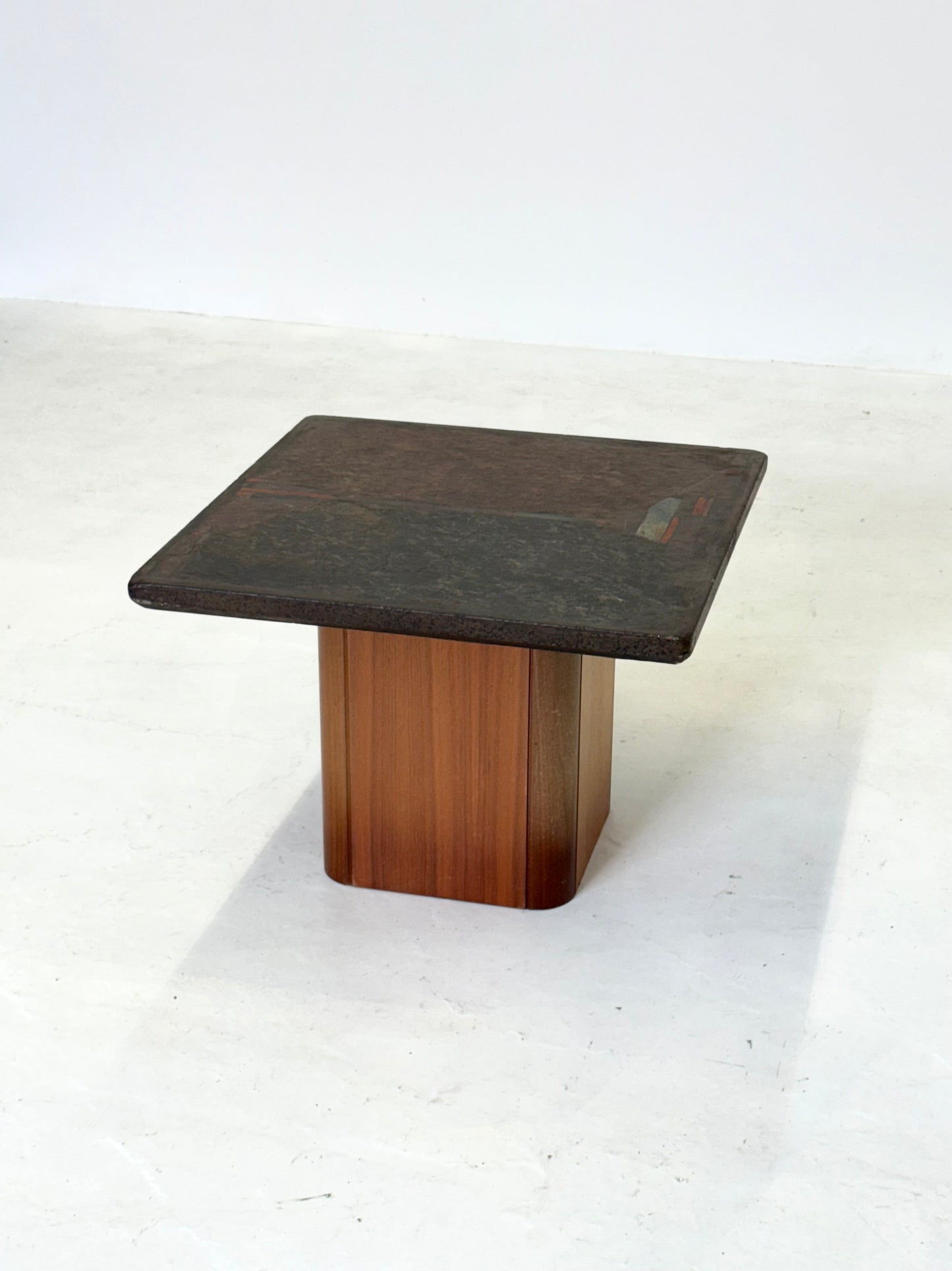 De tafel heeft een zwaar natuurstenen blad van leisteen, rustend op een massief teakhouten onderstel. Een robuust ontwerp dat perfect past binnen de brutalistische stijl.