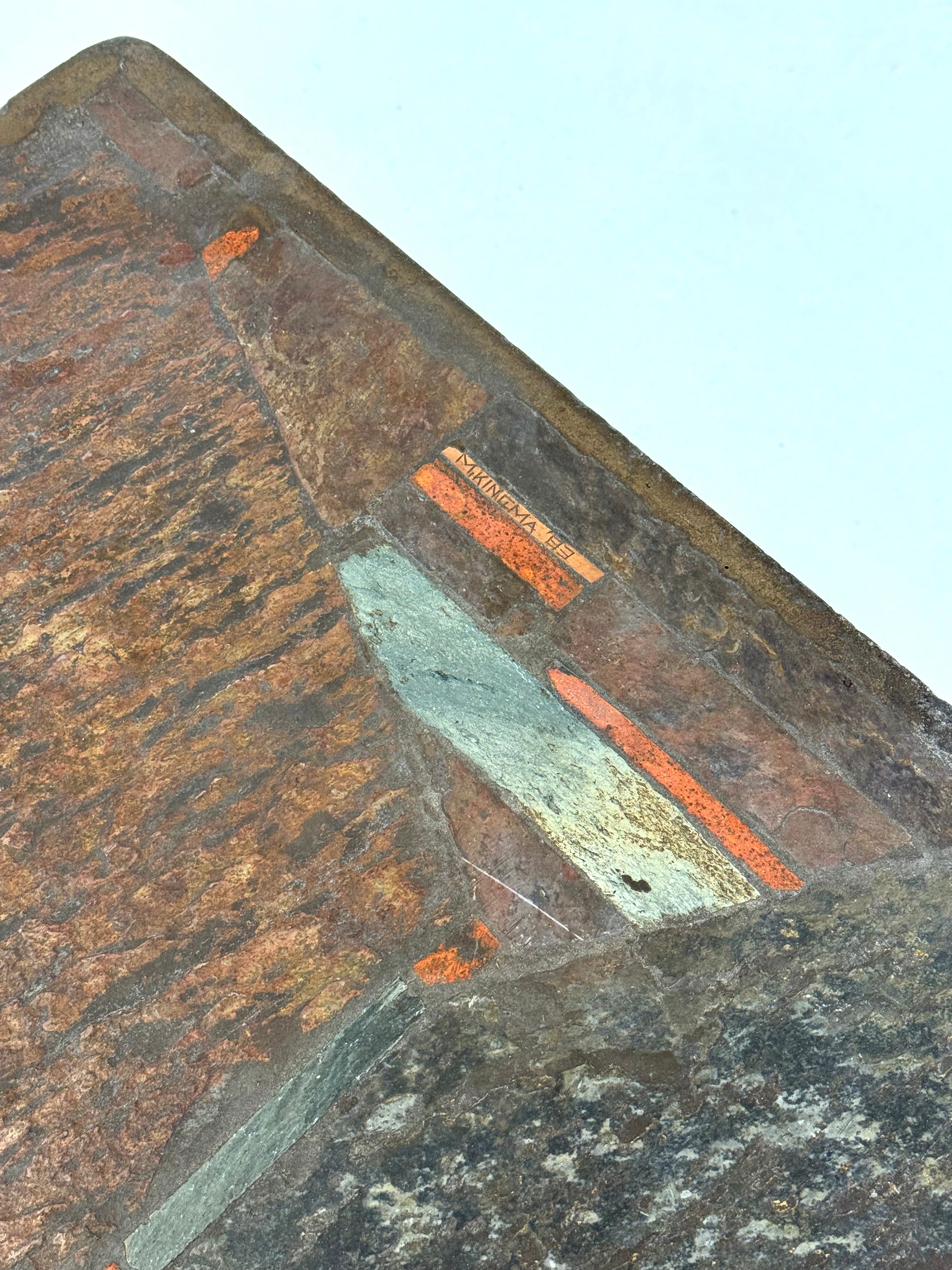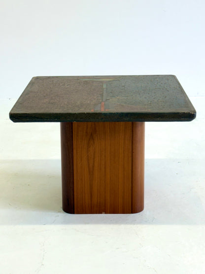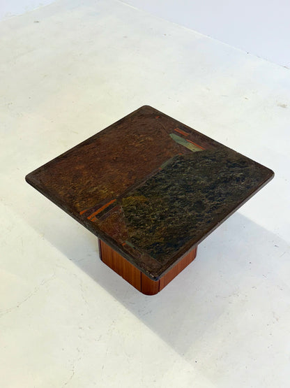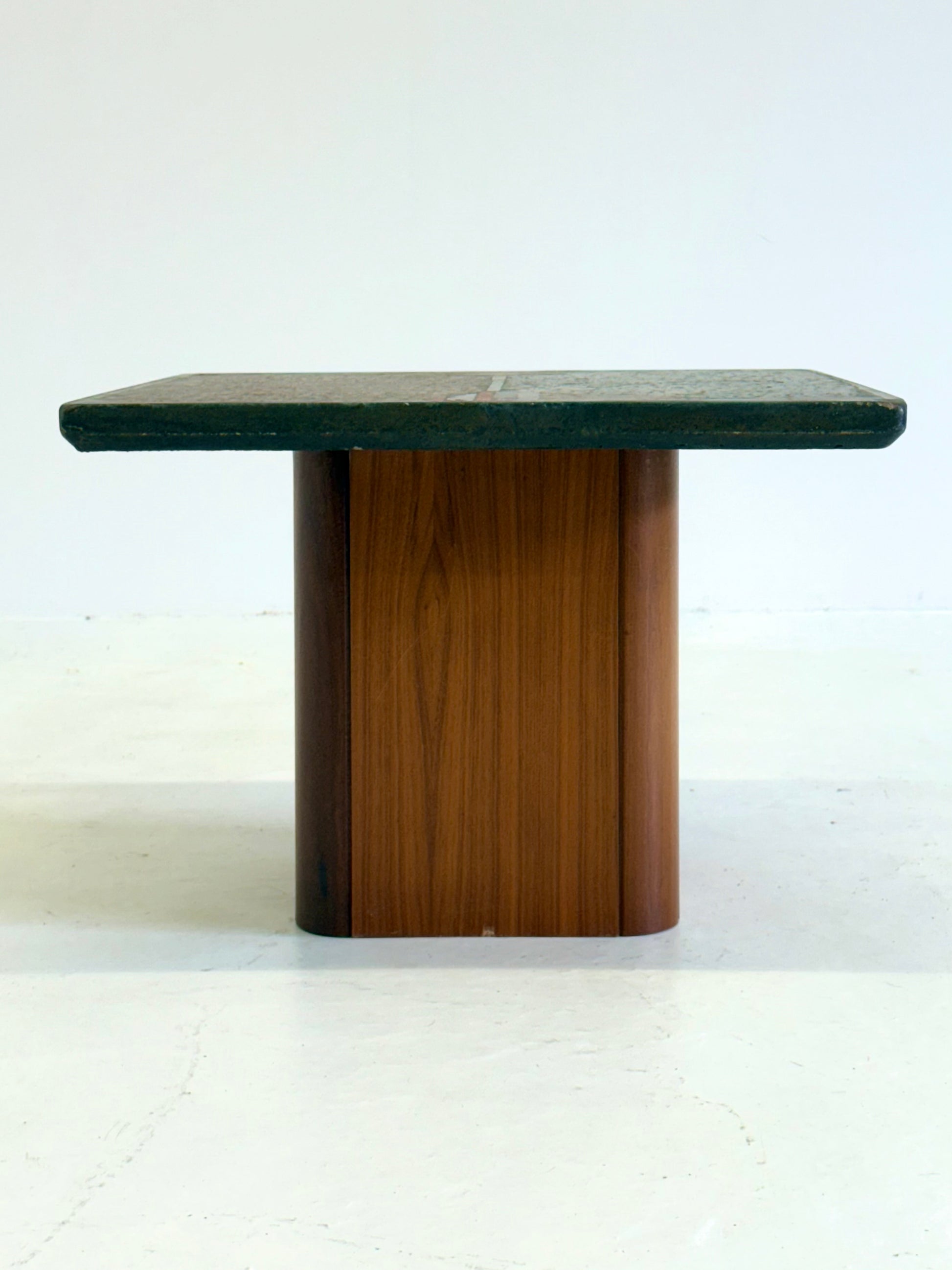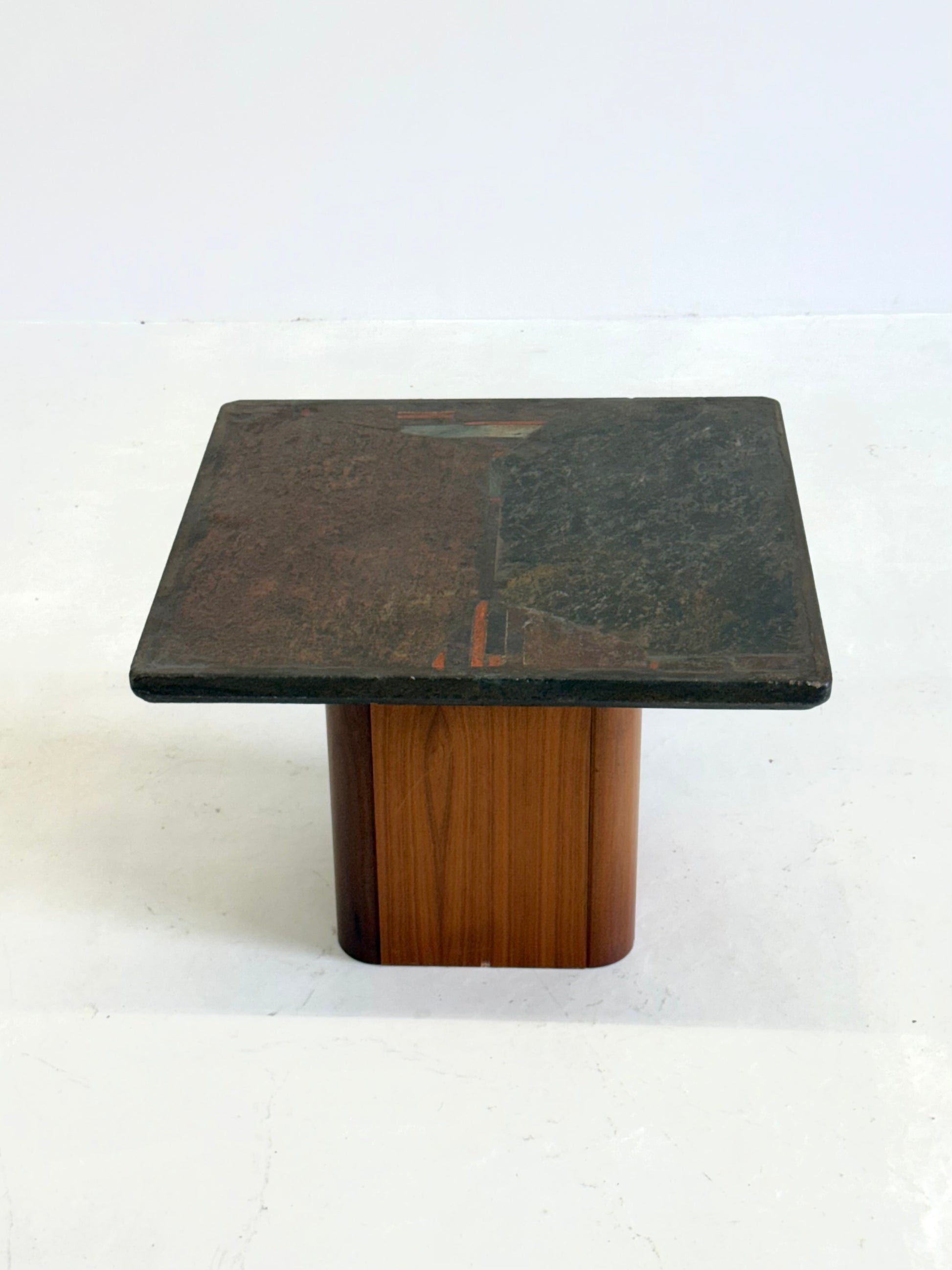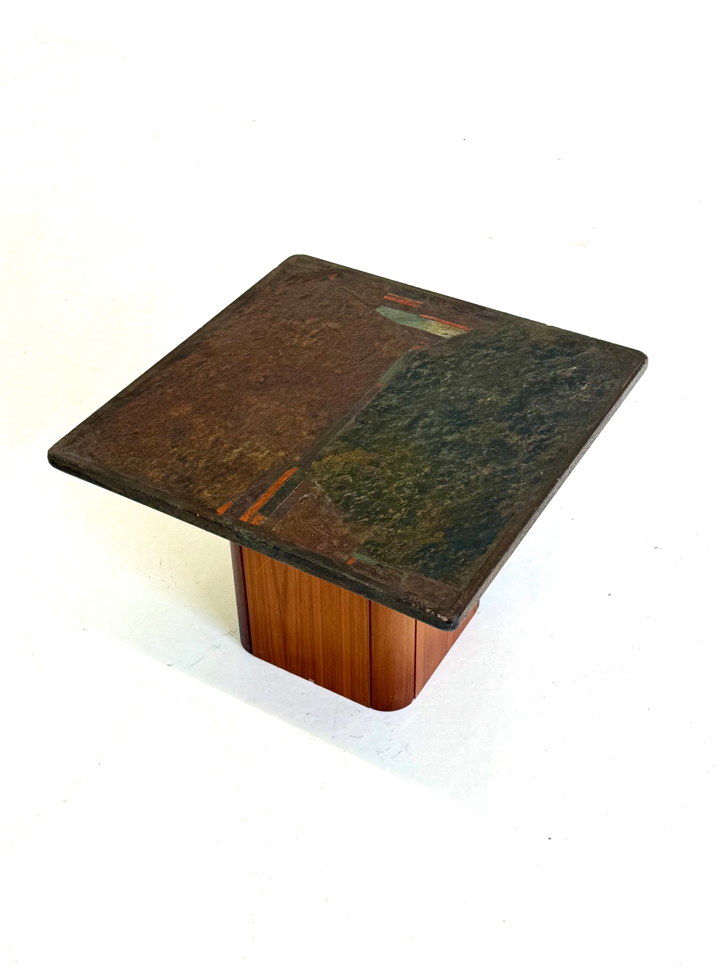 De tafel heeft een zwaar natuurstenen blad van leisteen, rustend op een massief teakhouten onderstel. Een robuust ontwerp dat perfect past binnen de brutalistische stijl.