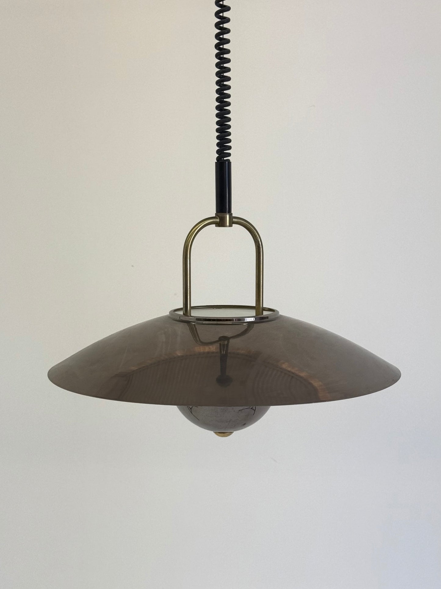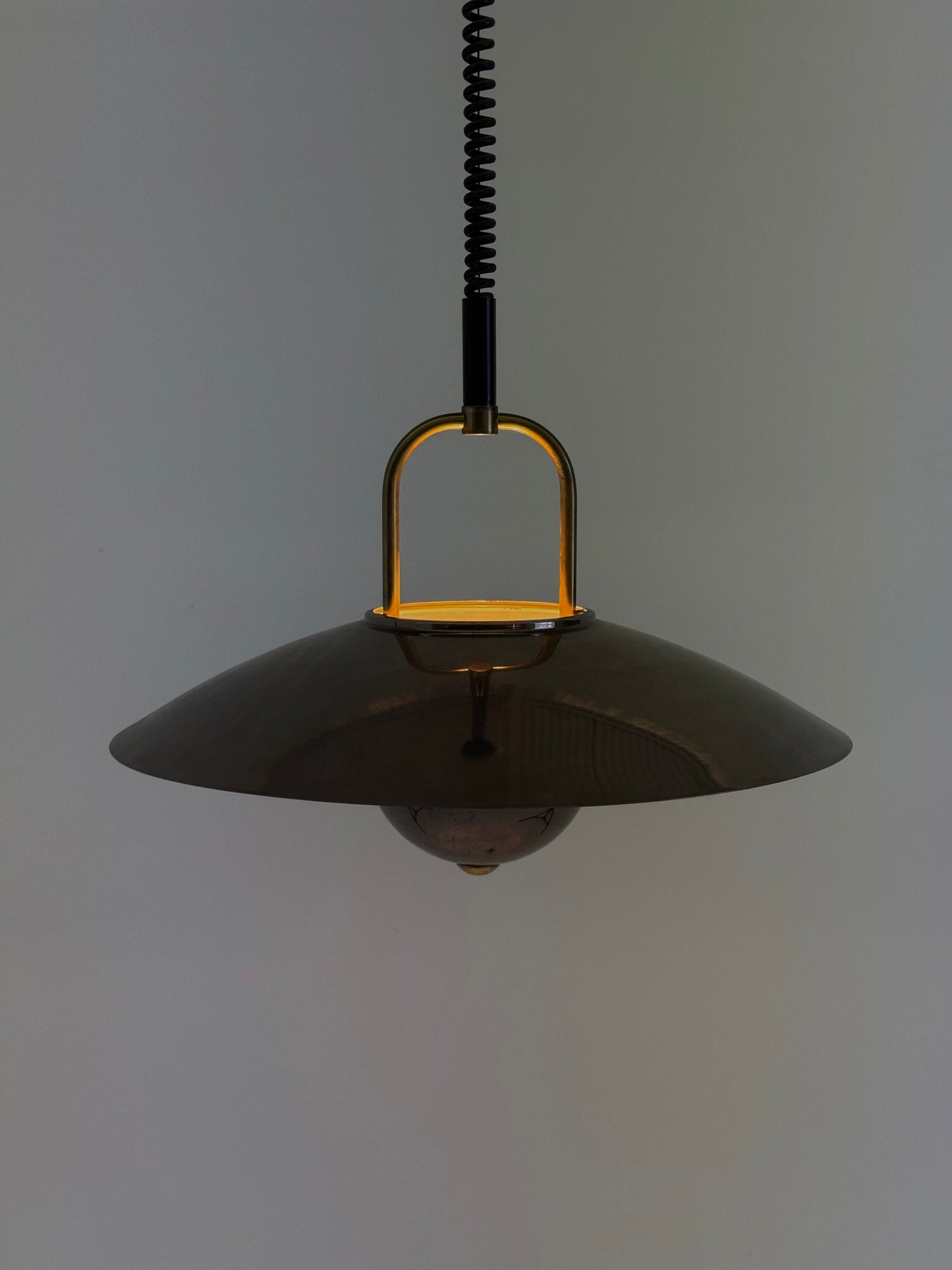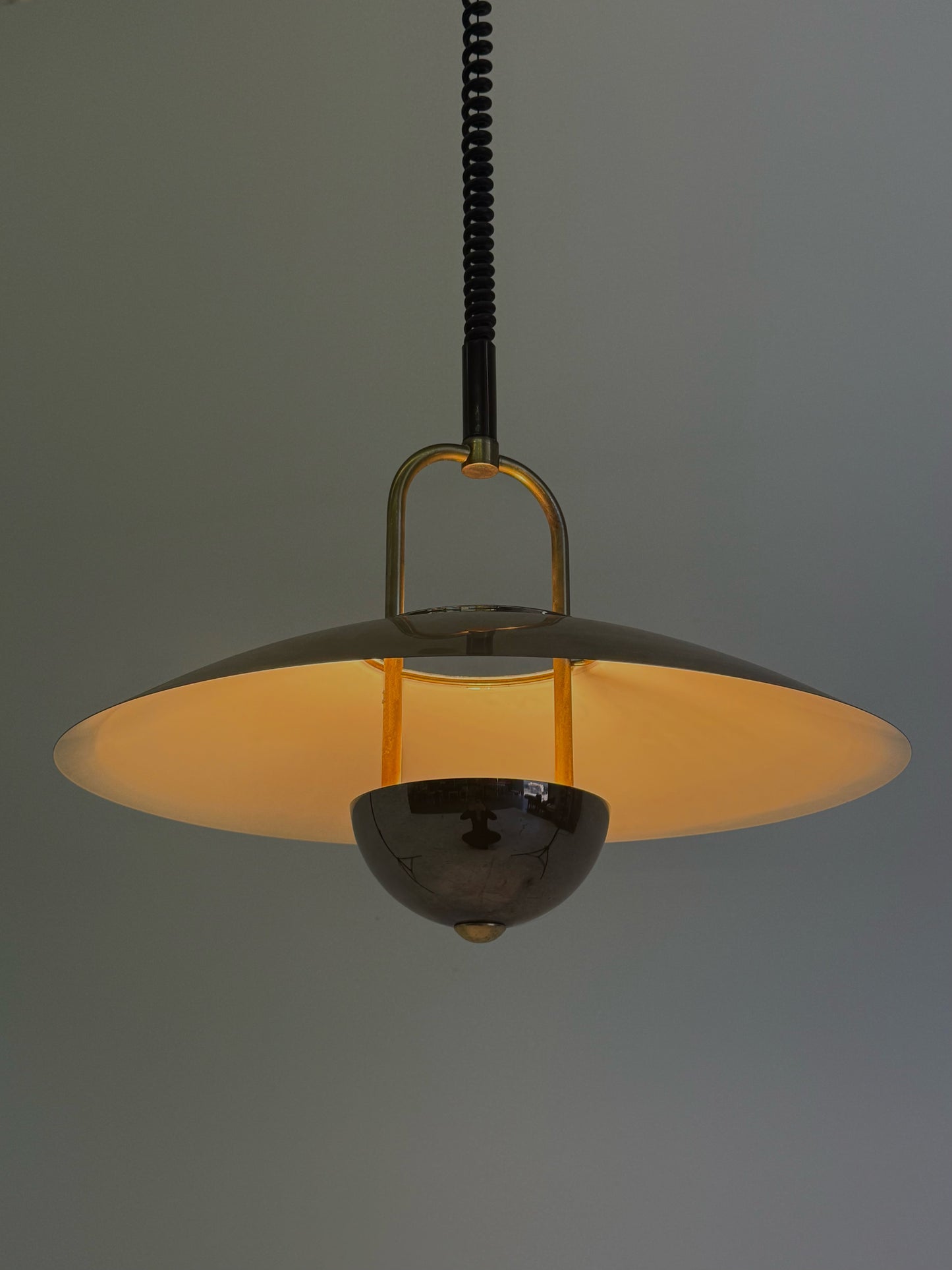 Prachtige hanglamp van het Belgische merk Massive uit de jaren 80. De lamp valt op door zijn grote, minimalistische ontwerp en het gebruik van chroom met subtiele goudkleurige accenten. Een echte eyecatcher die sfeervol en warm licht verspreidt.