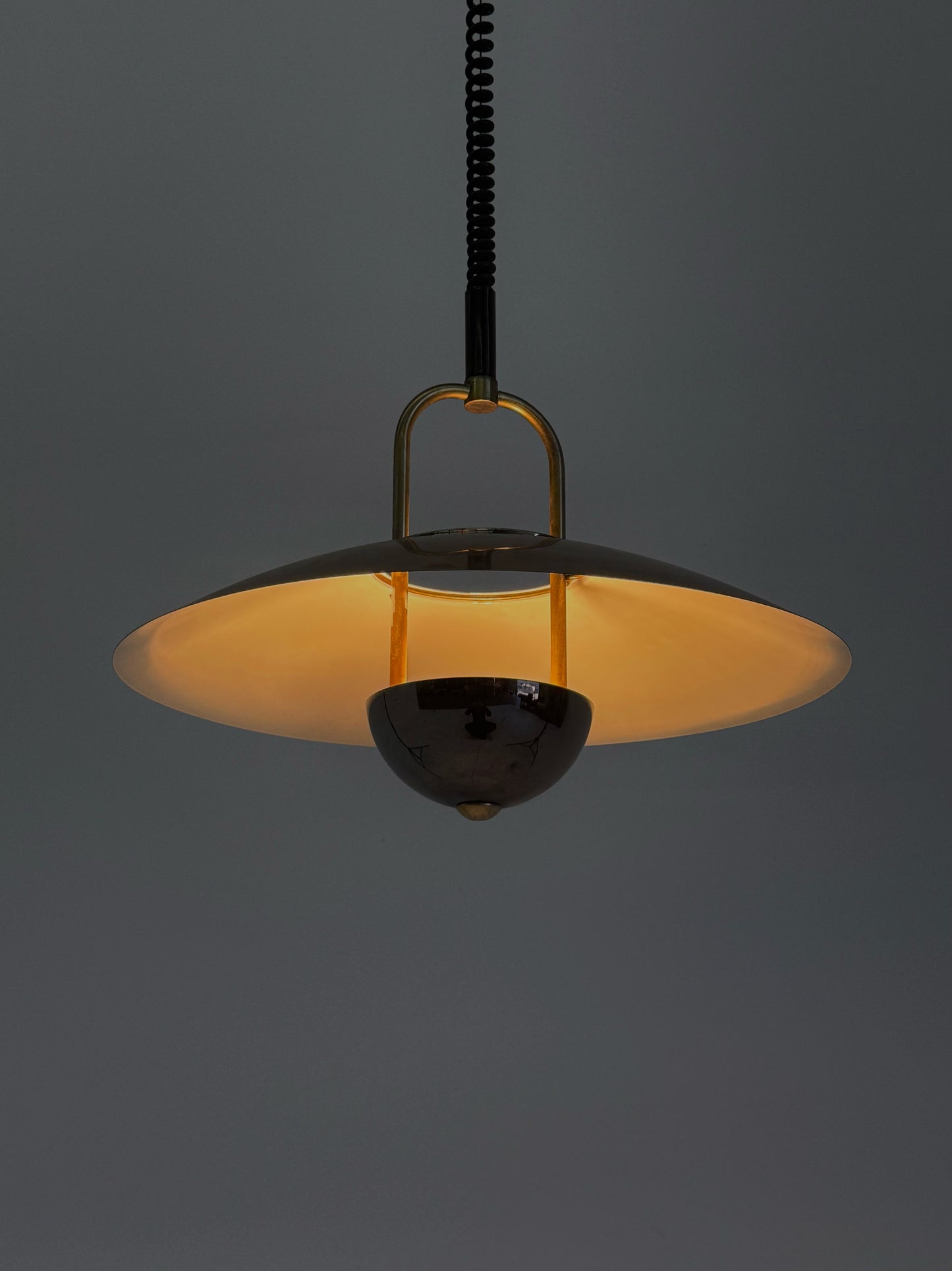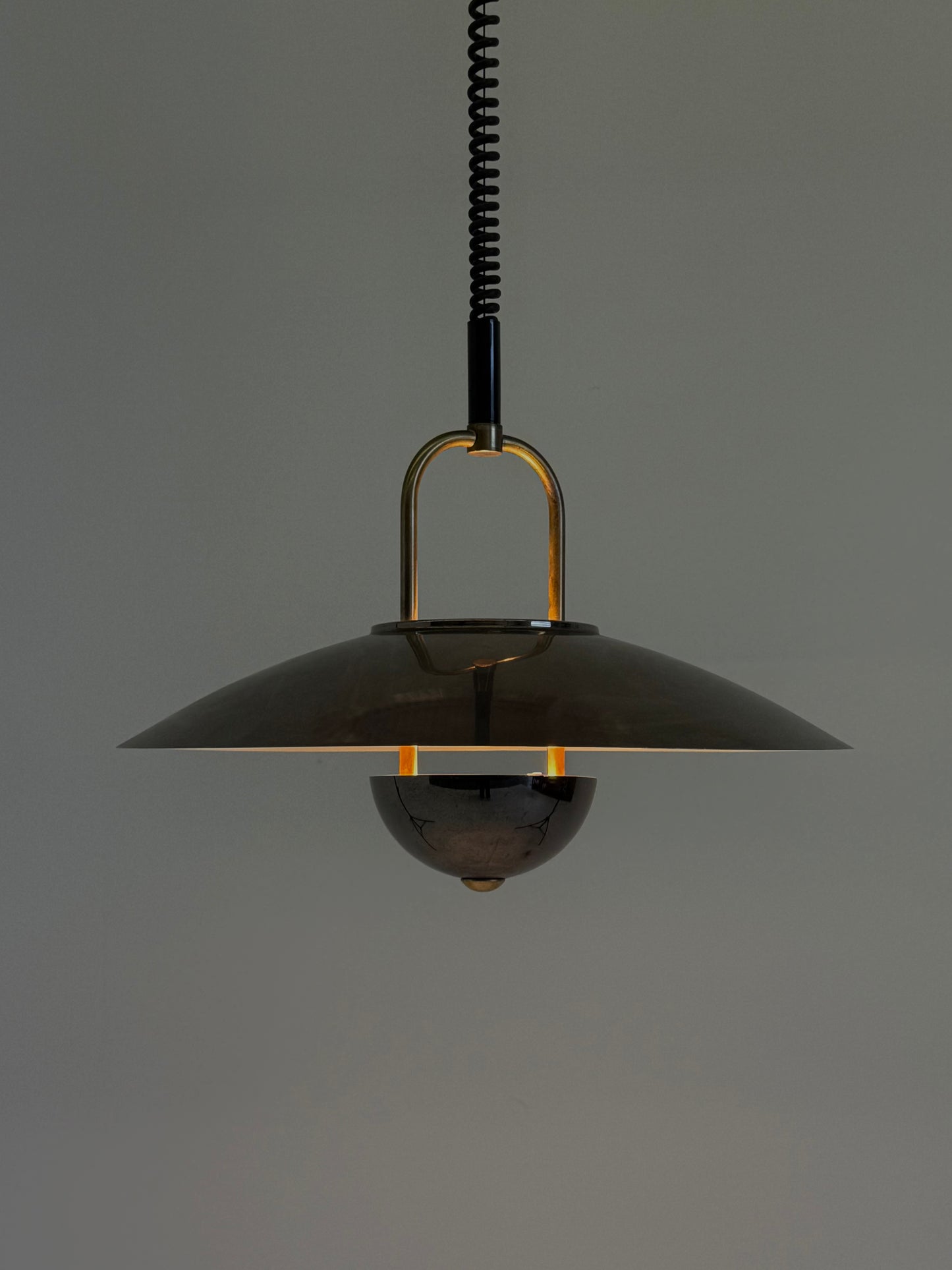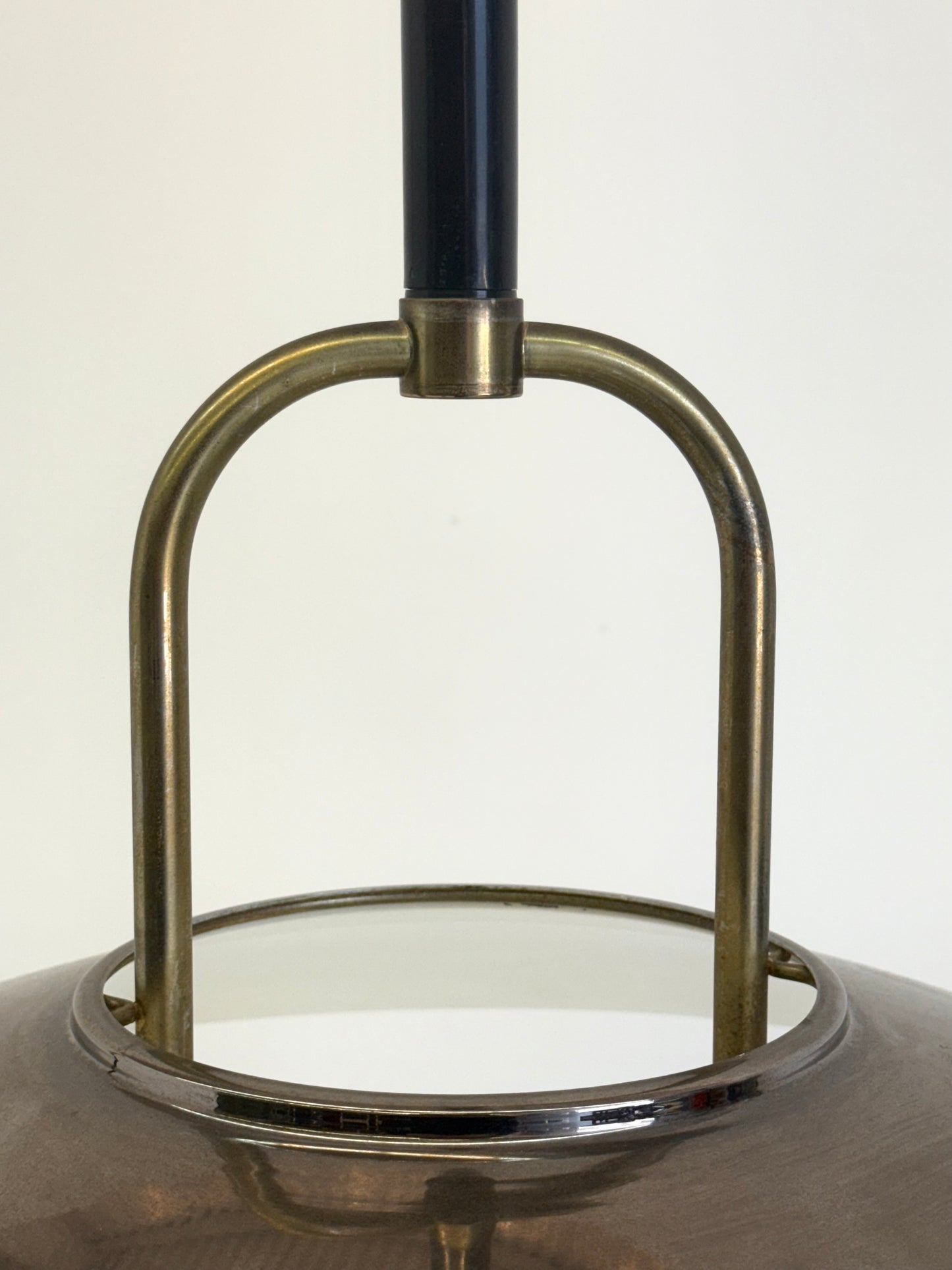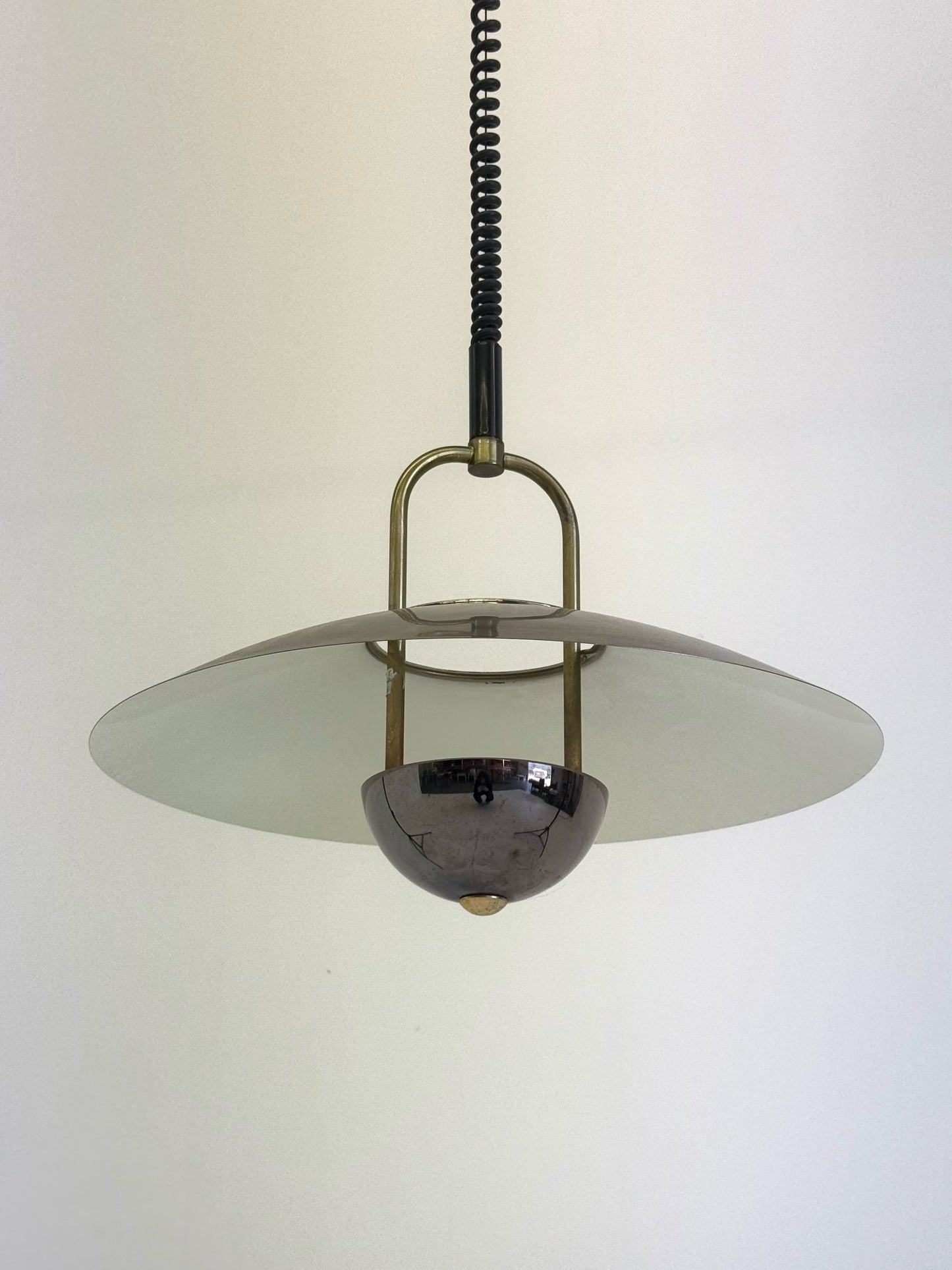 Prachtige hanglamp van het Belgische merk Massive uit de jaren 80. De lamp valt op door zijn grote, minimalistische ontwerp en het gebruik van chroom met subtiele goudkleurige accenten. Een echte eyecatcher die sfeervol en warm licht verspreidt.