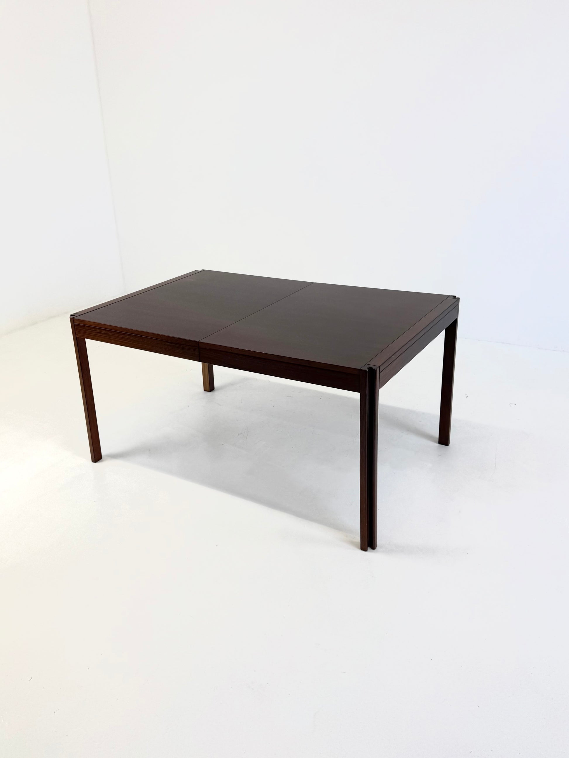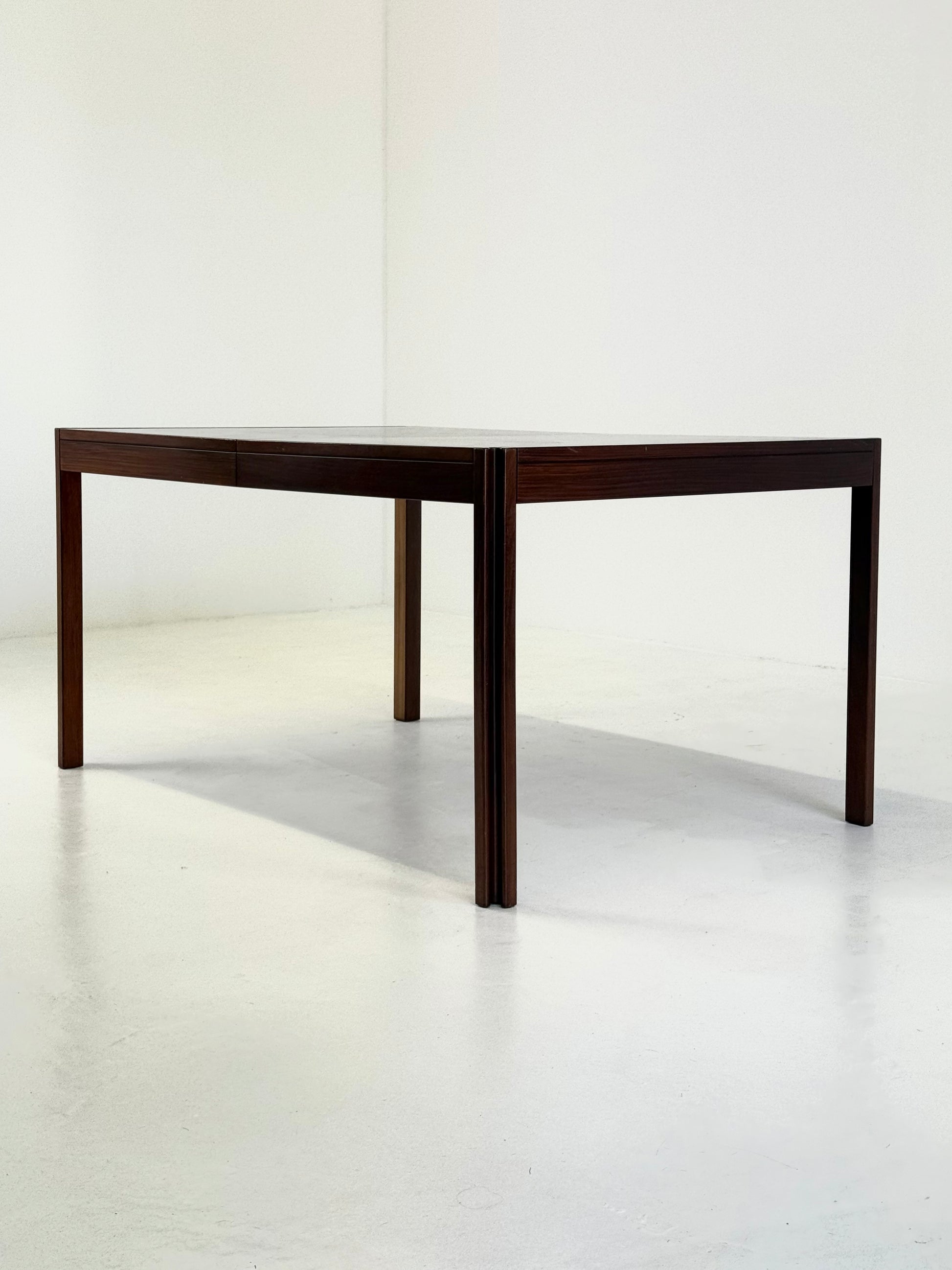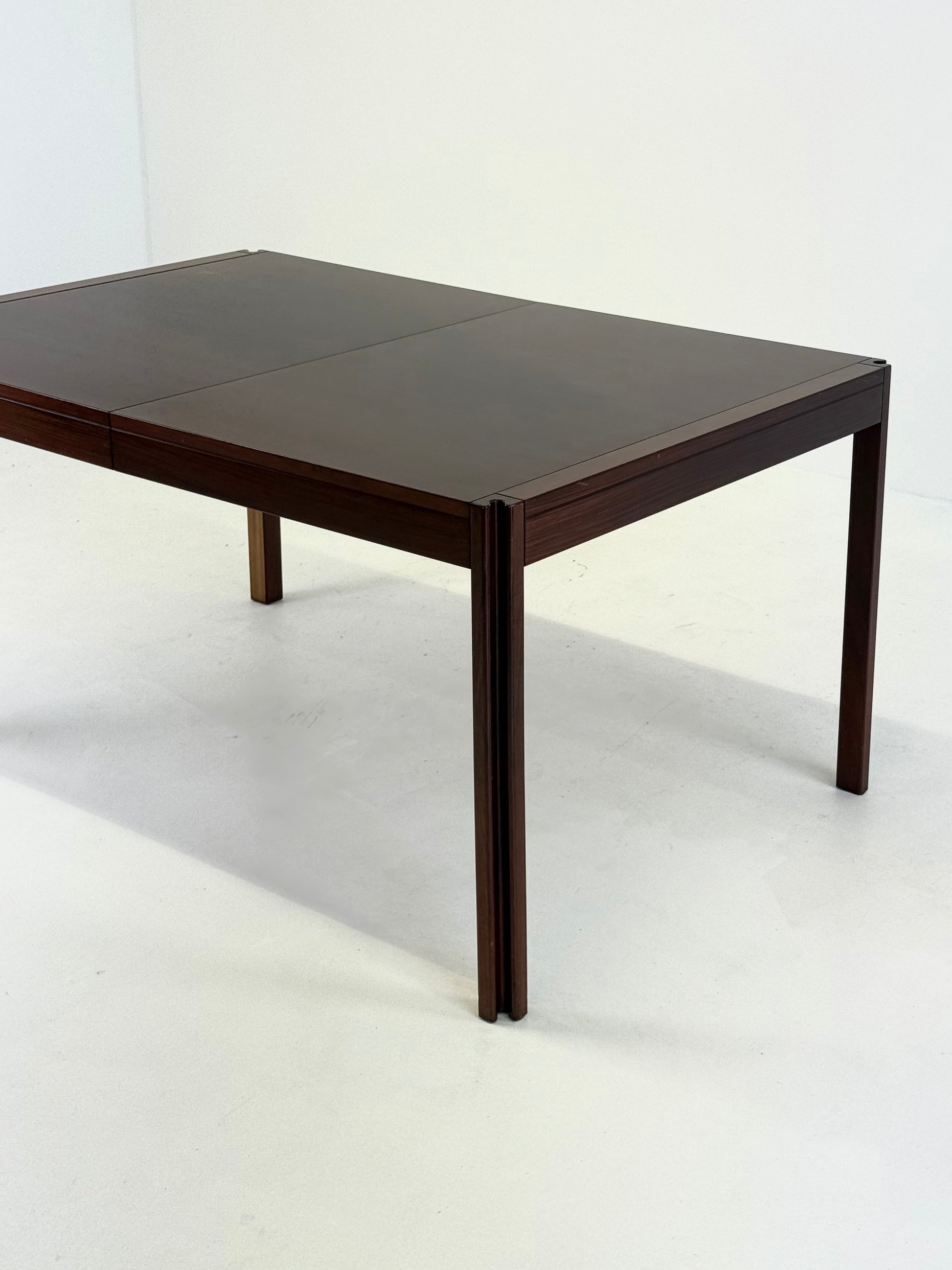 Prachtige 4D eettafel, ontworpen door de Italiaanse ontwerper Angelo Mangiarotti voor Molteni & Co in de jaren 70. De tafel is uitgevoerd in palissanderhout en herkenbaar aan de sculpturale poten, een kenmerkend detail uit Mangiarotti’s signatuurstijl.