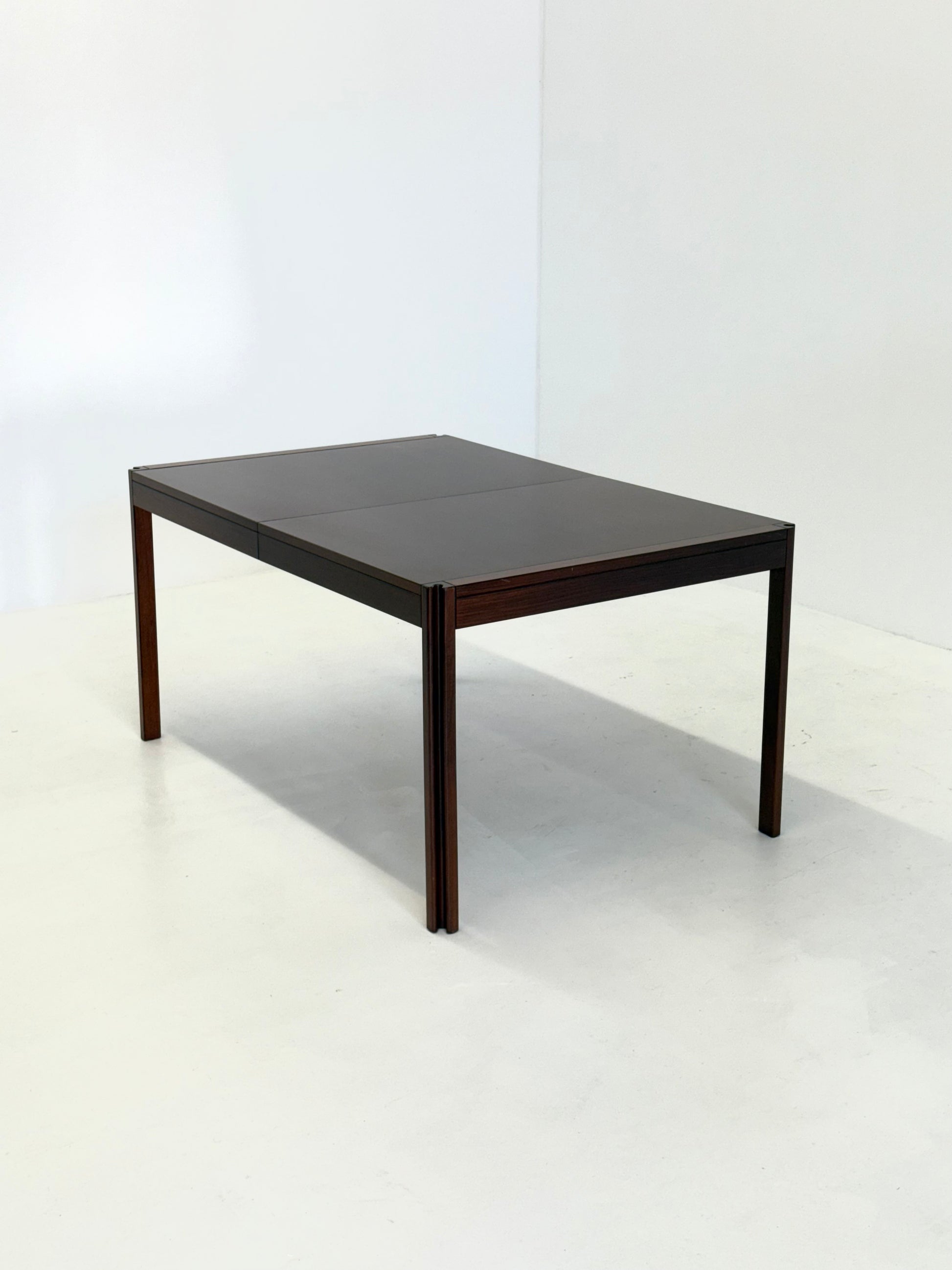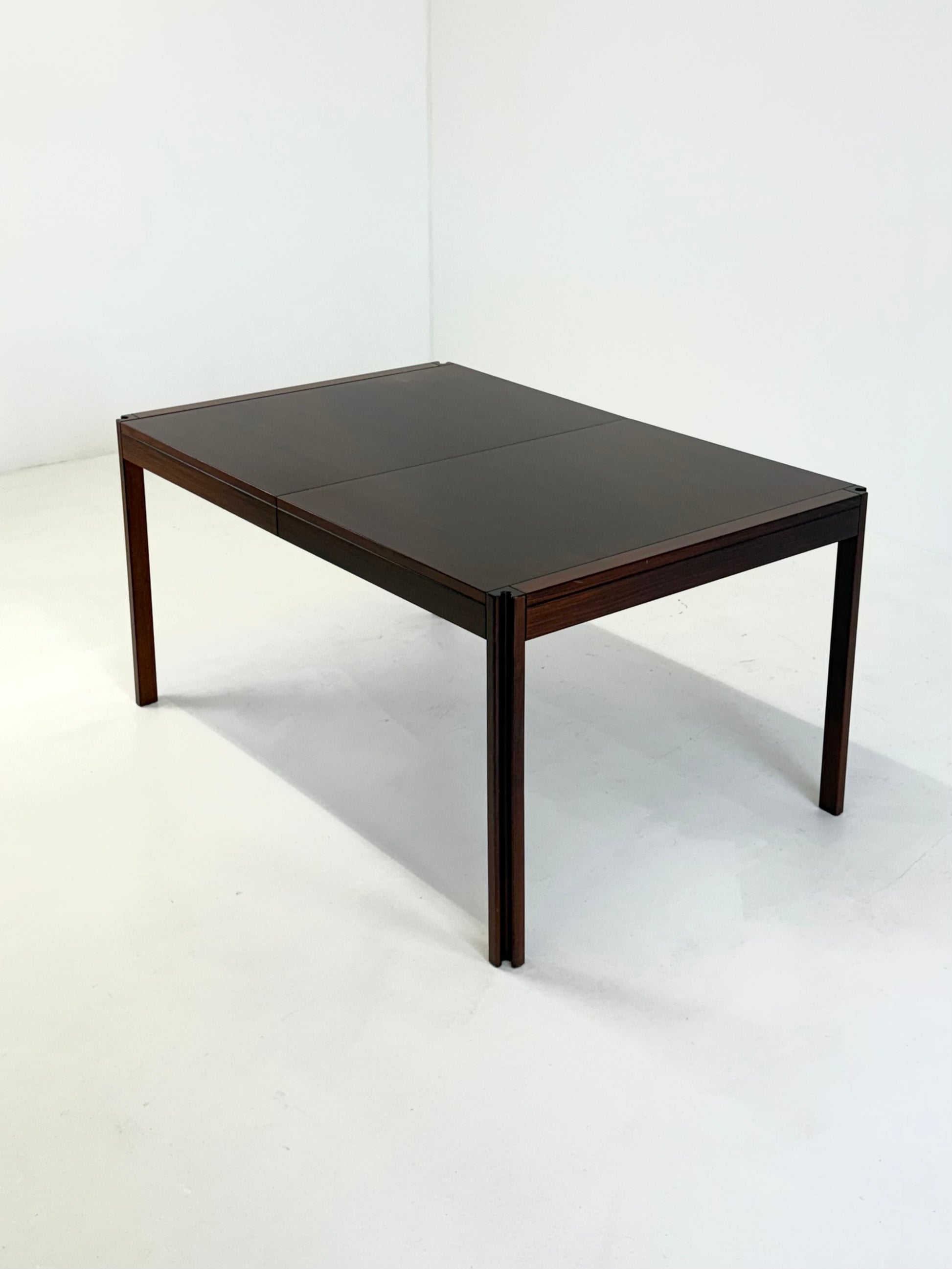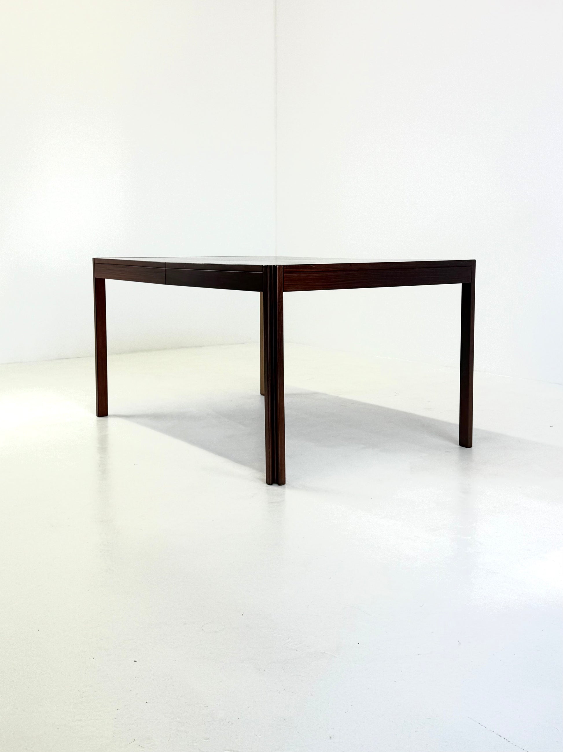 Prachtige 4D eettafel, ontworpen door de Italiaanse ontwerper Angelo Mangiarotti voor Molteni & Co in de jaren 70. De tafel is uitgevoerd in palissanderhout en herkenbaar aan de sculpturale poten, een kenmerkend detail uit Mangiarotti’s signatuurstijl.